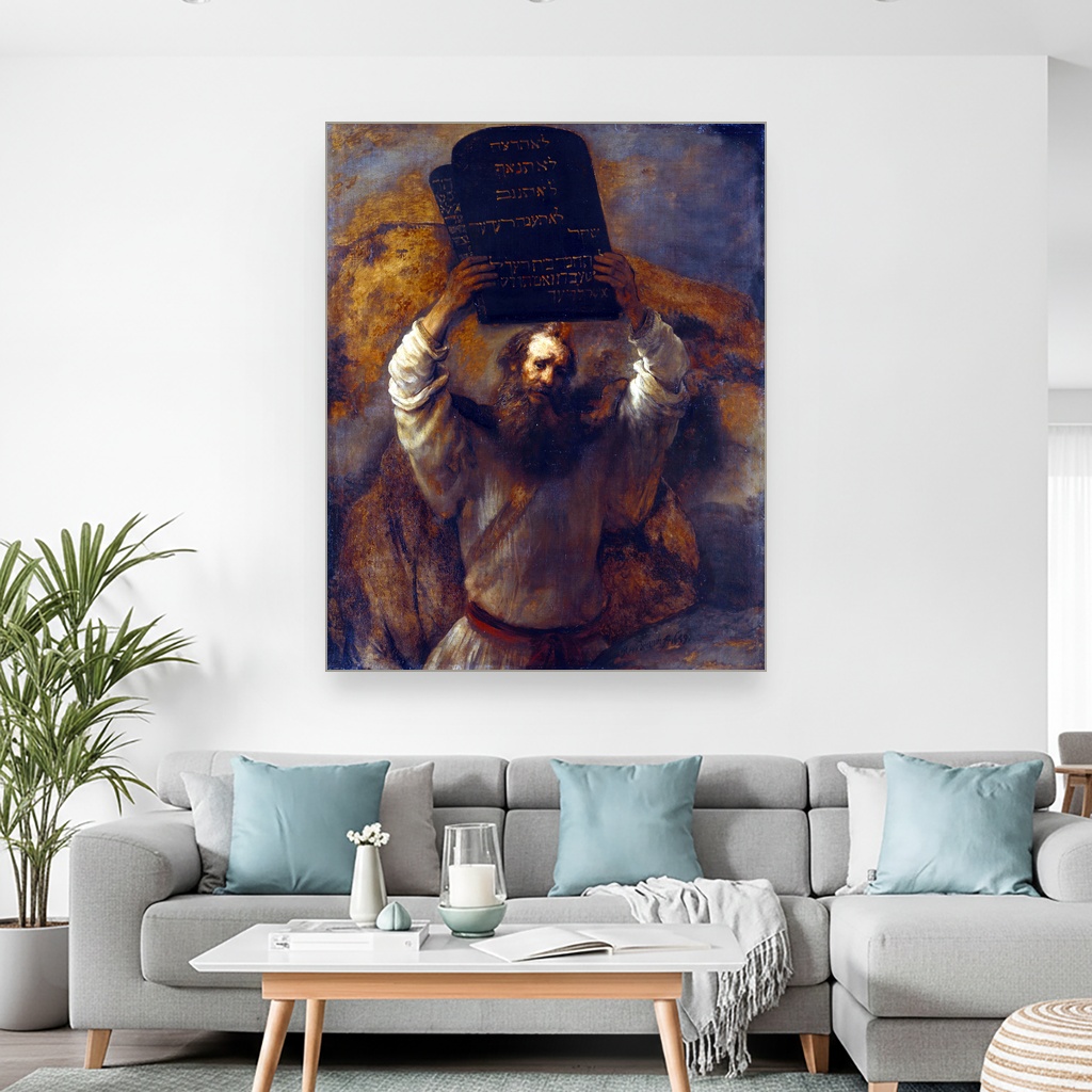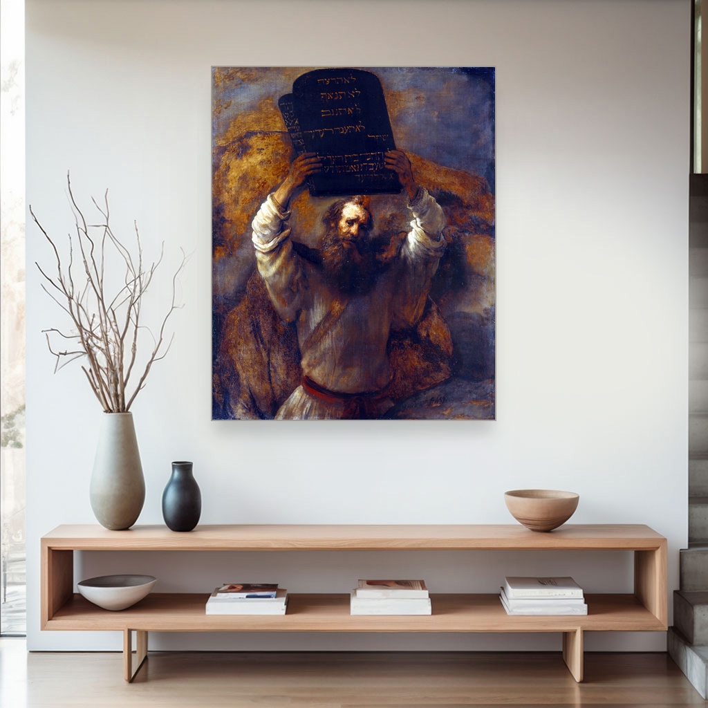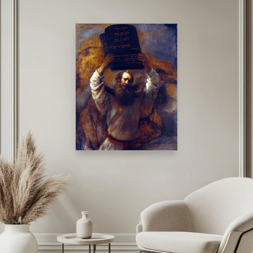 Inspirisana baroknim stilom u kojem je Rembrant stvarao, ova reprodukcija slika na platnu prikazuje Mojsija u trenutku koji simbolizuje donošenje moralnih i duhovnih smernica čovječanstvu.