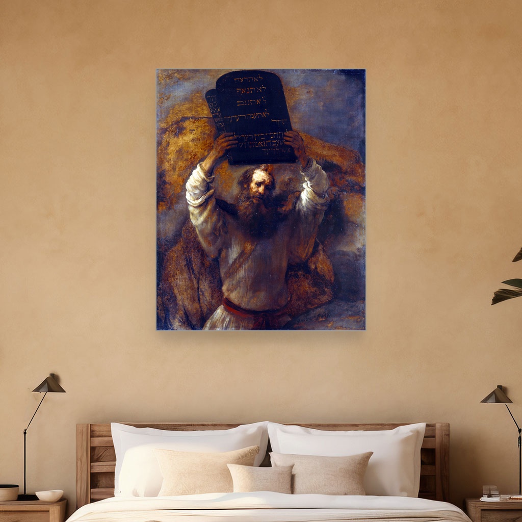 Intenzitet i moćna ekspresija Mojsija sa Deset zapovesti oživljavaju svaki kutak prostora snažnim osećajem duhovnosti i autoriteta. Ova reprodukcija na platnu savršeno će se uklopiti u dnevnu sobu ili radni prostor gde tražite inspiraciju i smirenost. Vernost detaljima i dubina Rembrantovog stila čine je umetničkim središtem koje budi poštovanje i razmišljanje.