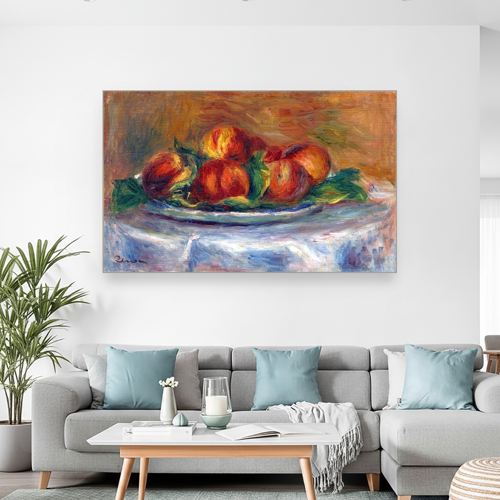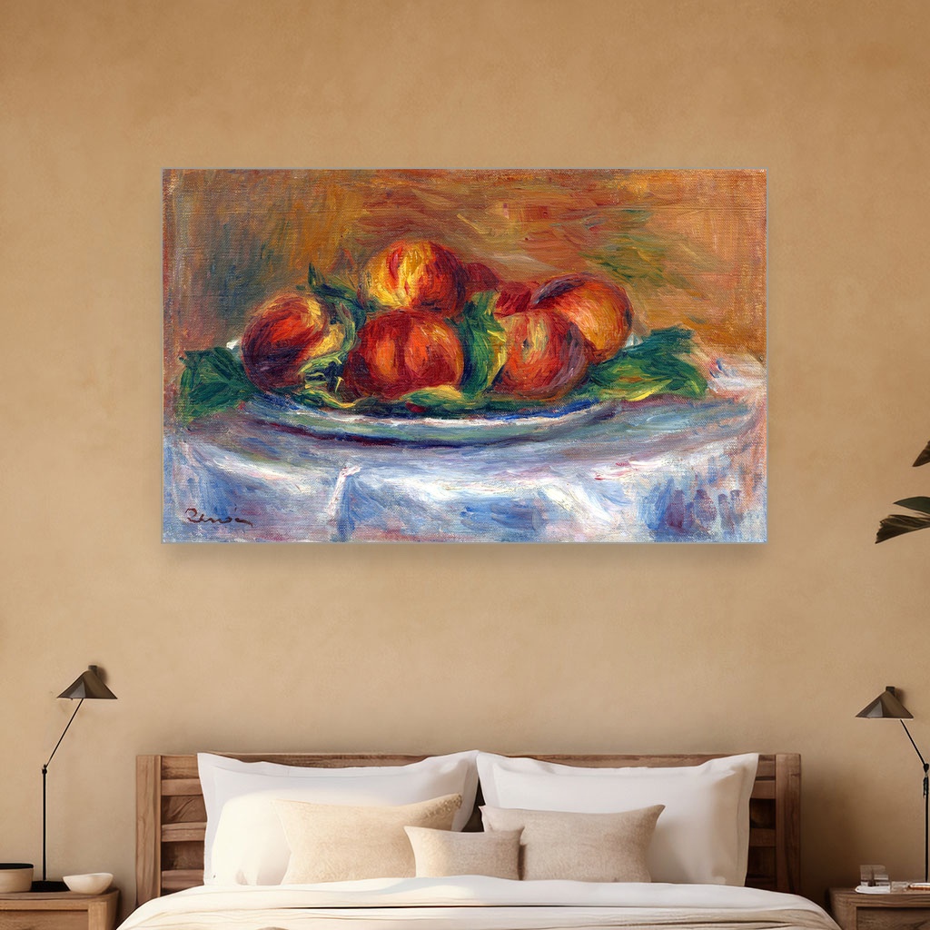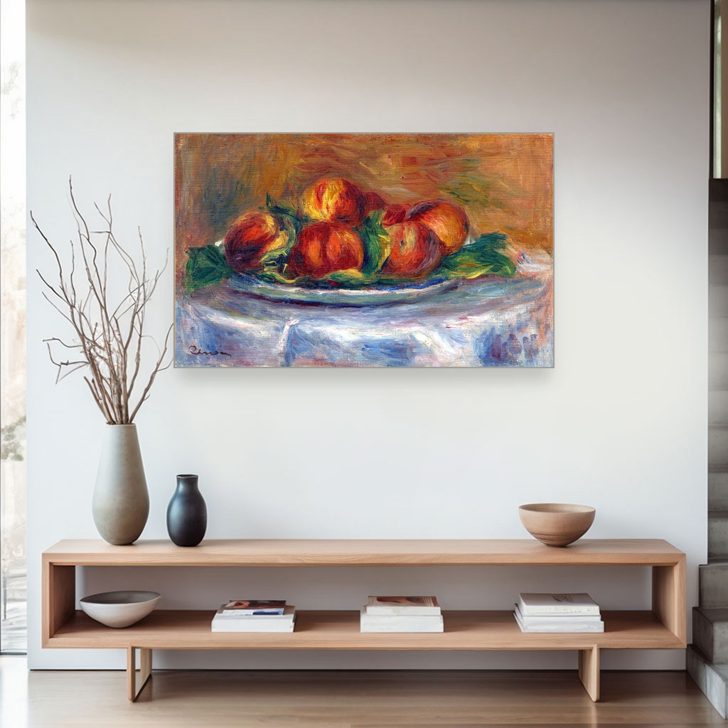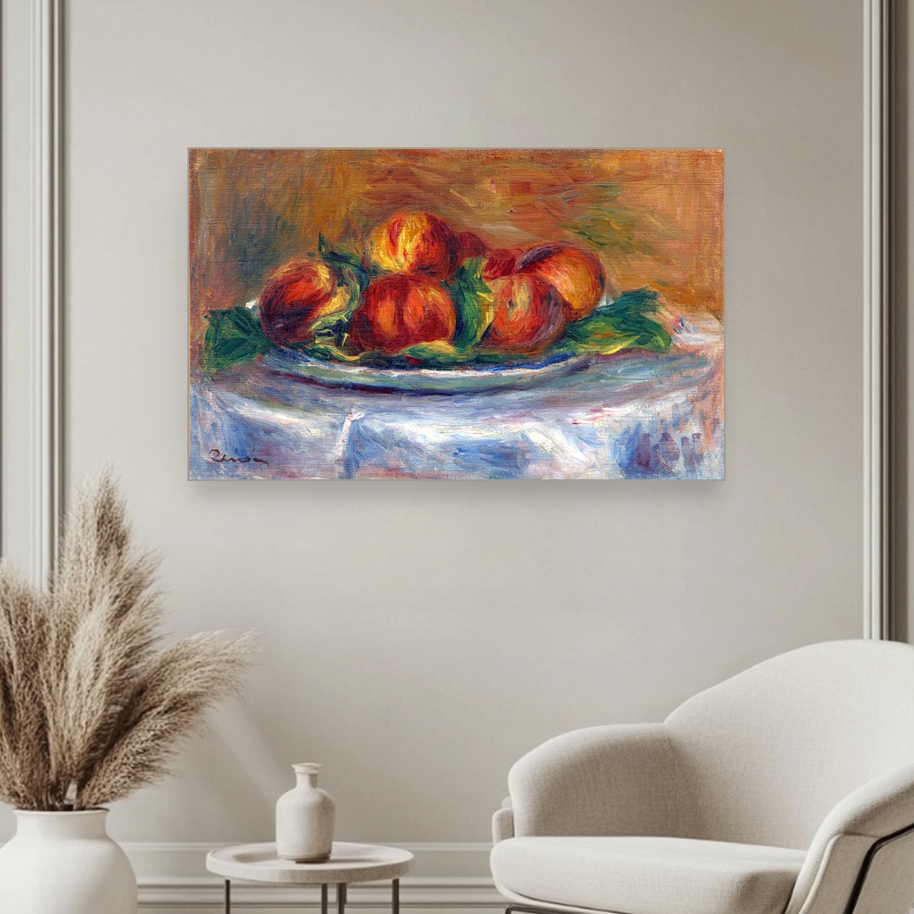 Breskve na tanjiru, Pierre-Auguste Renoir, Peaches on a Plate, slika na platnu je delo koje nas nežno uvodi u svet impresionizma, osvetljavajući lepotu svakodnevnog prizora kroz tople tonove i mekoću poteza četkice.