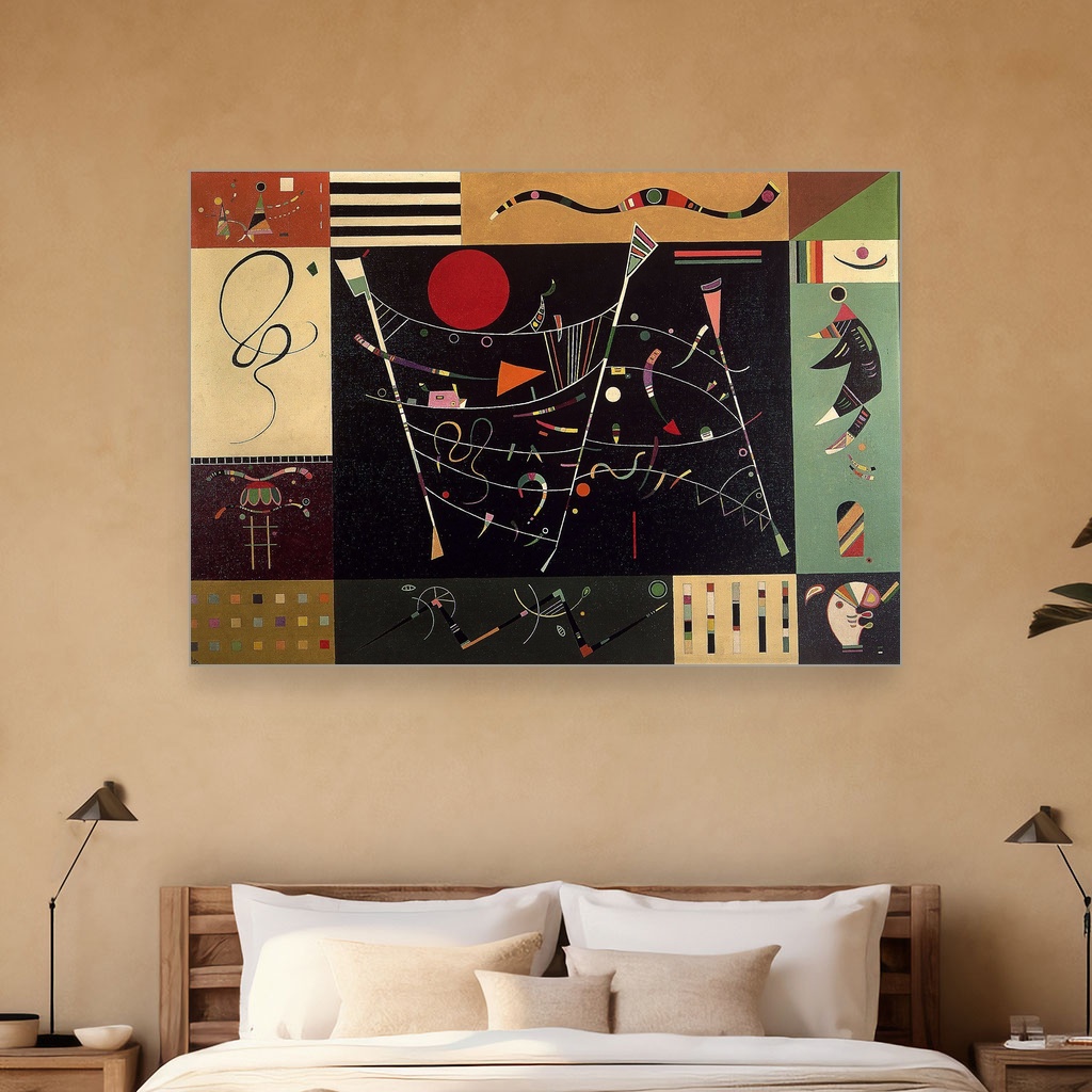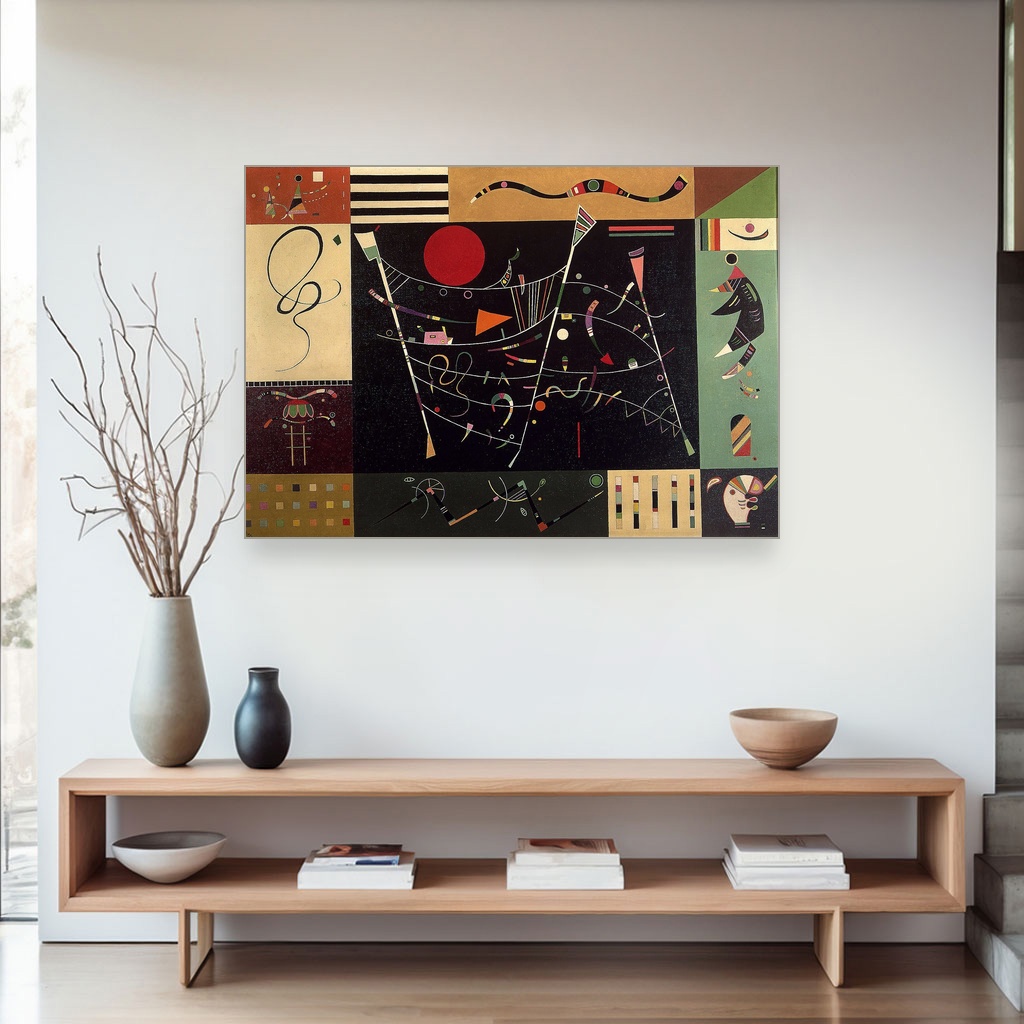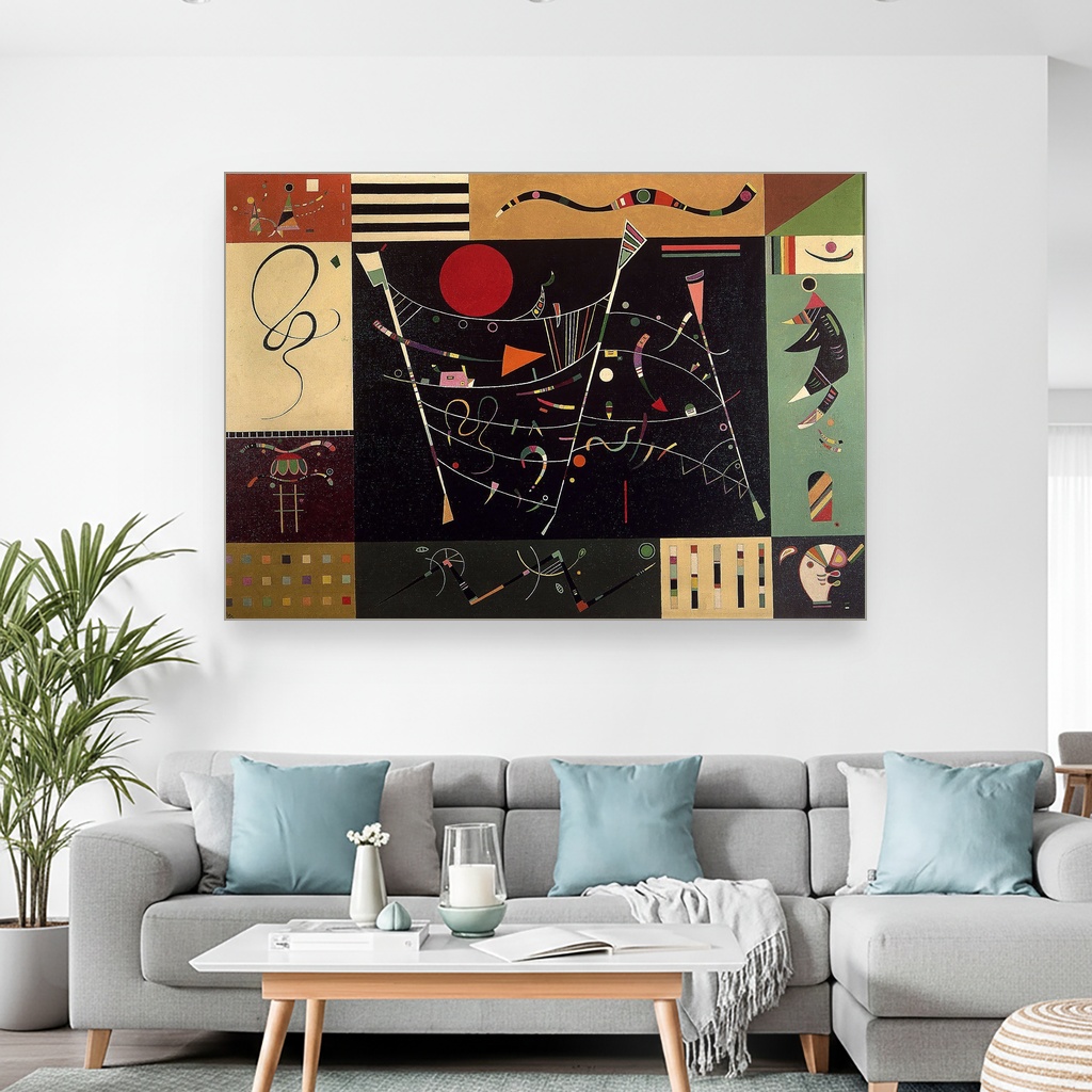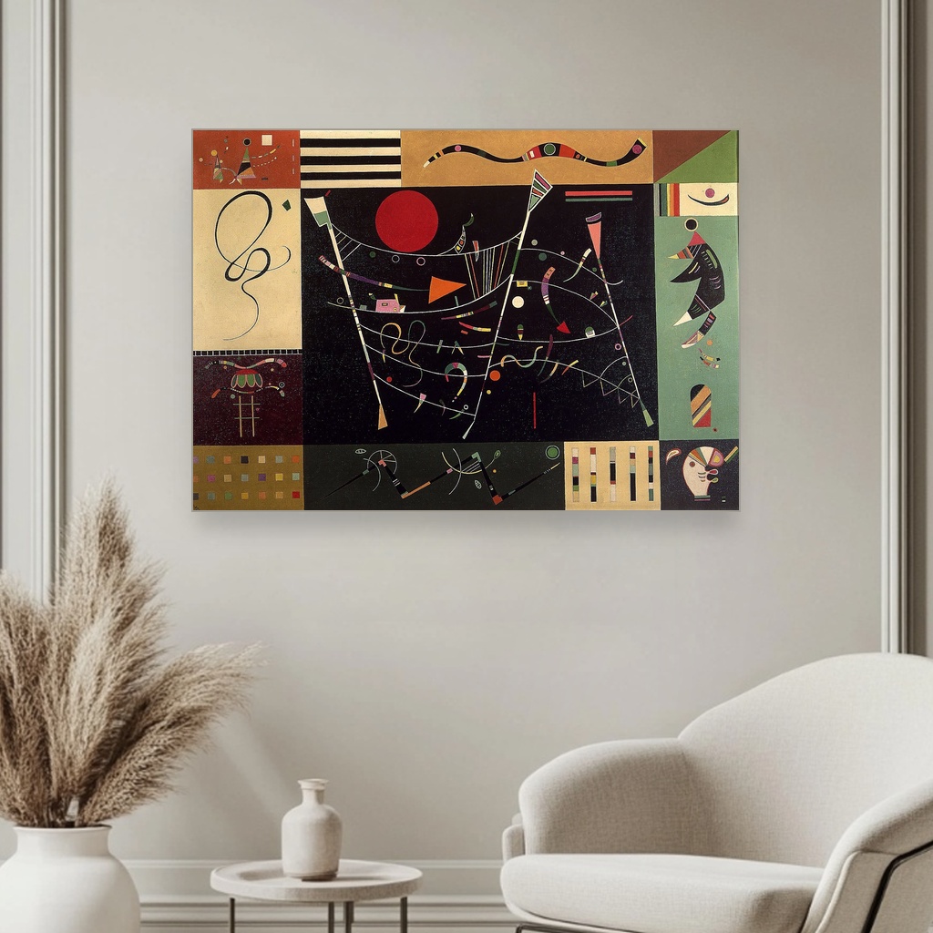 Kandinsky, jedan od pionira apstraktne umetnosti, kroz ovu kompoziciju istražuje harmoniju oblika i boja, stvarajući vizuelni dijalog koji osvaja pažnju svakog posmatrača.