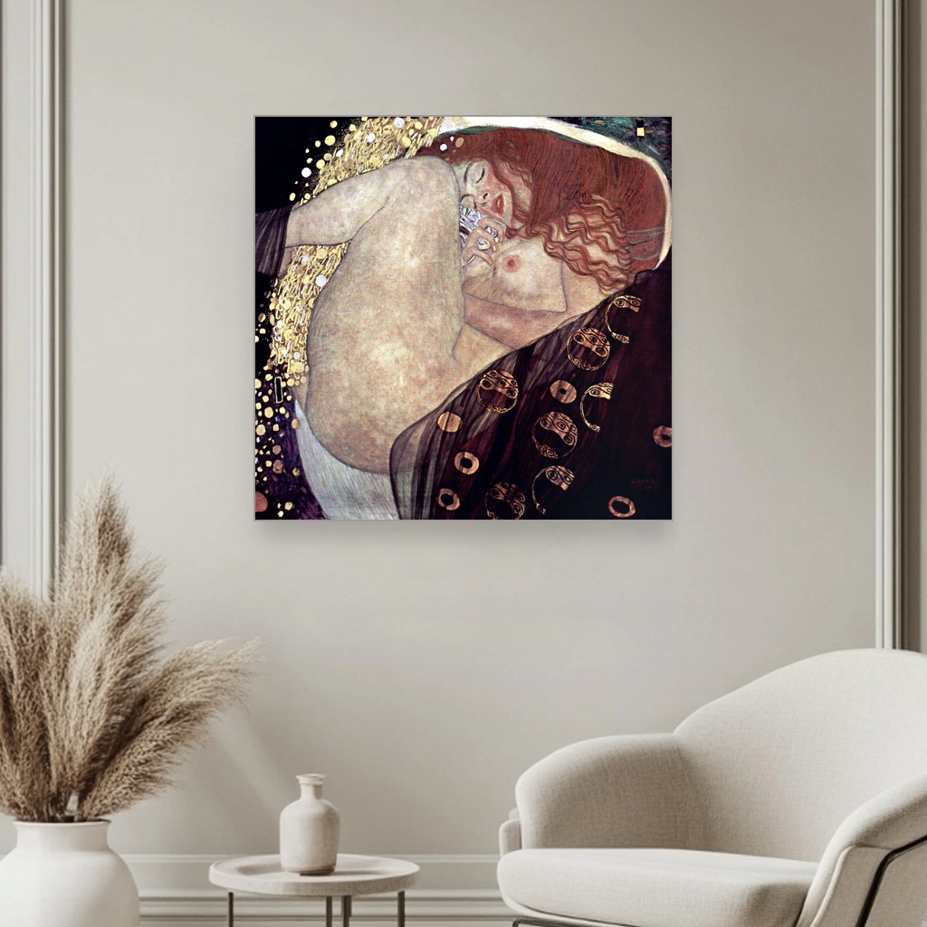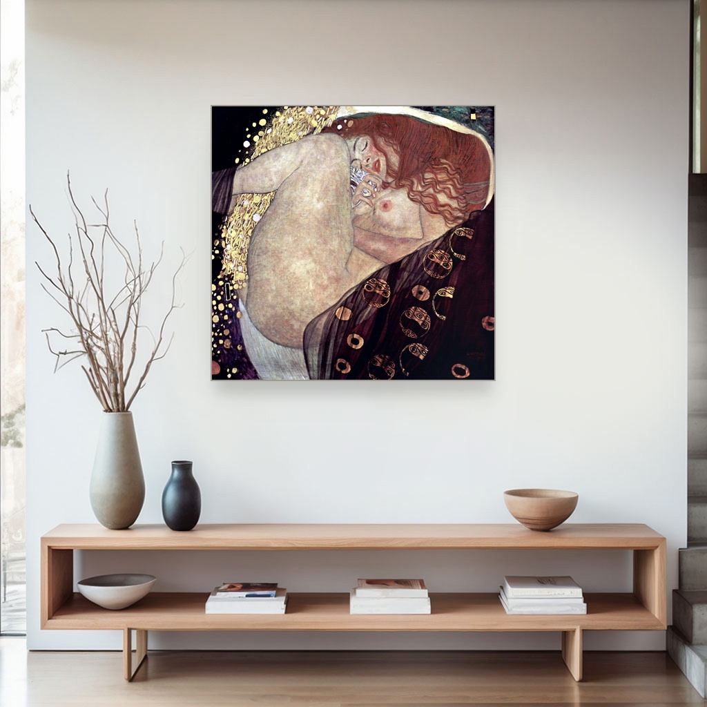 Kompozicija je sažeta i uravnotežena, a kvadratna orijentacija dodatno ističe fokus na figuri Danae, čineći reprodukciju savršenim primerom muzejske štampe na platnu muzejskog kvaliteta.