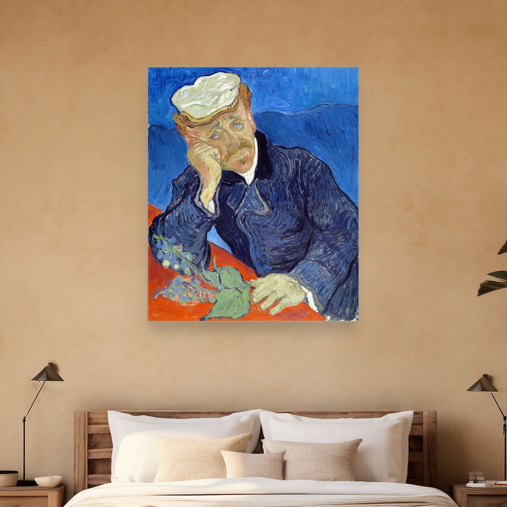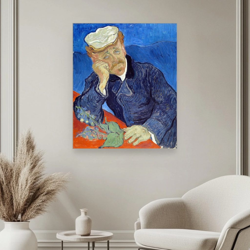 Canvas slika prikazuje doktora Gašea sa nežnim, melanholičnim izrazom koji odražava i brigu i razumijevanje.