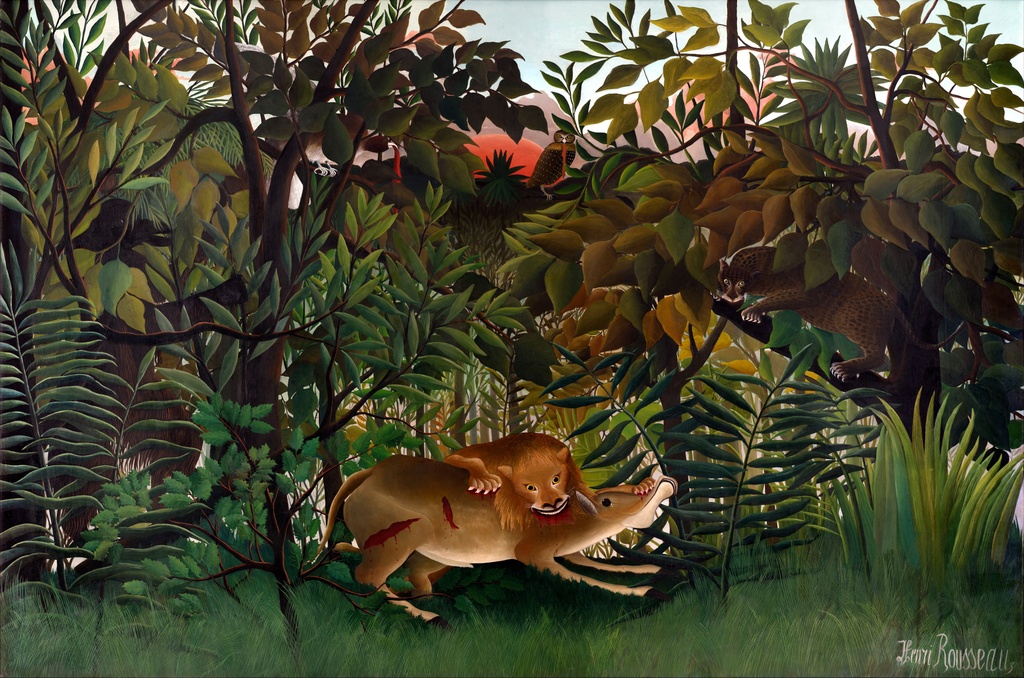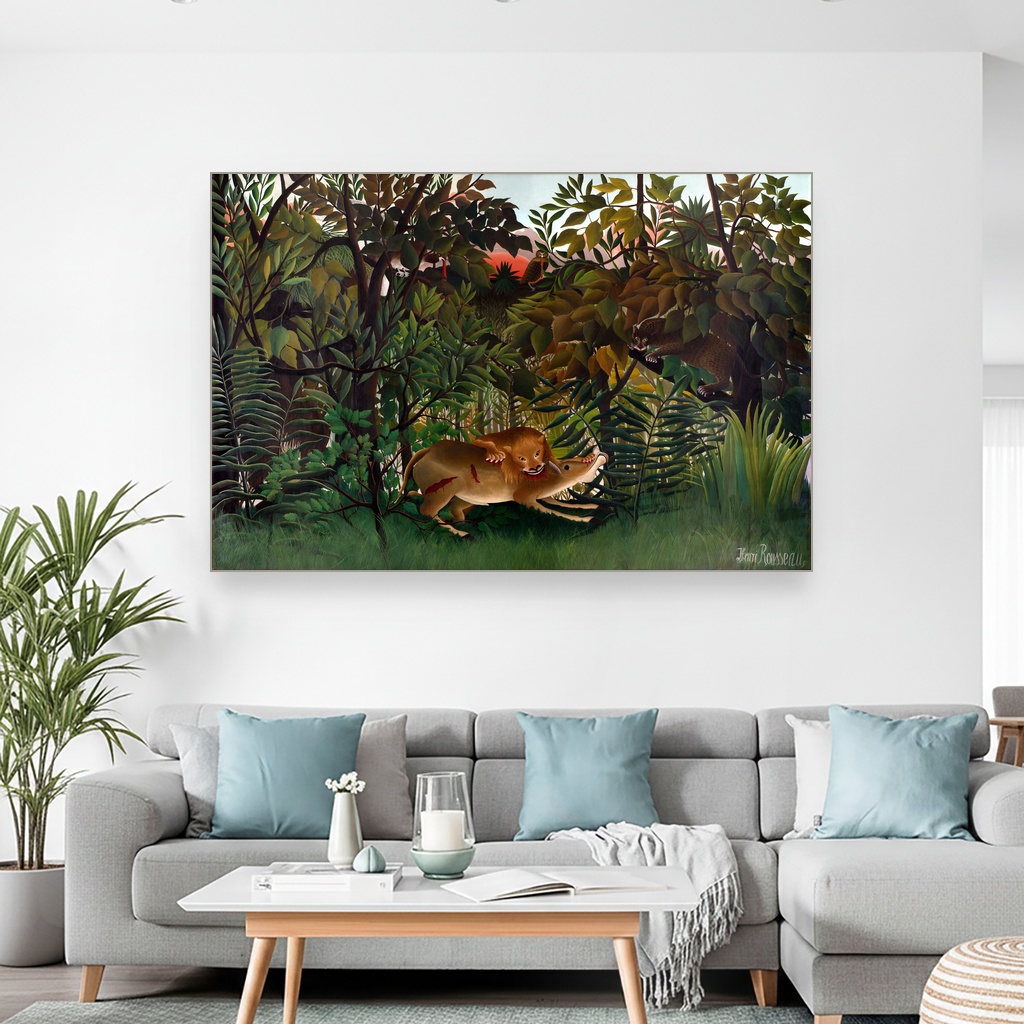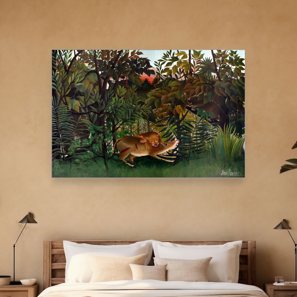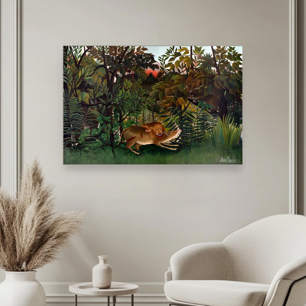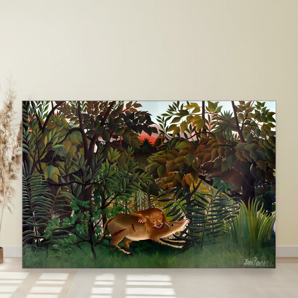 Divlja energija i uzbuđenje momenta zarobljeni su u svakom potezu kista Henrija Rusoa, donoseći prirodu u njenoj najnetaknutoj i najintenzivnijoj formi. Ova slika savršeno će upotpuniti dnevni boravak ili kabinet gde vlada strast prema umetnosti i prirodnim motivima. Reprodukcija dela koje nosi magiju originala, idealna je za one koji žele da unesu dozu avanture i divljine u svoj prostor.