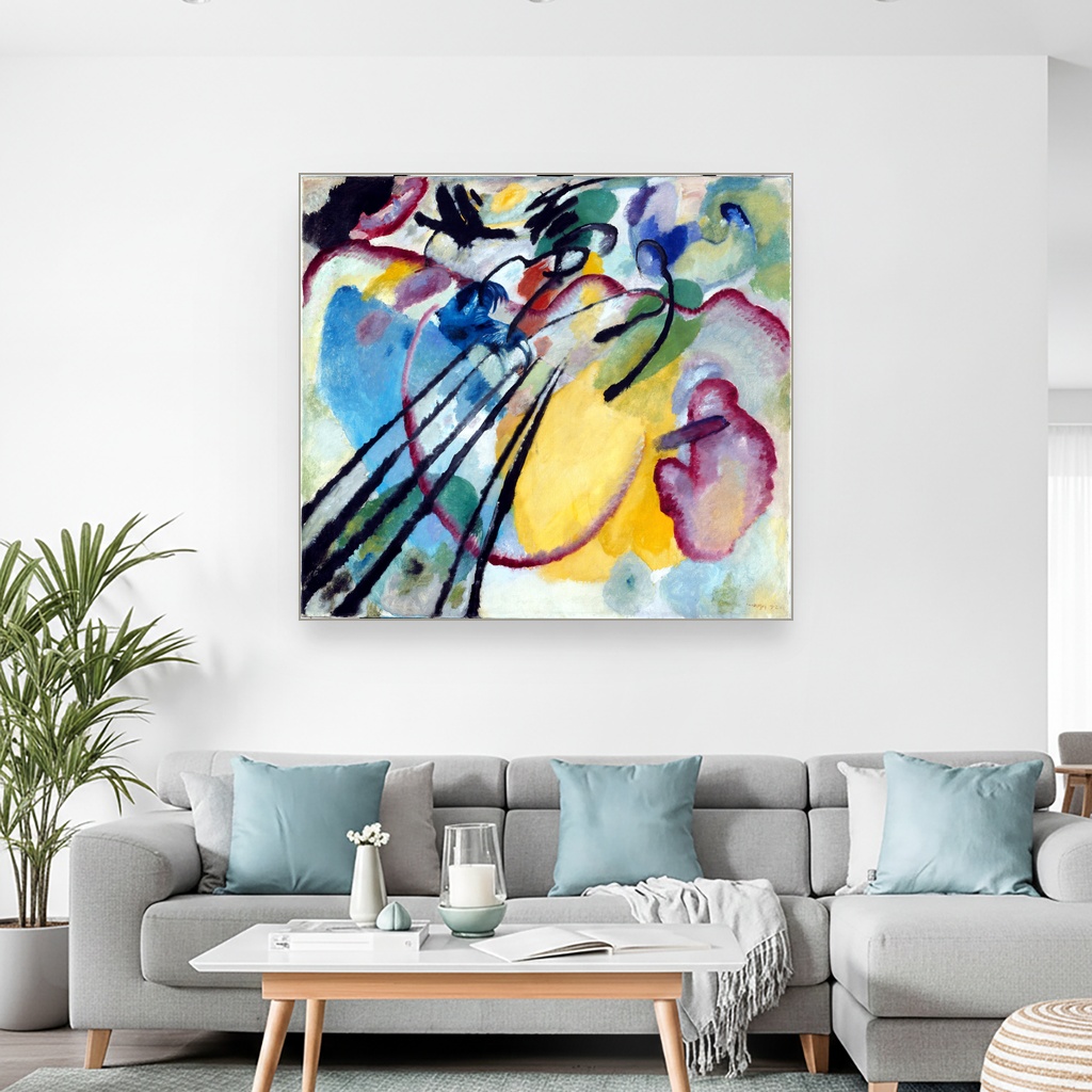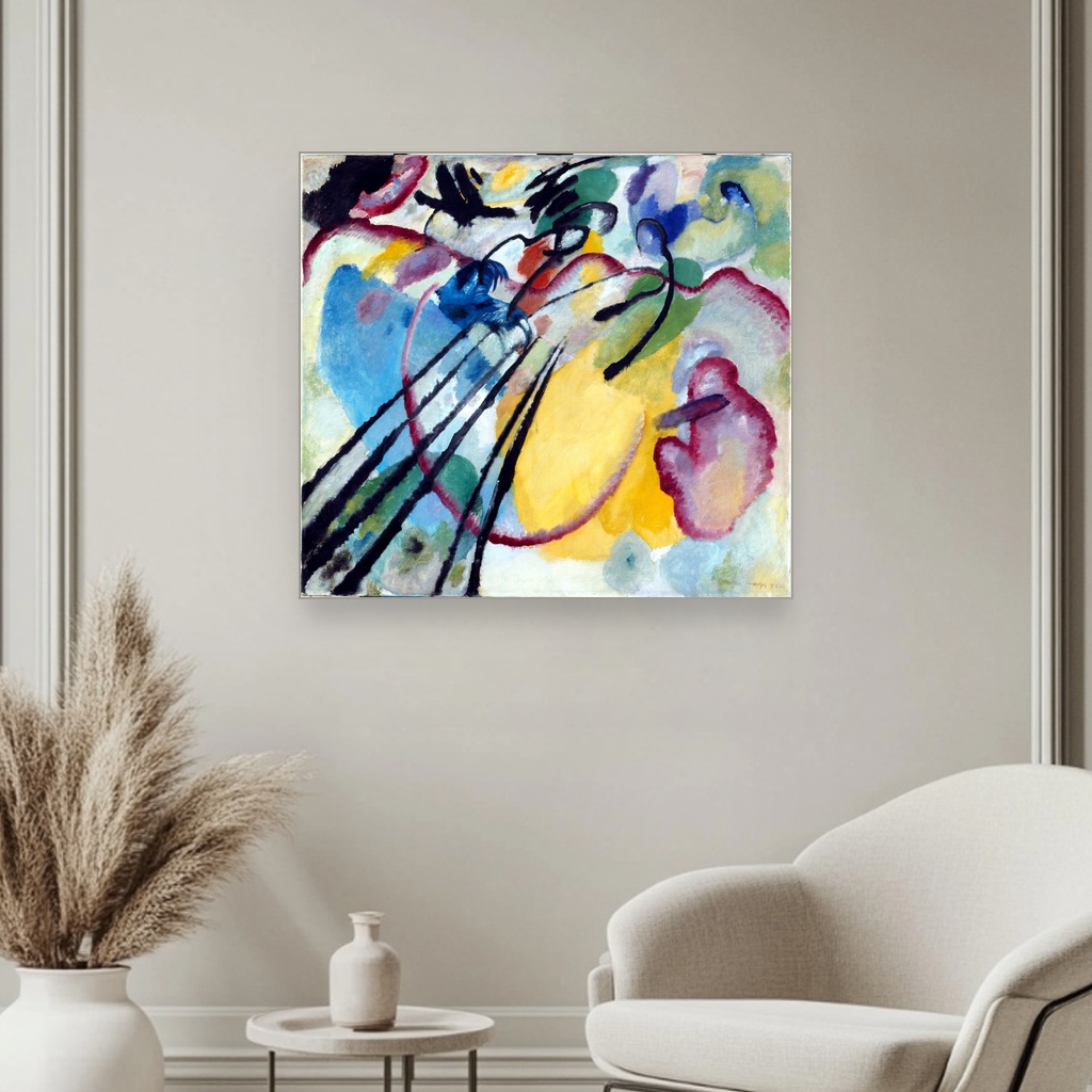 Verna reprodukcija originalnog dela omogućava da svaki detalj Kandinskog bude jasno izražen, prenoseći autentičnu atmosferu i dinamiku kompozicije.