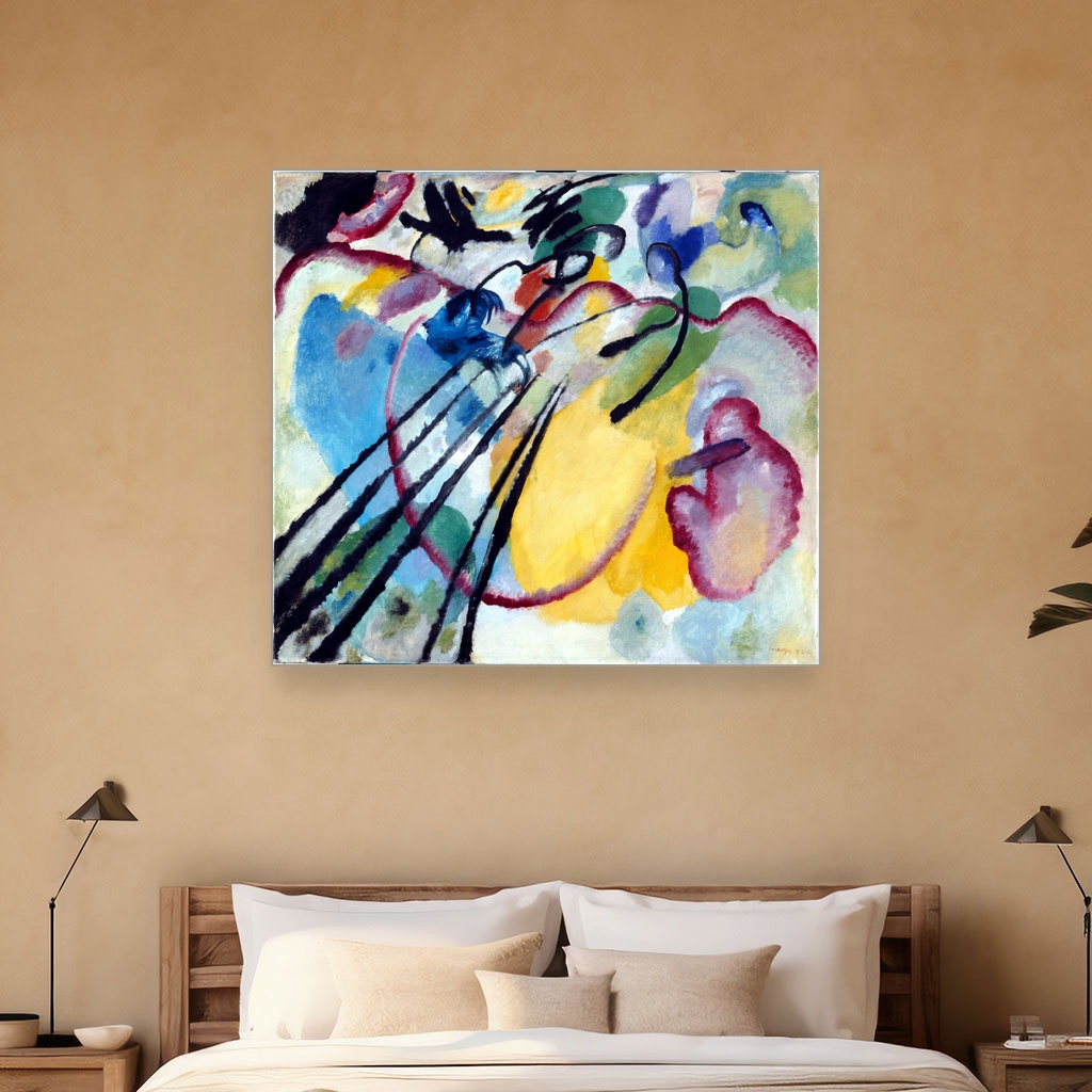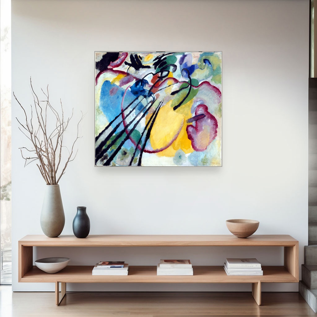 Ova umetnička reprodukcija oživljava duh početka 20. veka, kada su umetnici poput Kandinskog pomerali granice tradicionalnog slikarstva.