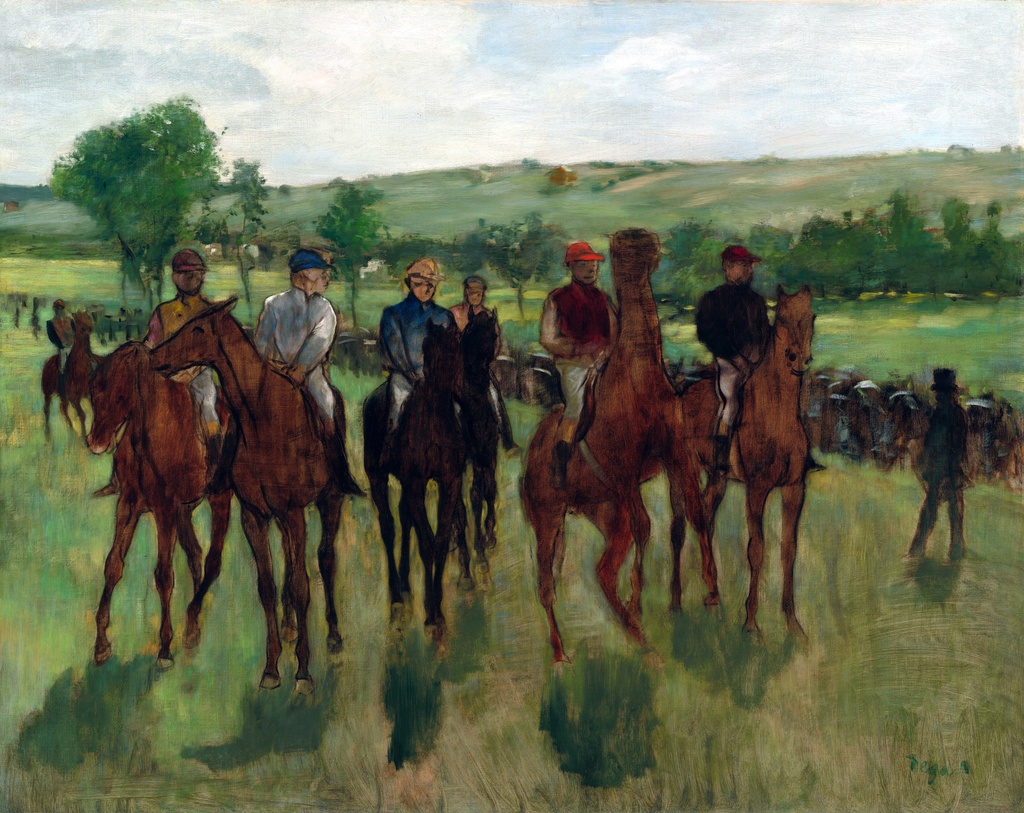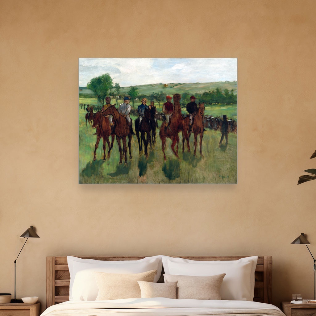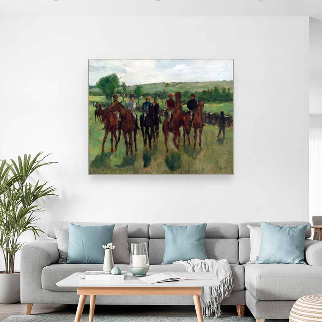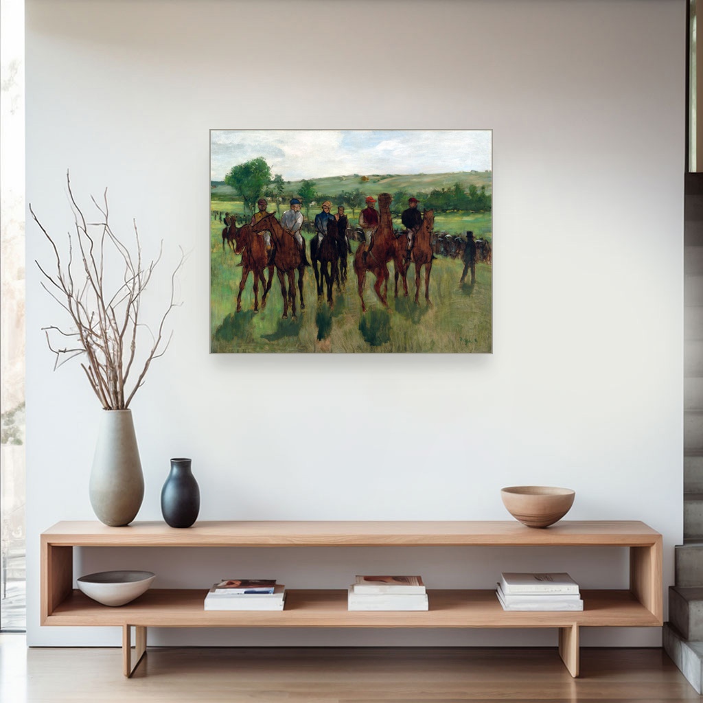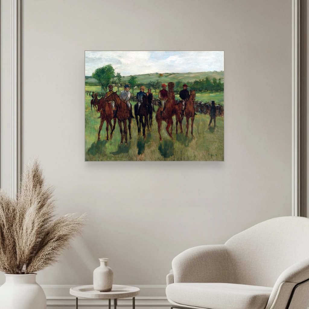 Umetnički pravac slika na platnu koji je Degas razvio omogućava da se ovi jahači dožive kao da su u stalnom pokretu, čineći ovu umetničku reprodukciju ne samo vizuelno privlačnom već i emotivno snažnom.