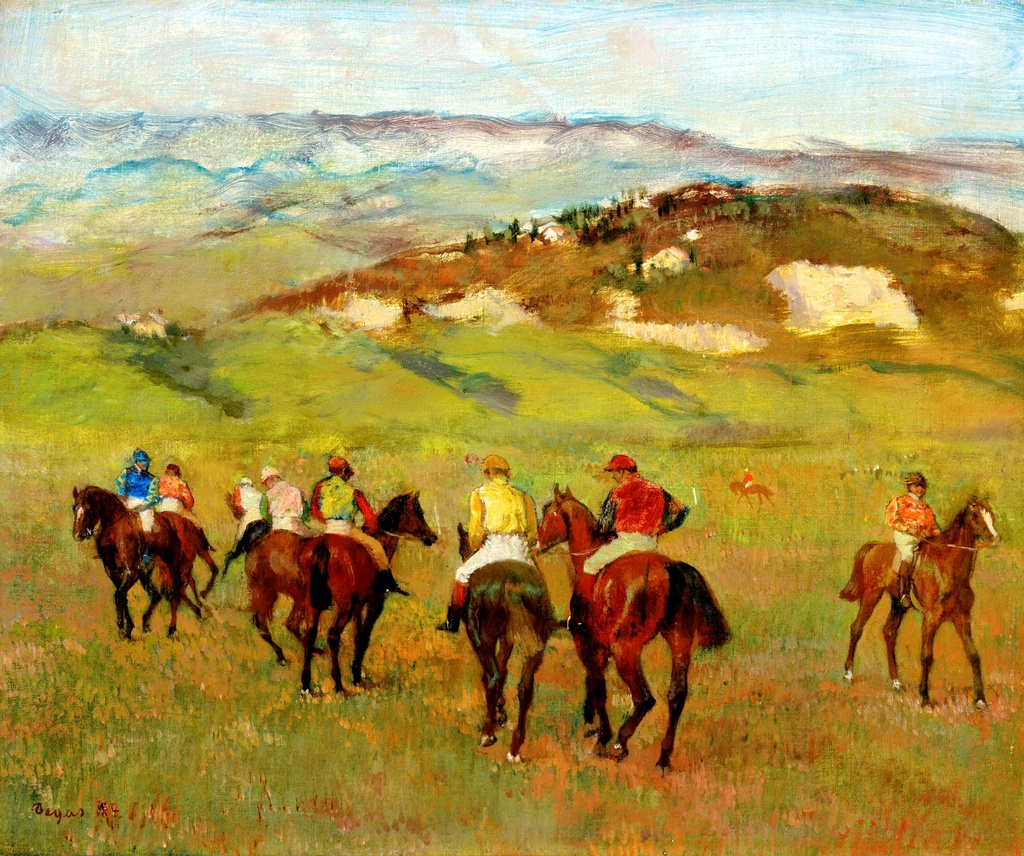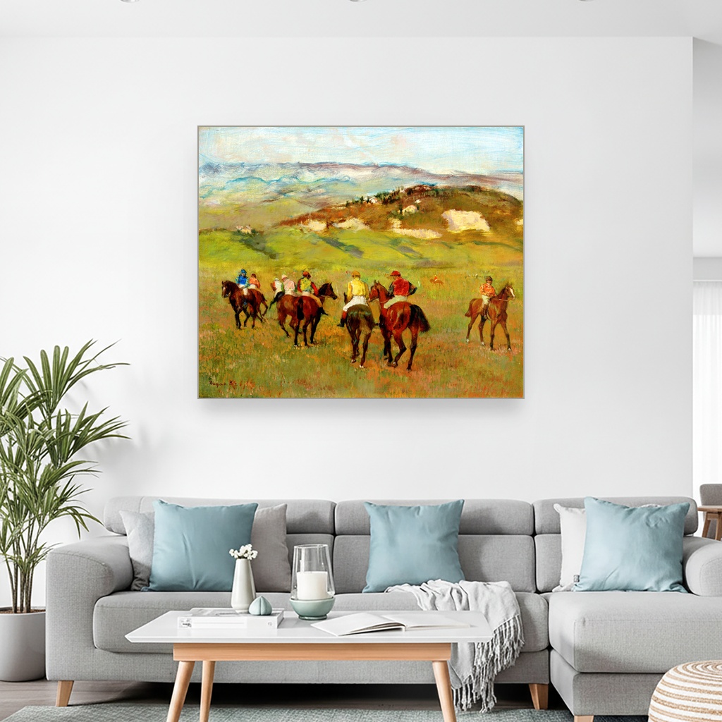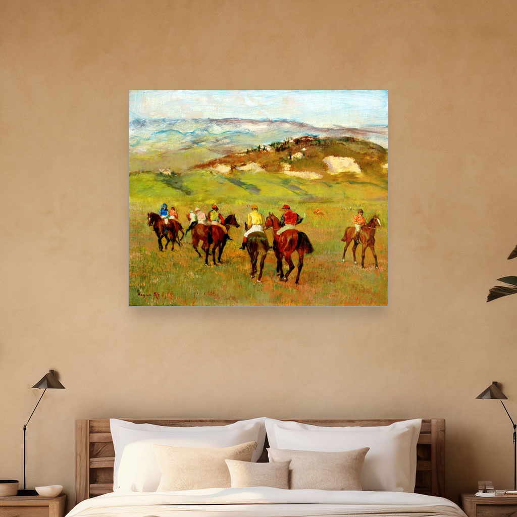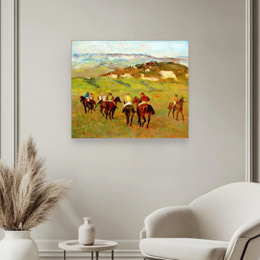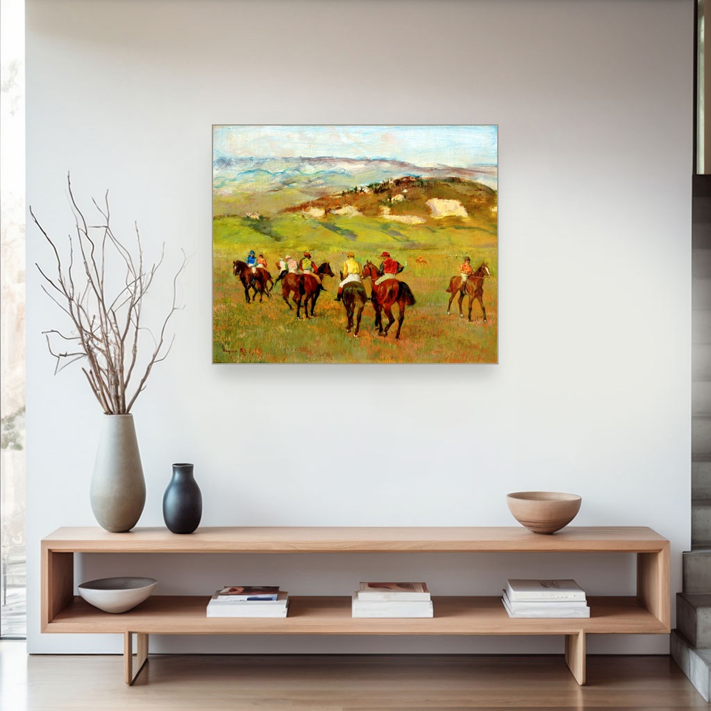 Jahači na konjima pred dalekim brdima, Edgar Degas, Jockeys on Horseback before Distant Hills, slika na platnu, predstavlja raskošnu štampu na platnu koja hvata suptilnu dinamiku pokreta i tišinu pejzaža u jednom trenutku.