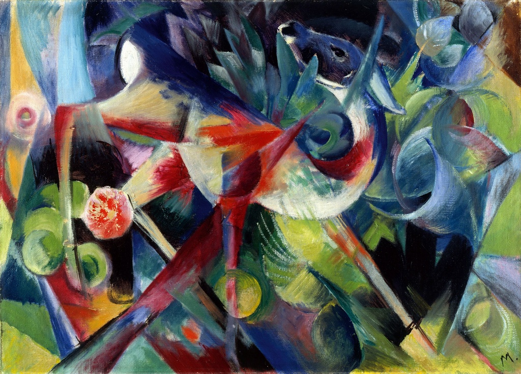 Jelen u cvećnjaku, Franz Marc, Deer in the Flower Garden, slika na platnu otvara vrata u svet ekspresionističke igre boja i života.