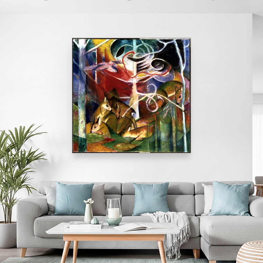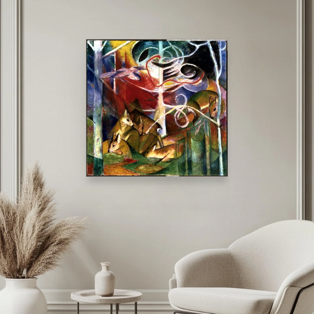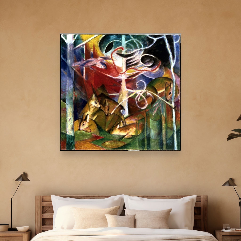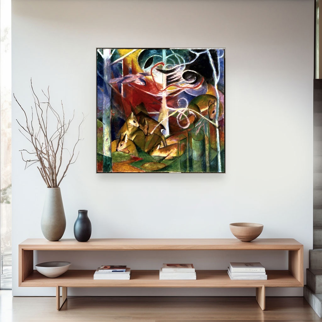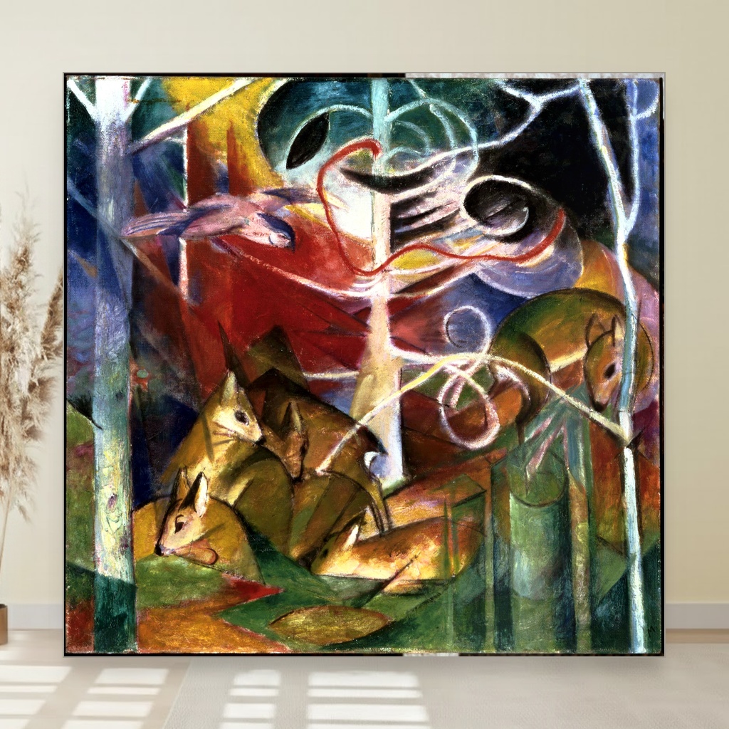 Jelen u šumi, Franz Marc, Deer in the Forest I, slika na platnu dočarava duboku povezanost umetnika sa prirodom kroz specifičan umetnički pravac dela koji je oblikovao početkom 20. veka.