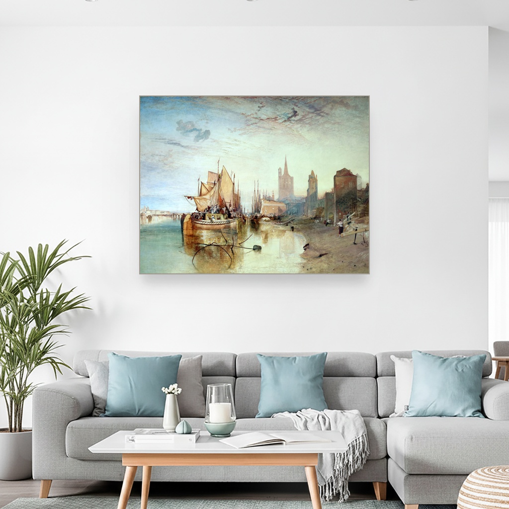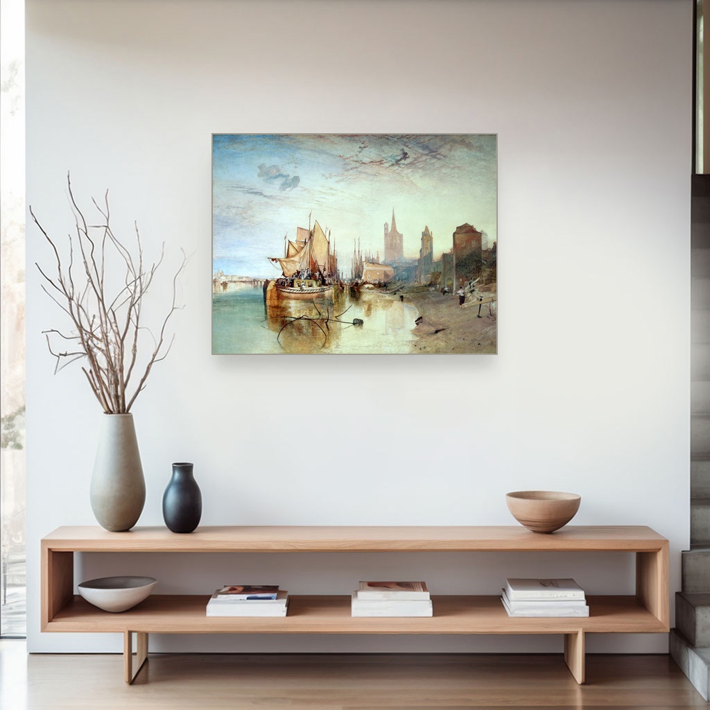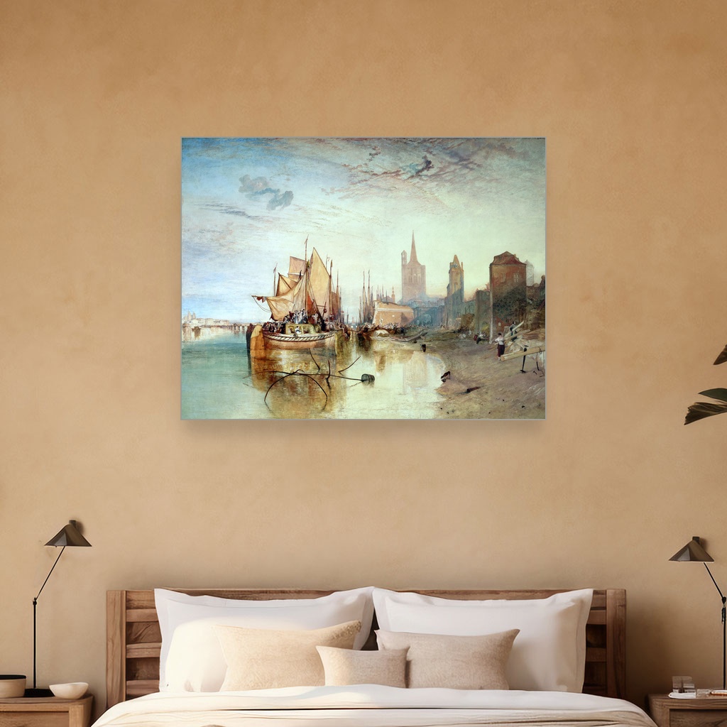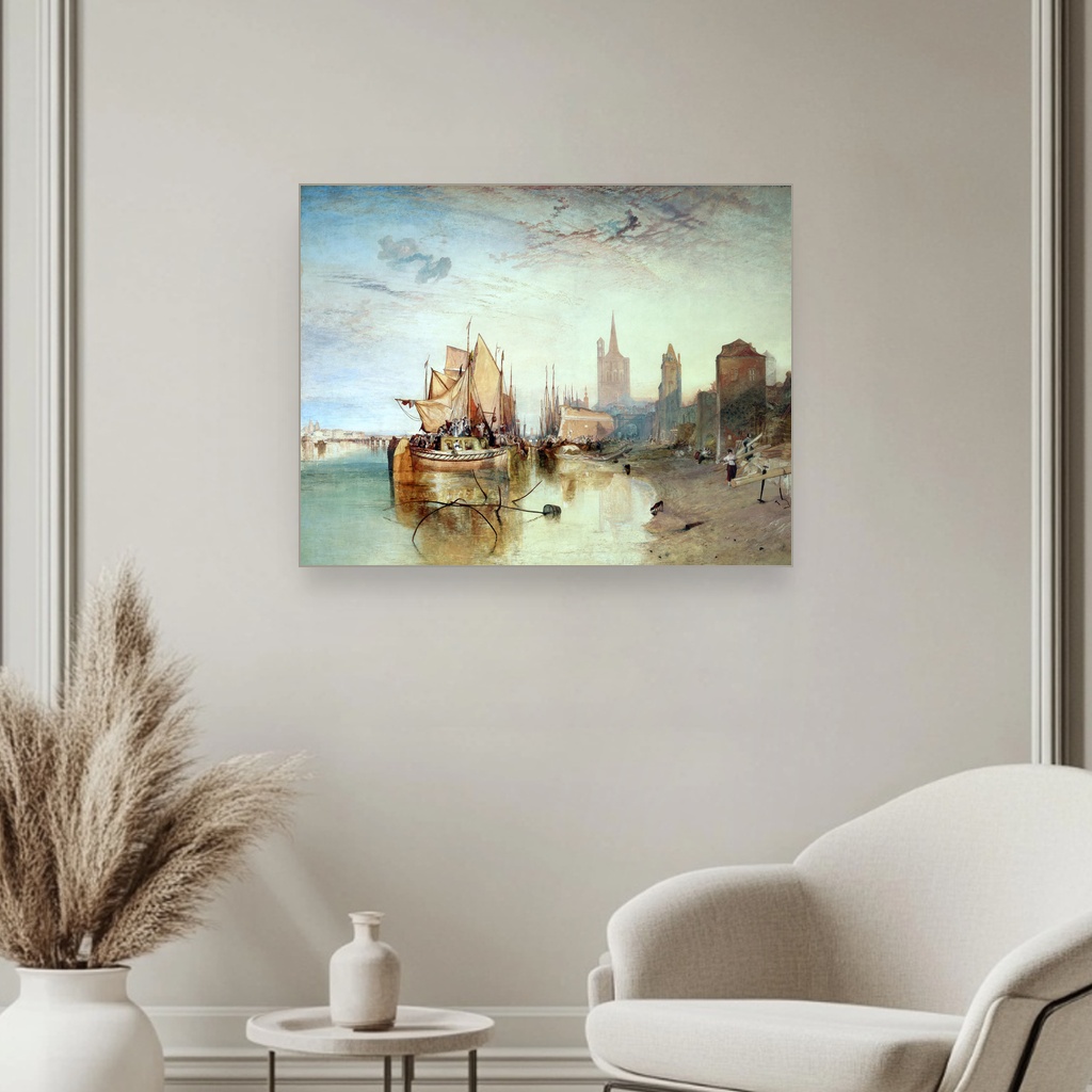 Toplina zalaska sunca obavija brod u sofisticiranoj igri svetlosti i senki, donoseći mirnu atmosferu večernjeg dolaska. Savršena je za dnevni boravak ili radni kutak gde inspiracija i smirenost zajedno dišu. Ova reprodukcija J. M. W. Turnera hvata magiju trenutka i odražava majstorstvo jednog od najvećih slikara romantizma.