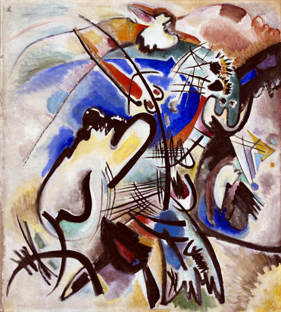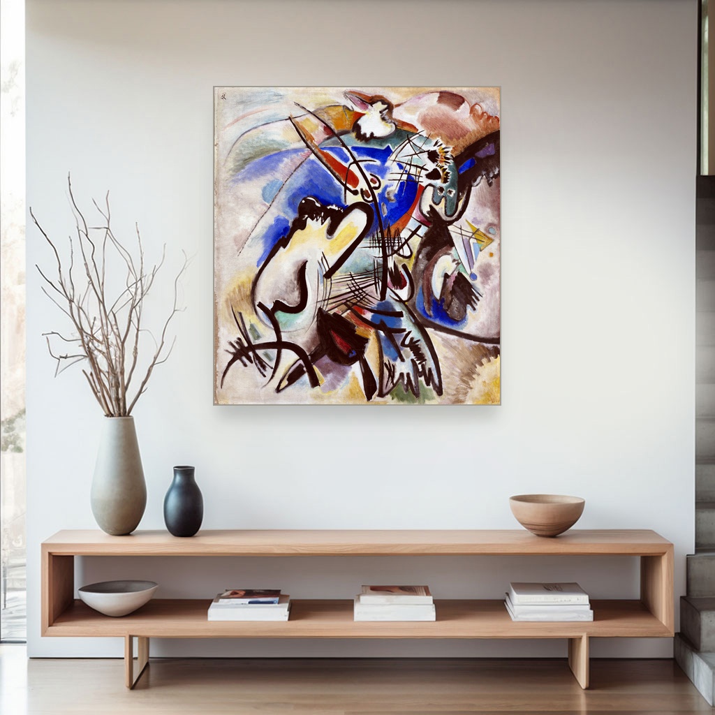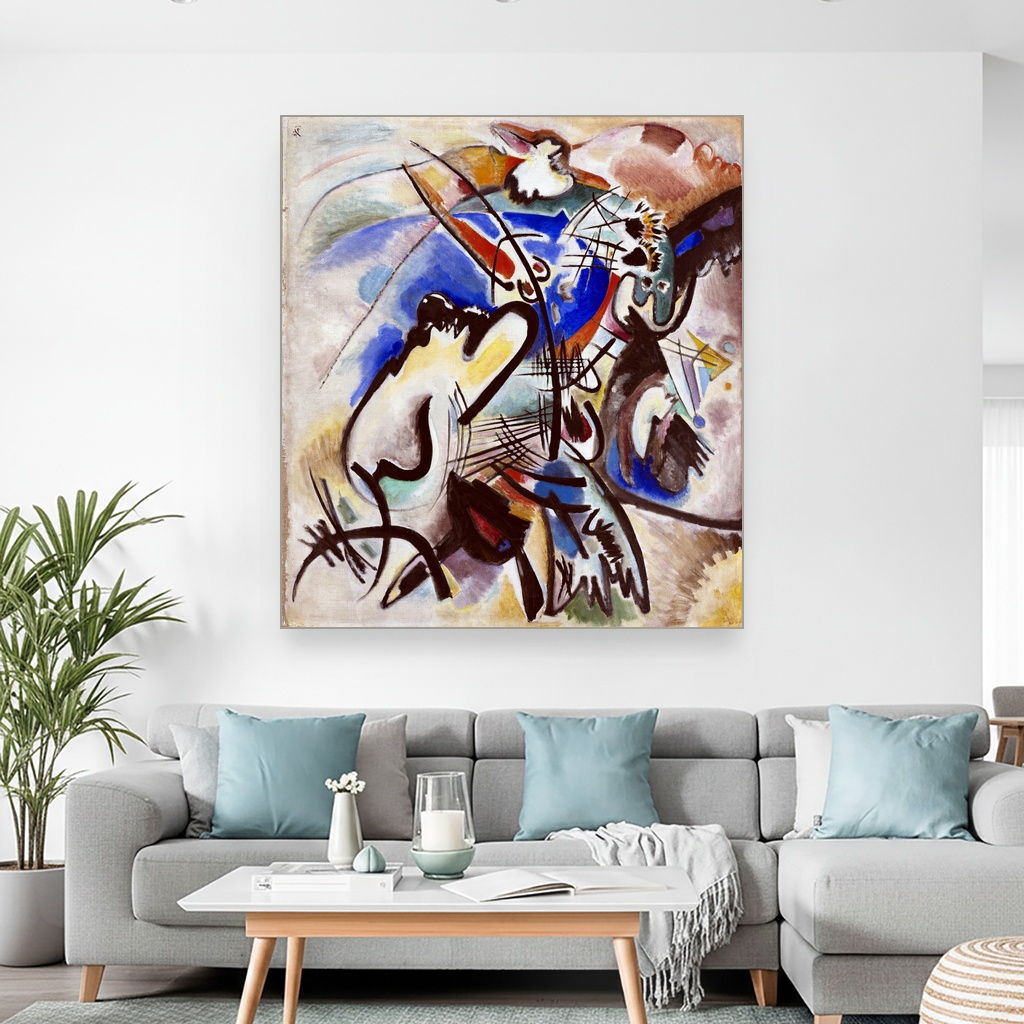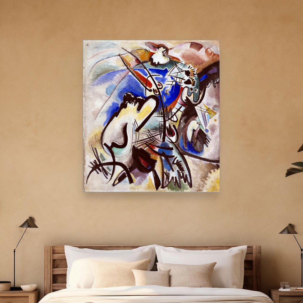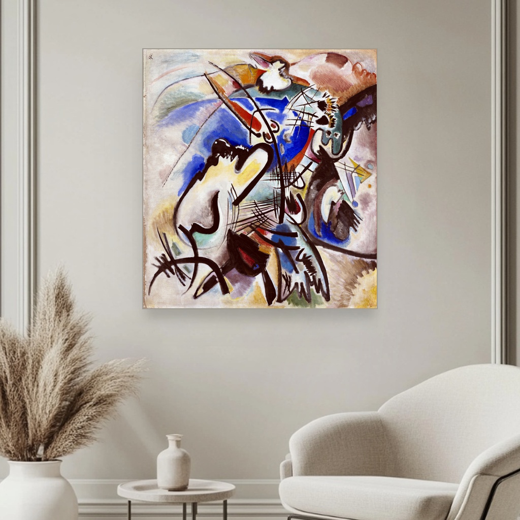 Kompozicija, Wassily Kandinsky, Composition, slika na platnu reprodukcija slike na platnu vraća nas u vreme rađanja apstraktne umetnosti, kada su boje i oblici preuzimali ulogu izražavanja unutrašnjih emocija i duhovnih dimenzija.