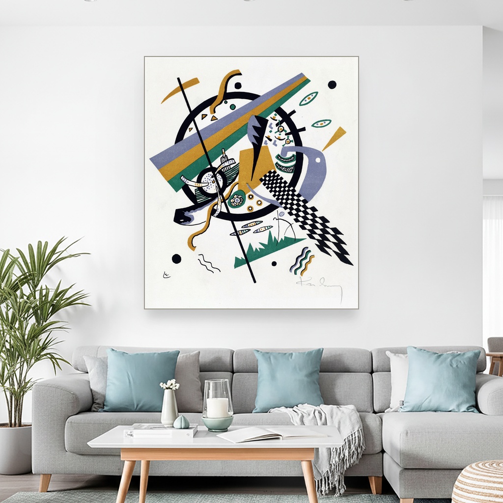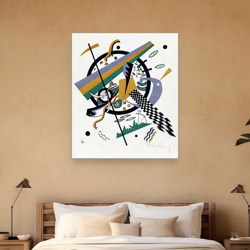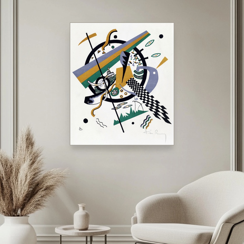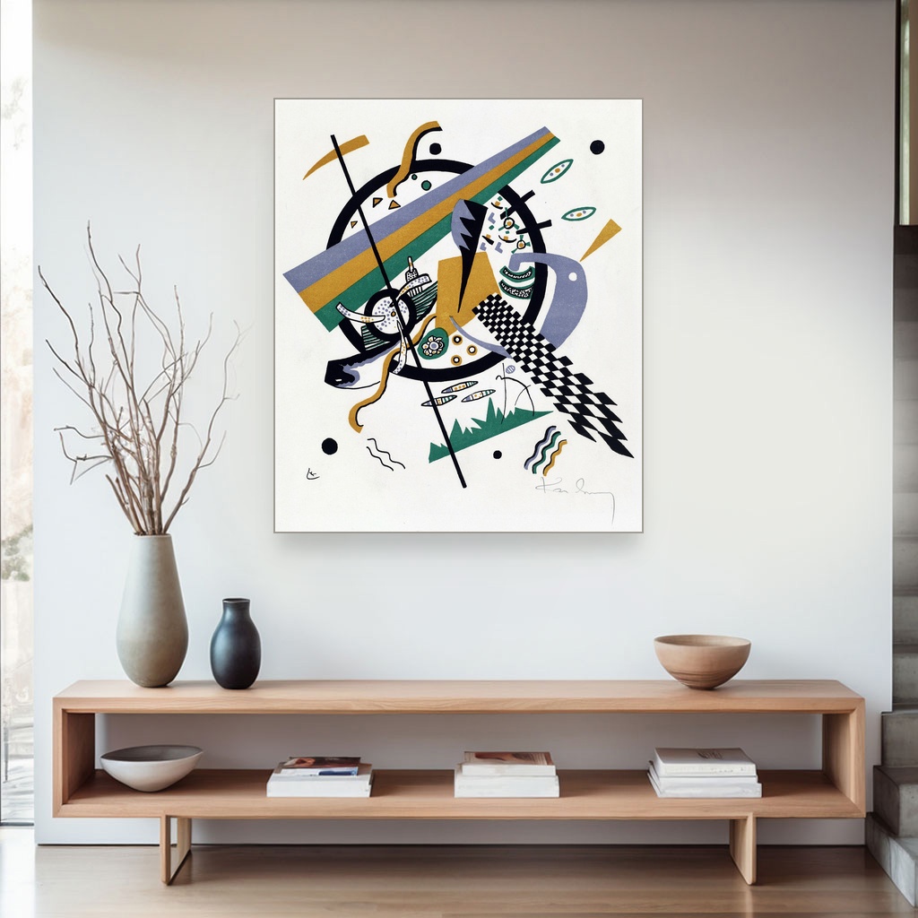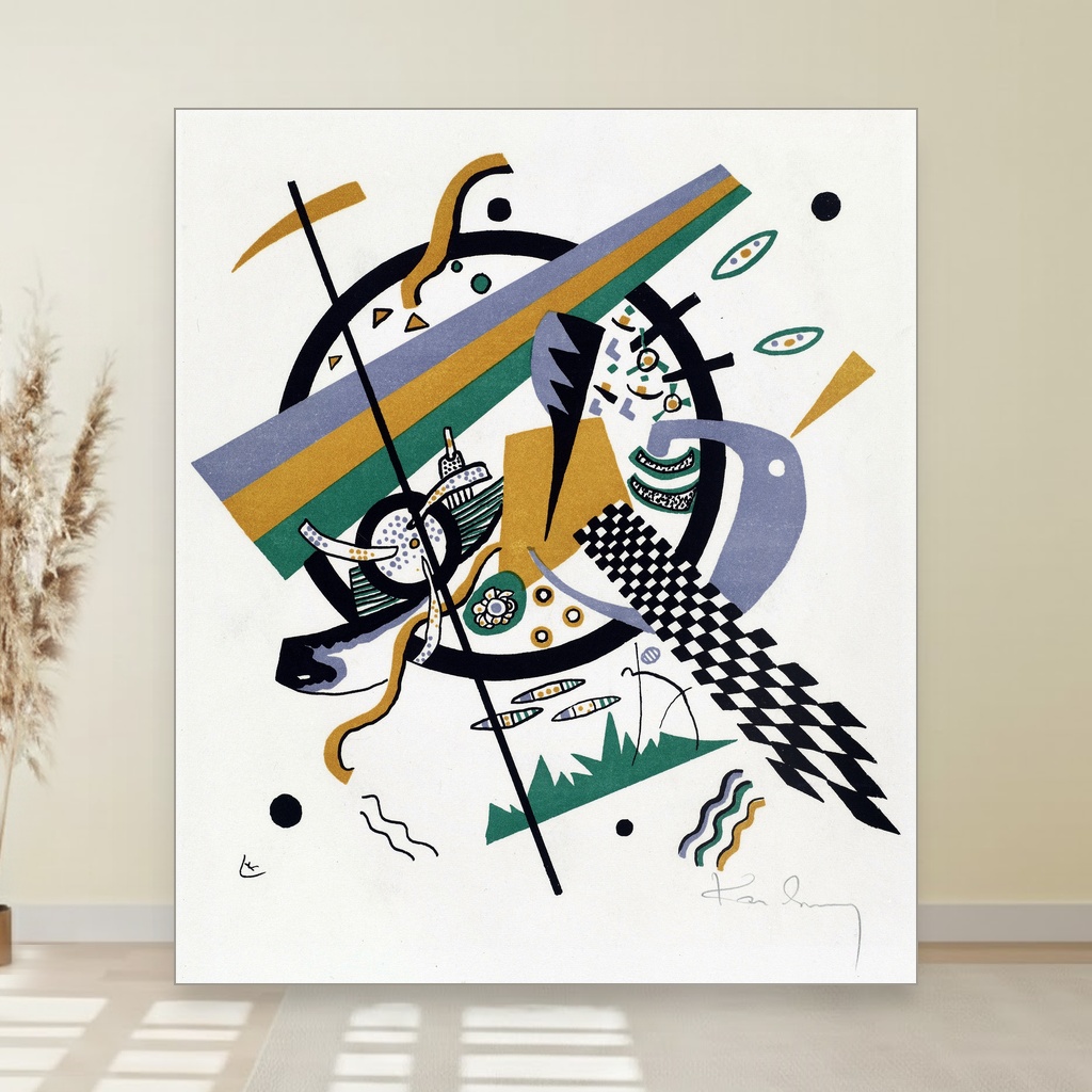 Nastala u periodu kada je Kandinsky istraživao unutrašnje svetove boja i oblika, ova umetnička reprodukcija na platnu osvetljava njegovu viziju kroz složene geometrijske figure i dinamične kontraste.