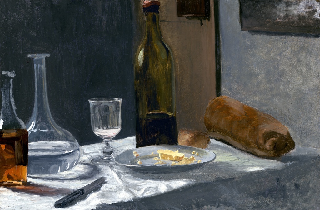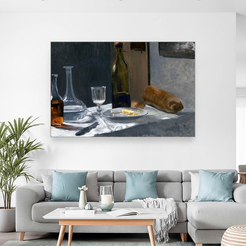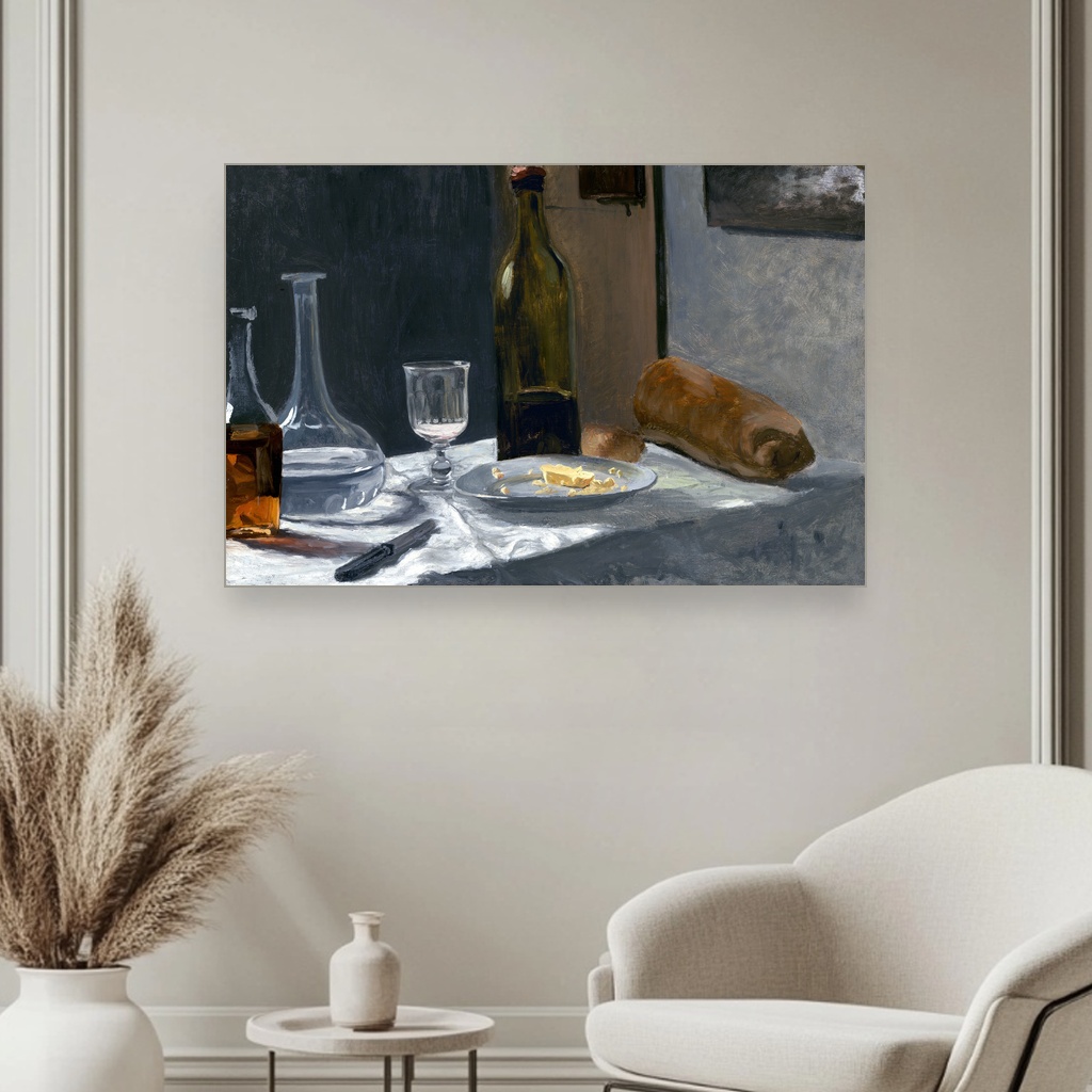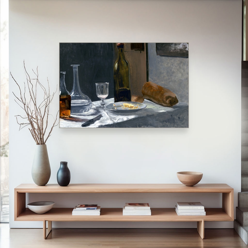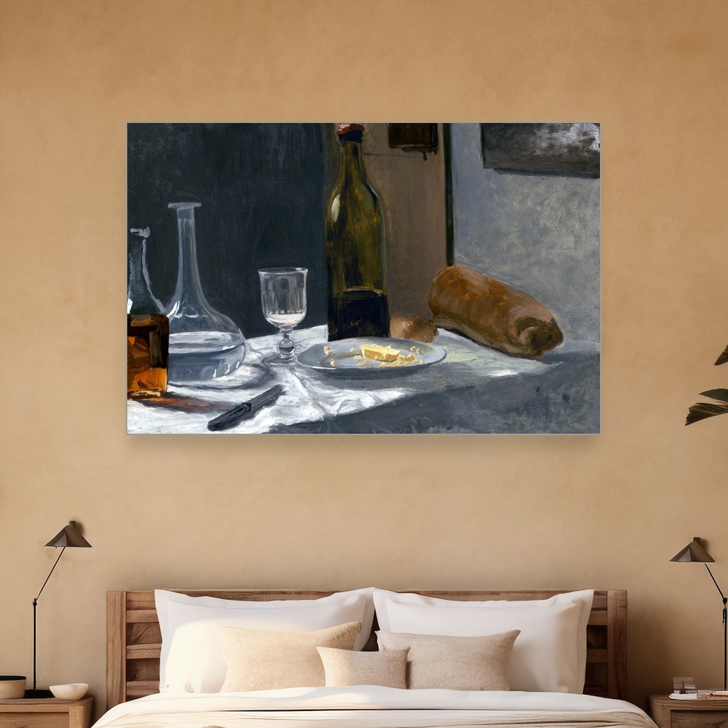 Mrtva priroda sa bocom, karafom, hlebom i vinom, Paul Cézanne, Still Life with Bottle Carafe Bread and Wine, slika na platnu reprodukcija slike na platnu otkriva magiju trenutka zarobljenog u tišini svakodnevnog predmeta.