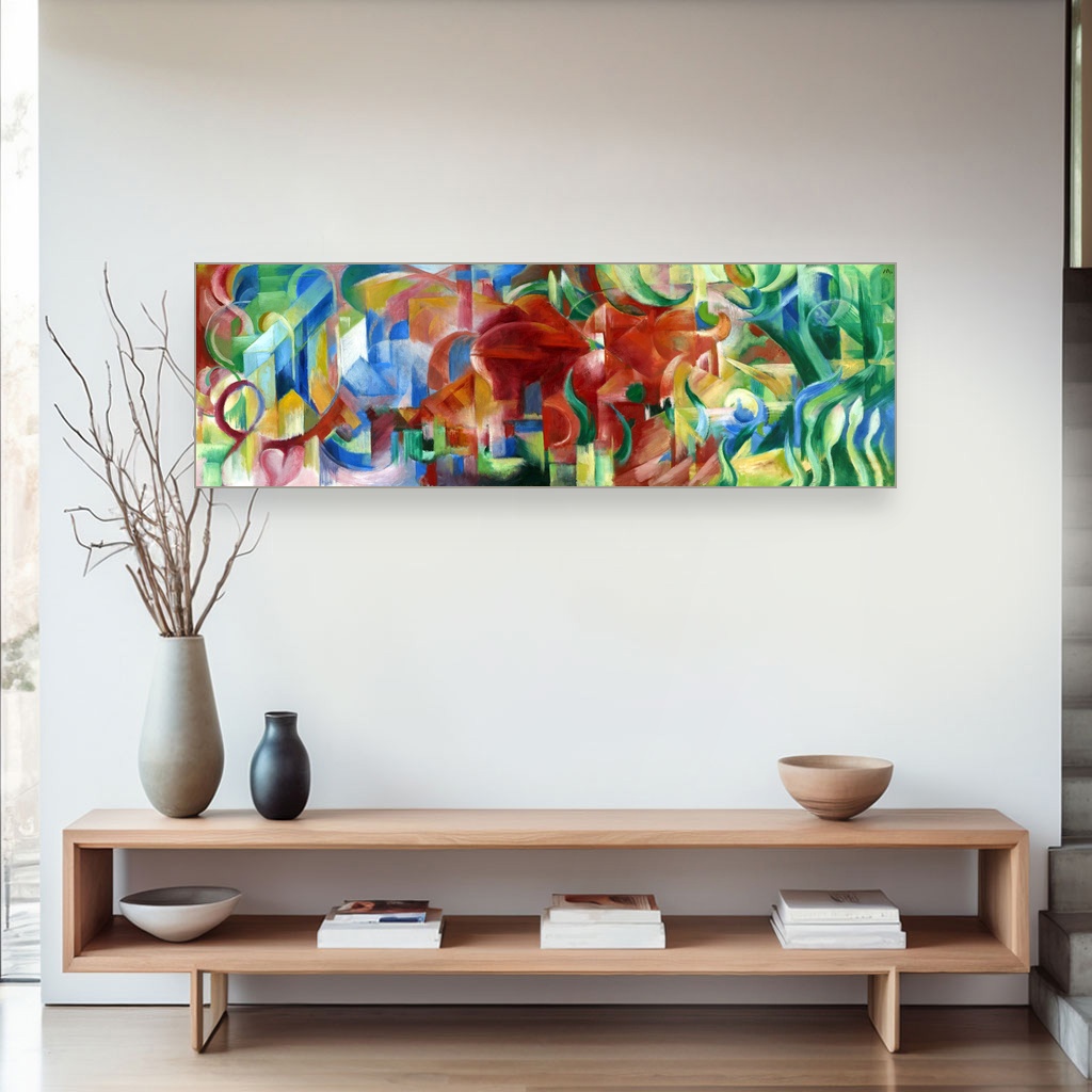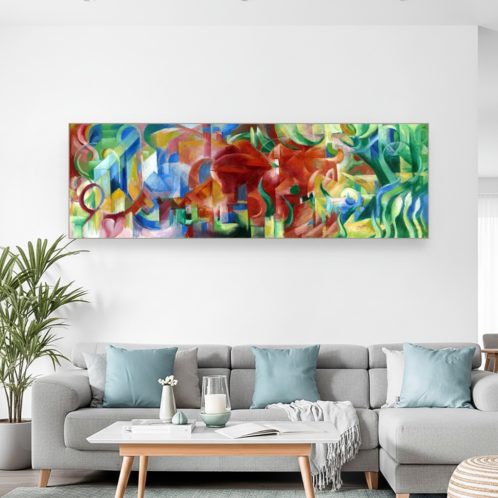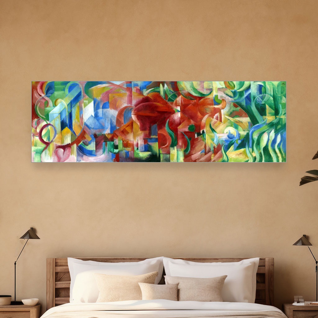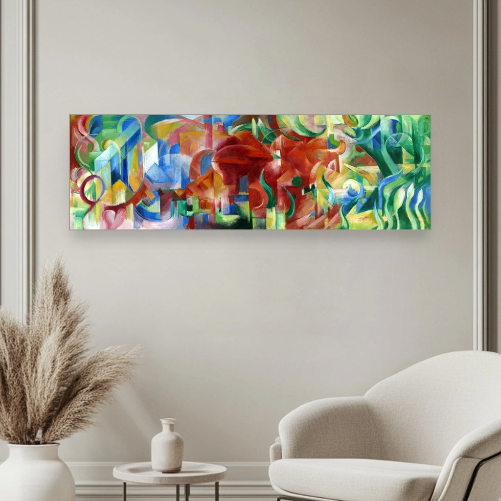 Franz Marc, jedan od osnivača nemačkog ekspresionizma, poznat je po svojim inovativnim pristupima boji i formi, a ova reprodukcija slike na platnu odražava njegovu duboku posvećenost apstraktnim oblicima i dinamičnim kompozicijama.