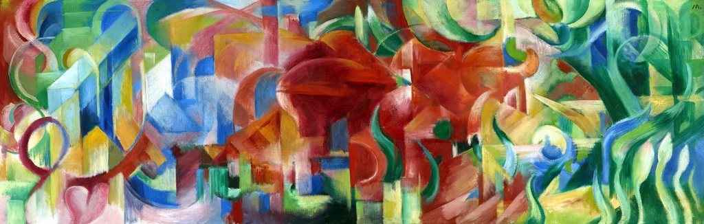 U delu Oblici u igri, Marc istražuje harmoniju između boja i oblika, stvarajući vizuelni ples koji odiše energijom i pokretom.