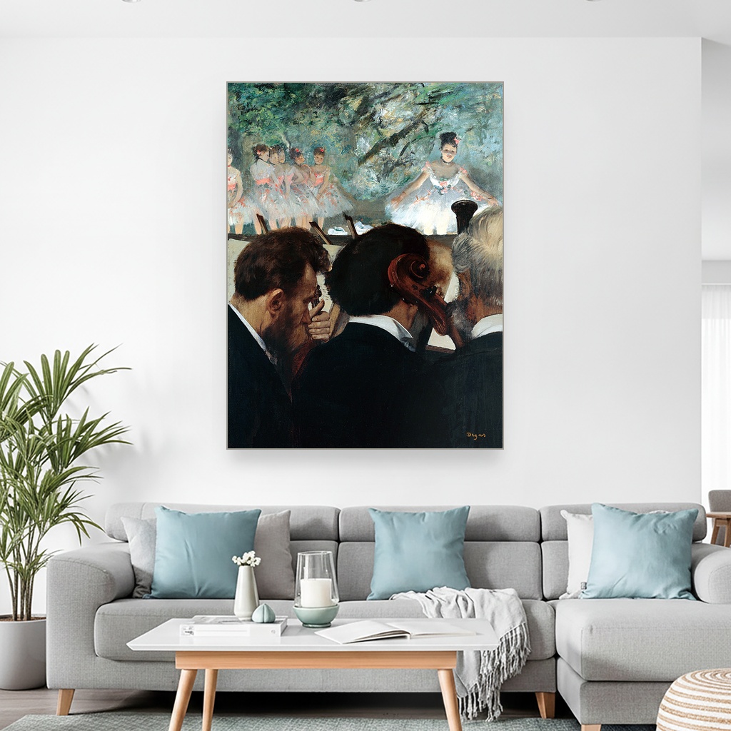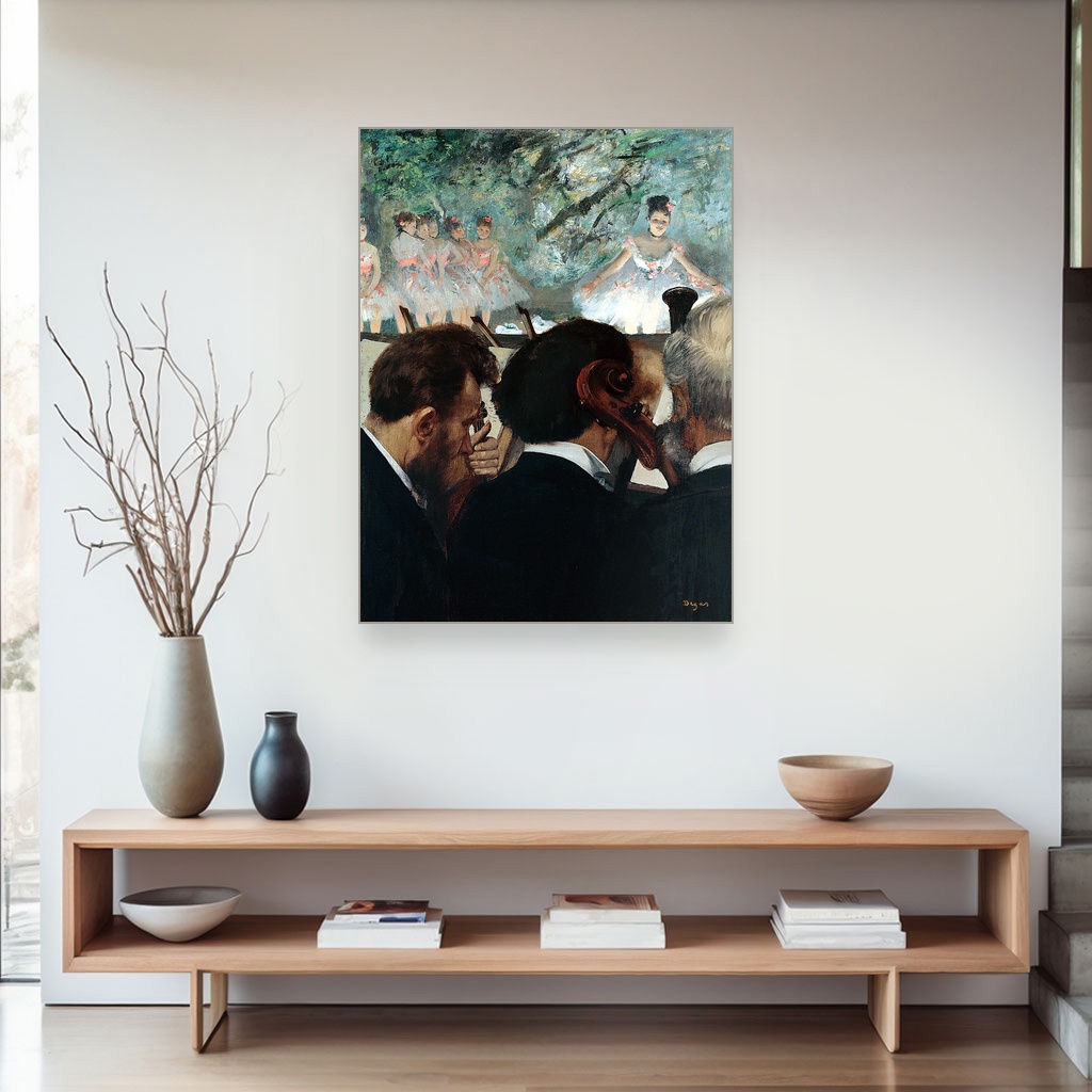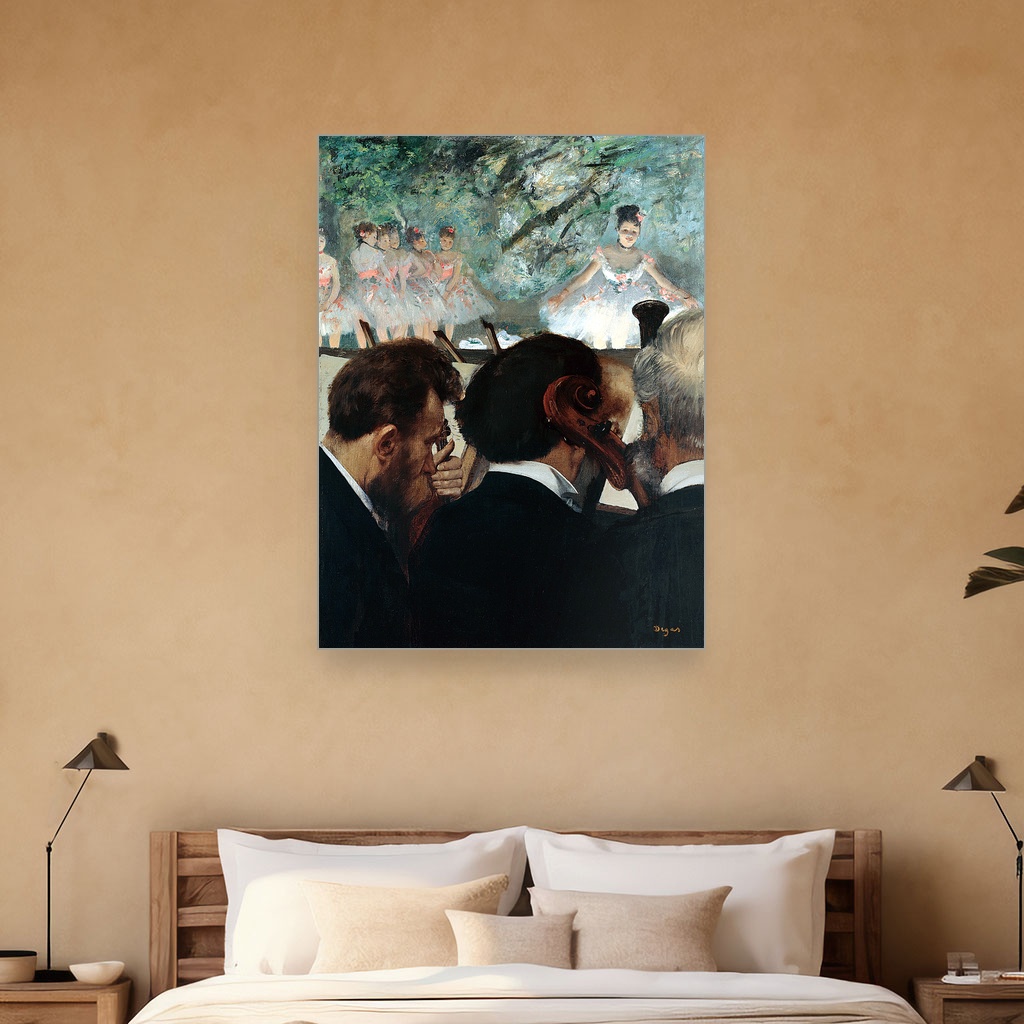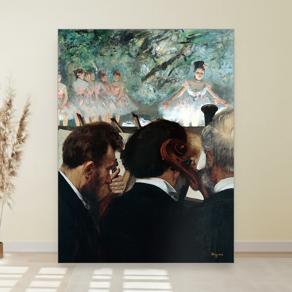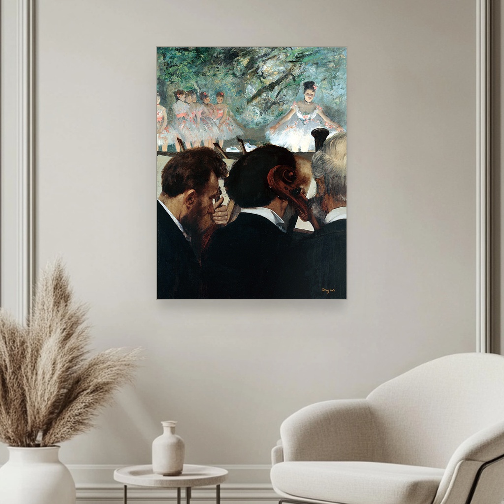 Orkestar muzičara odiše skladom pokreta i tišinom pred nastup, prikazujući umetnički pravac slike za zid koji je duboko ukorenjen u impresionizmu i realizmu kraja 19. veka.
