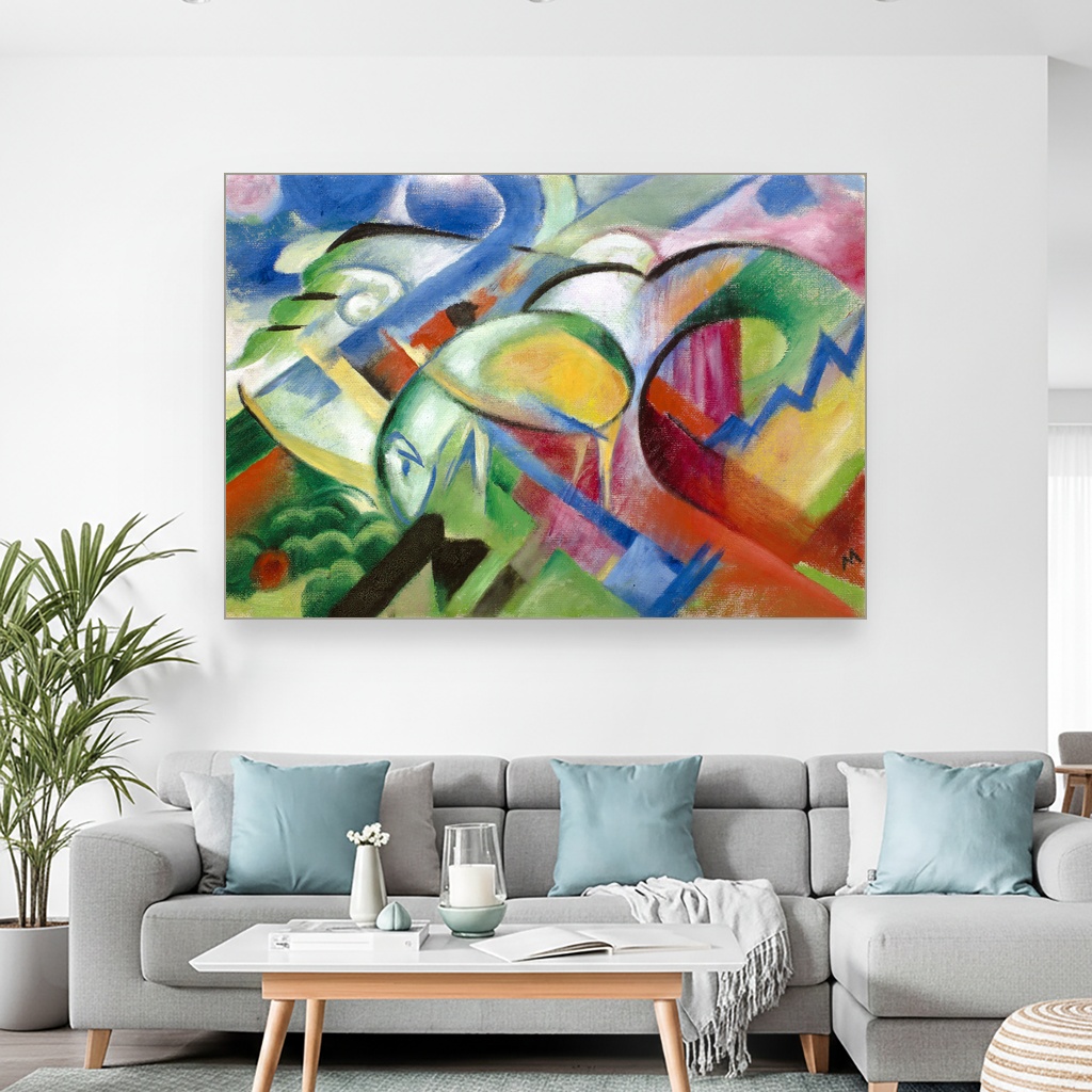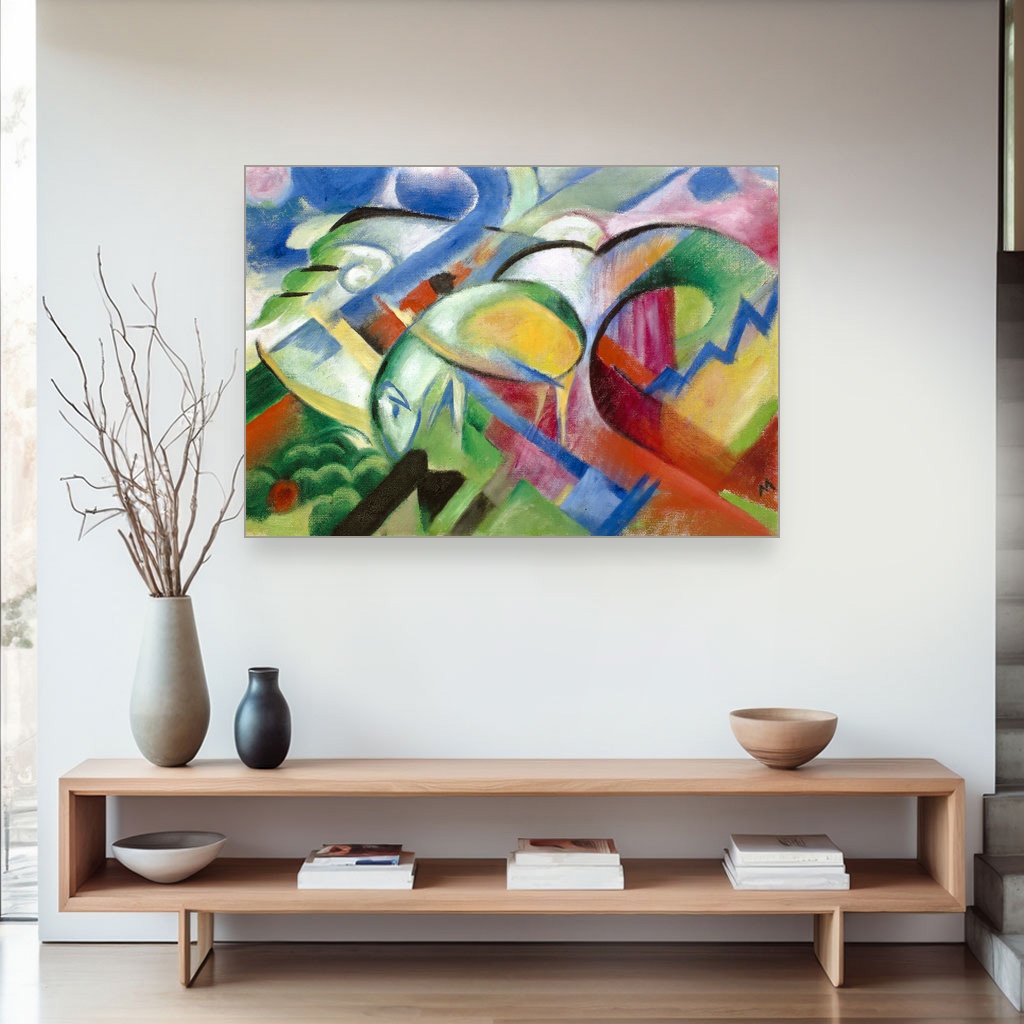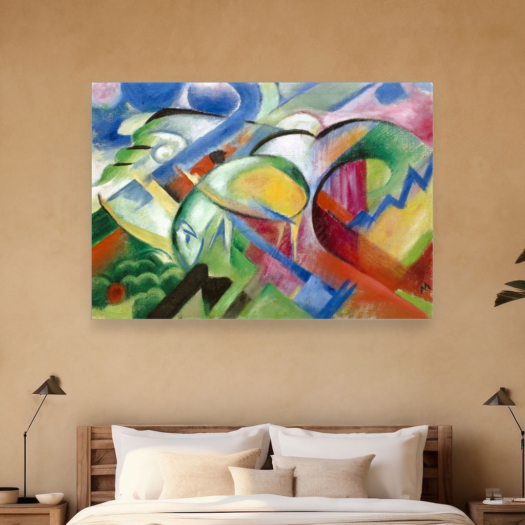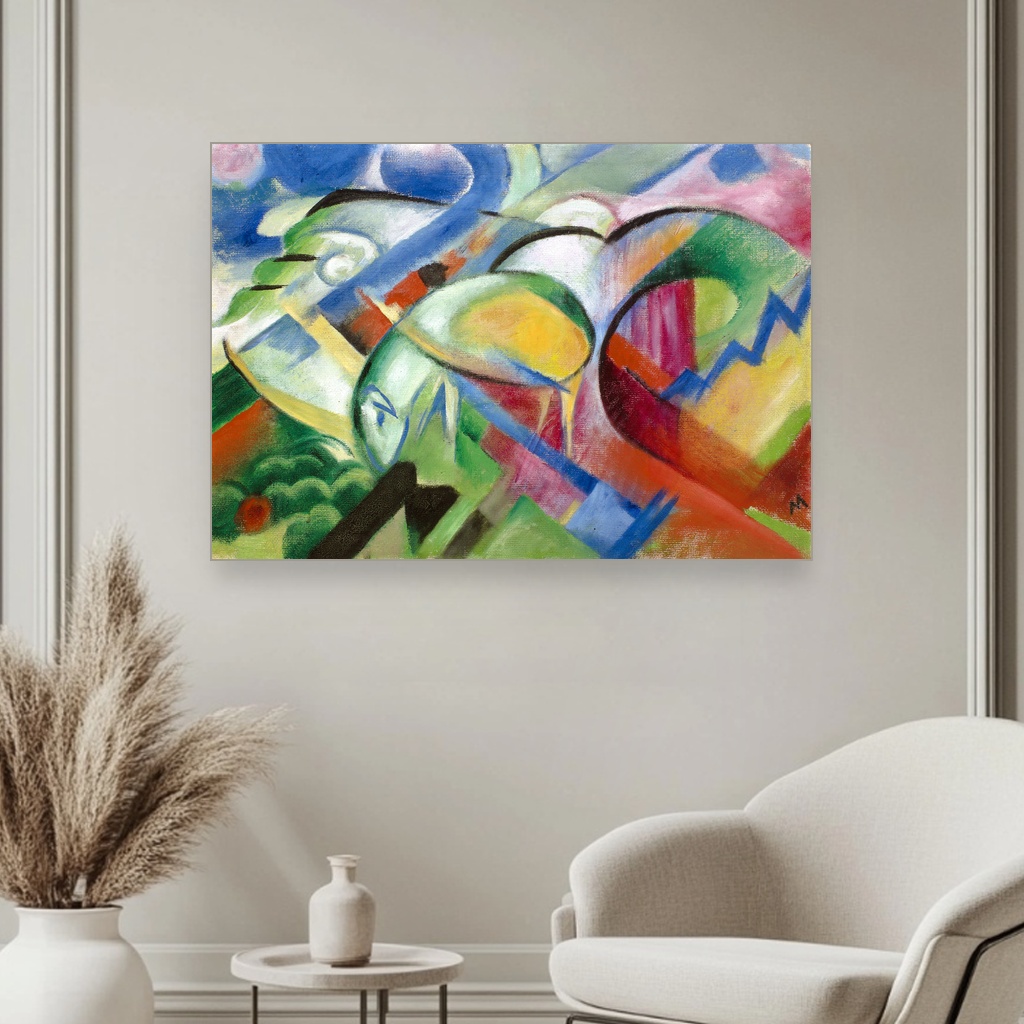 Ova slika odiše nežnošću i mirom, donoseći spokojstvo kroz živopisne oblike i bogate boje. Idealna je za dnevni boravak ili radni prostor gde želite da unesete dozu inspiracije i smirenosti. Reprodukcija dela Franza Marca savršeno dočarava njegov jedinstveni izraz i energiju, čineći je vrednim umetničkim dodatkom svakom domu.