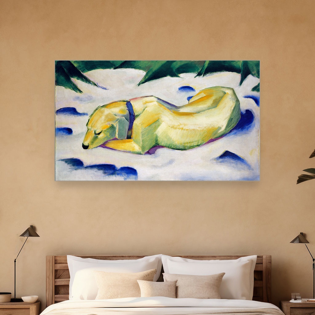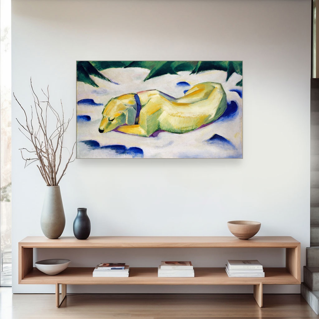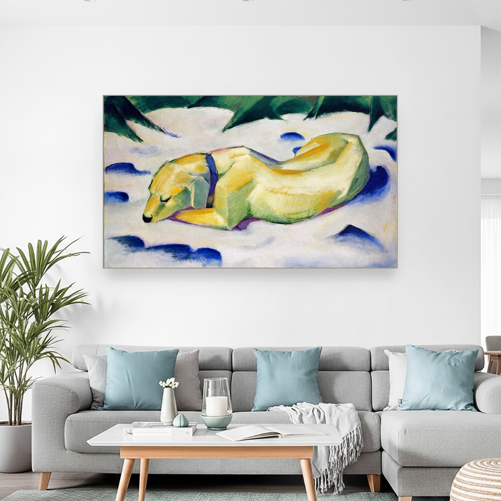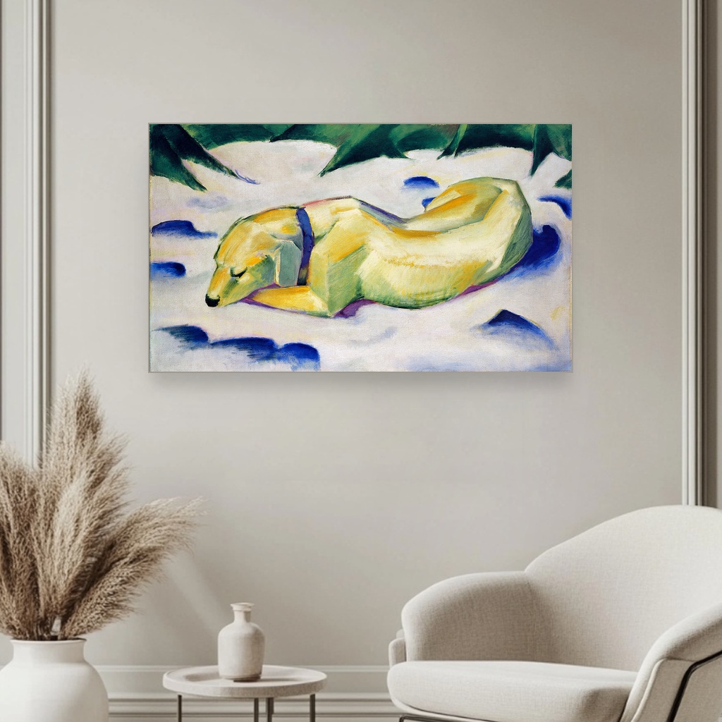 Pas koji leži na snegu od Franza Marca može biti centralni deo svake kolekcije, jer spaja umetnički pravac slike za zid sa savremenim zahtevima estetike i kvaliteta.
