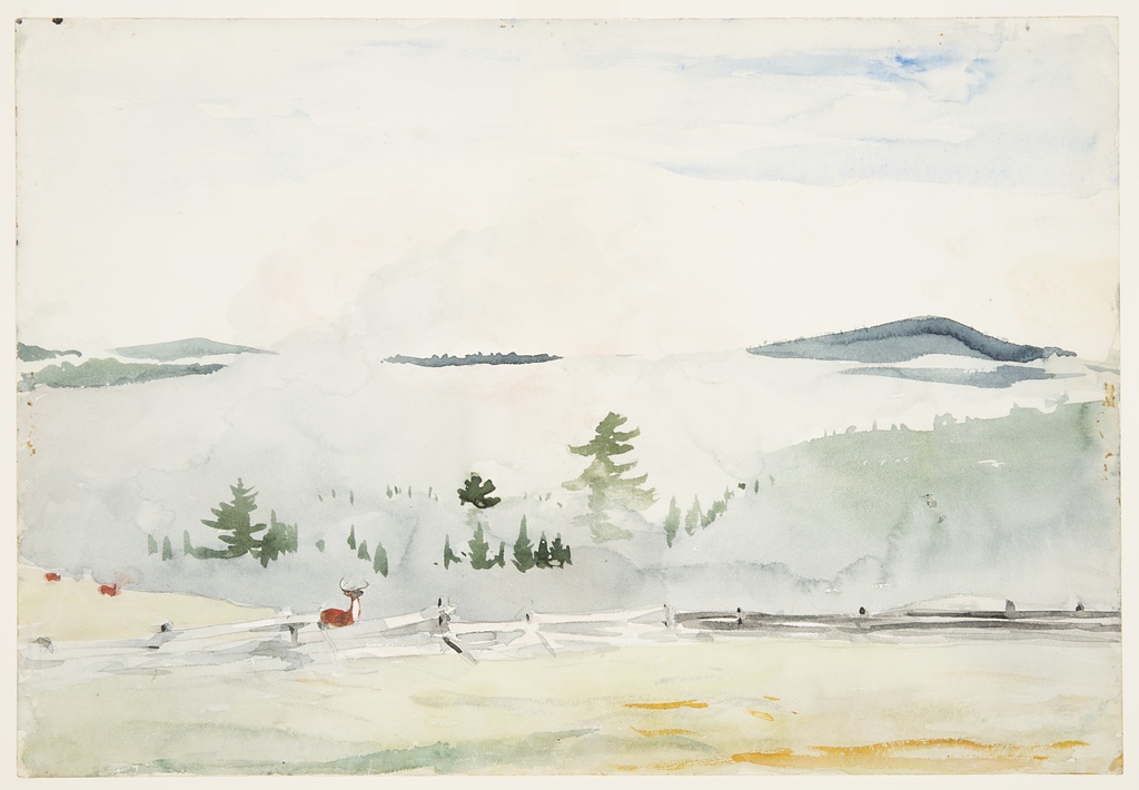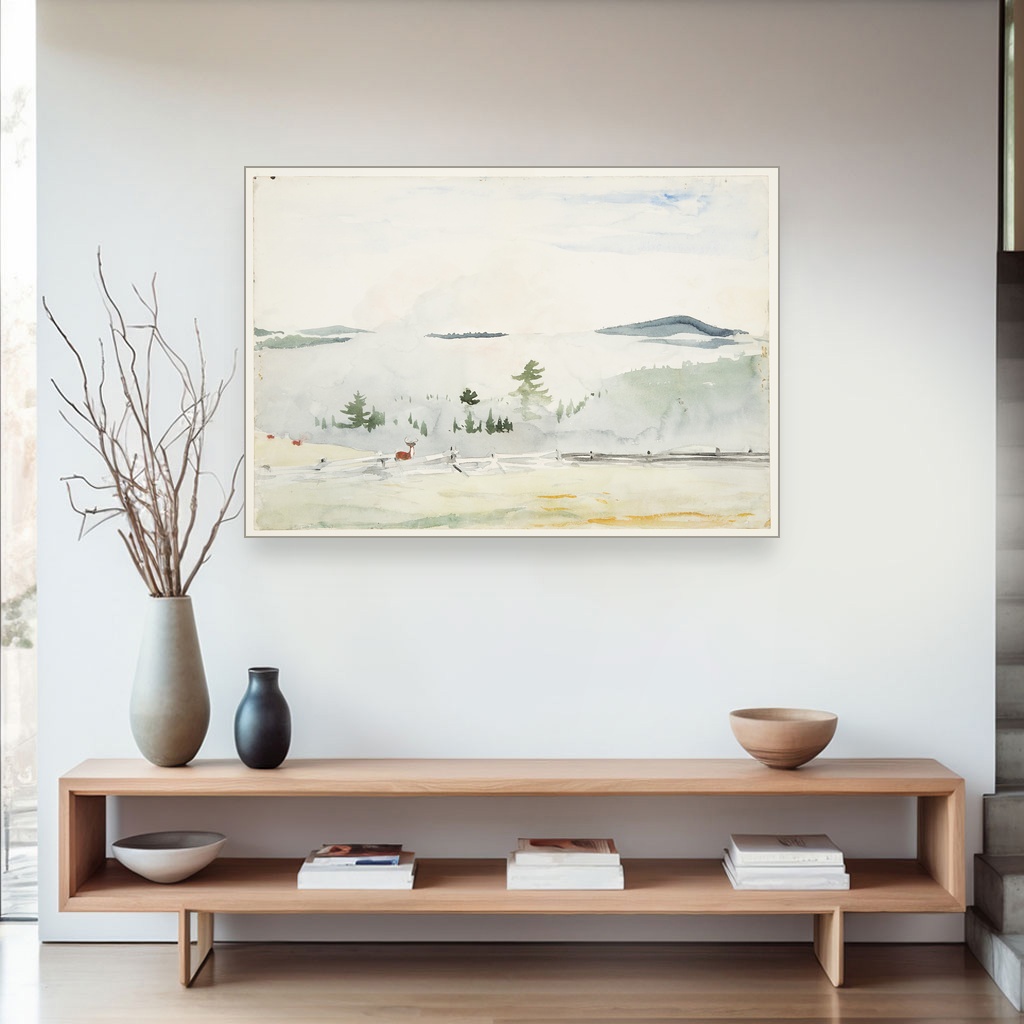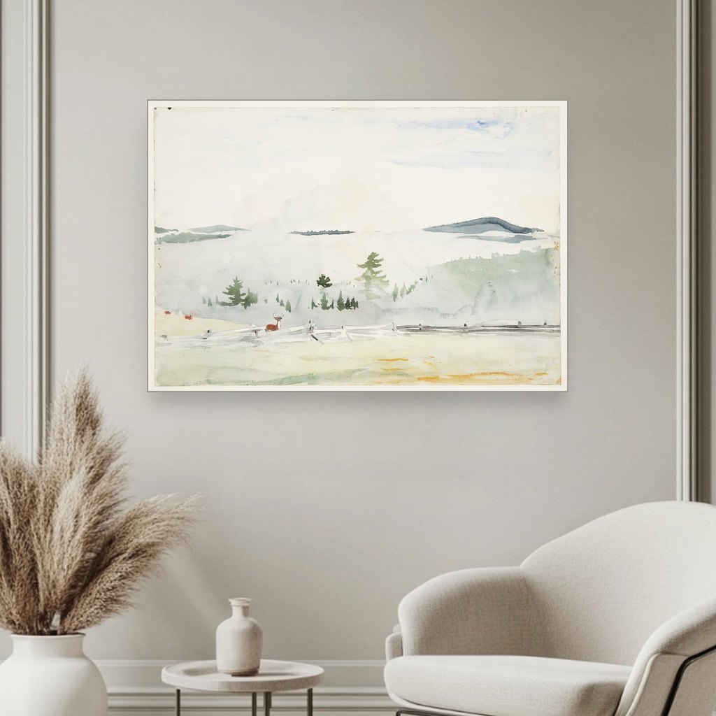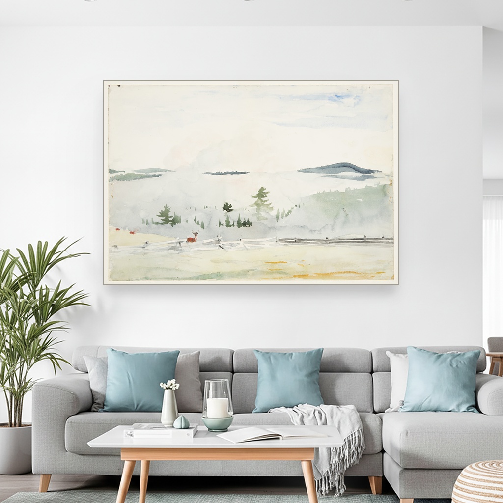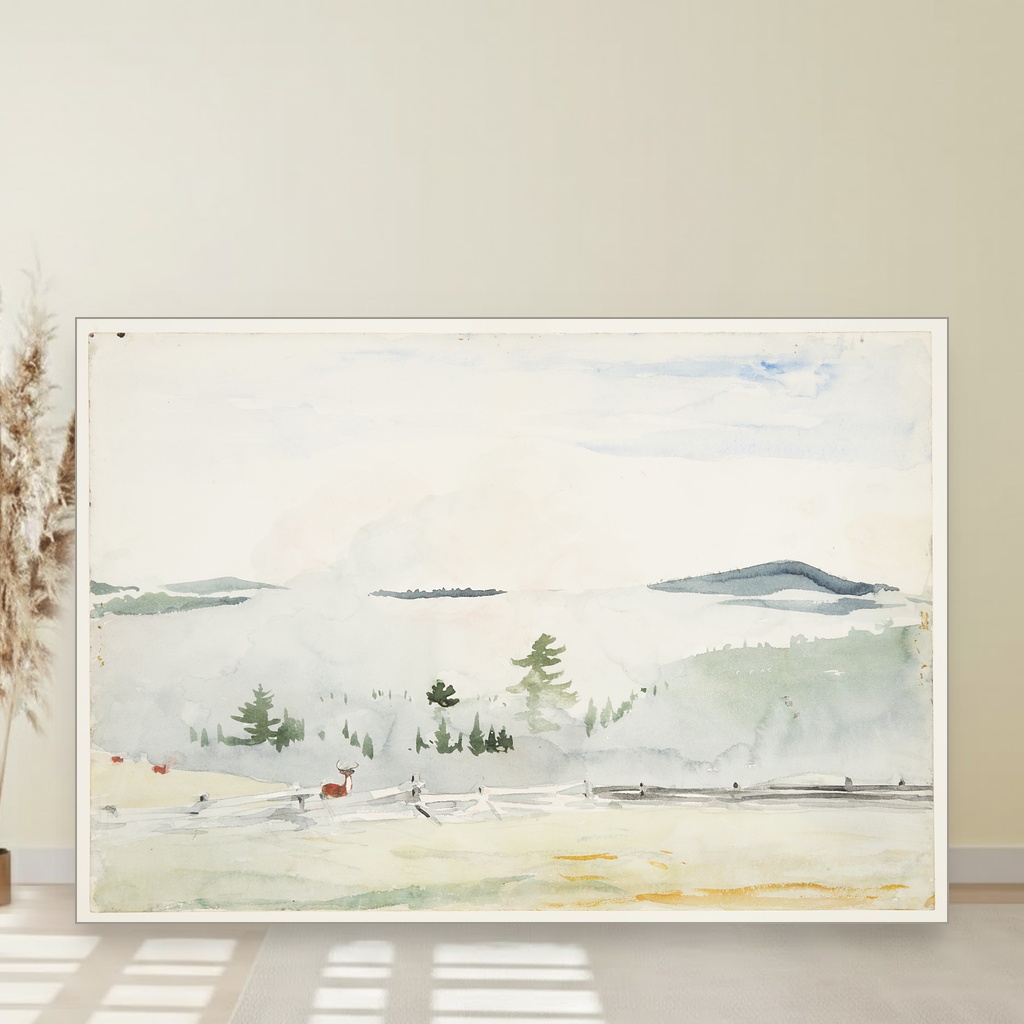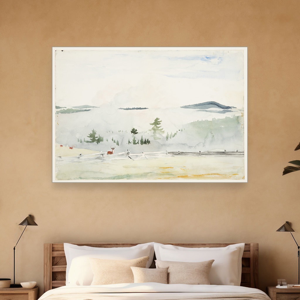 Pejzaž sa jelenima u jutarnjoj izmaglici, Winslow Homer, Landscape with Deer in Morning Haze, slika na platnu reproducira jedan od najintimnijih trenutaka prirode uhvaćen kroz kist velikog američkog slikara.