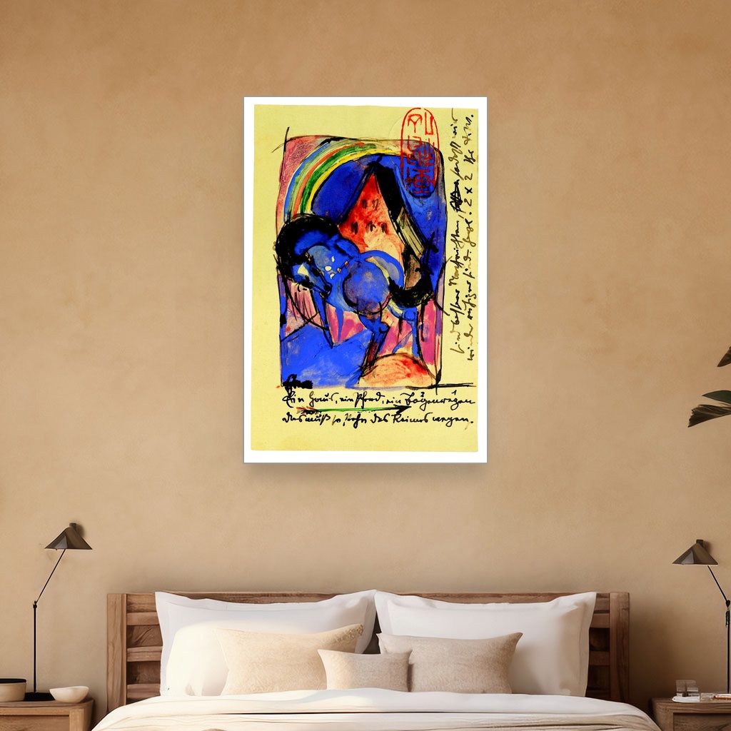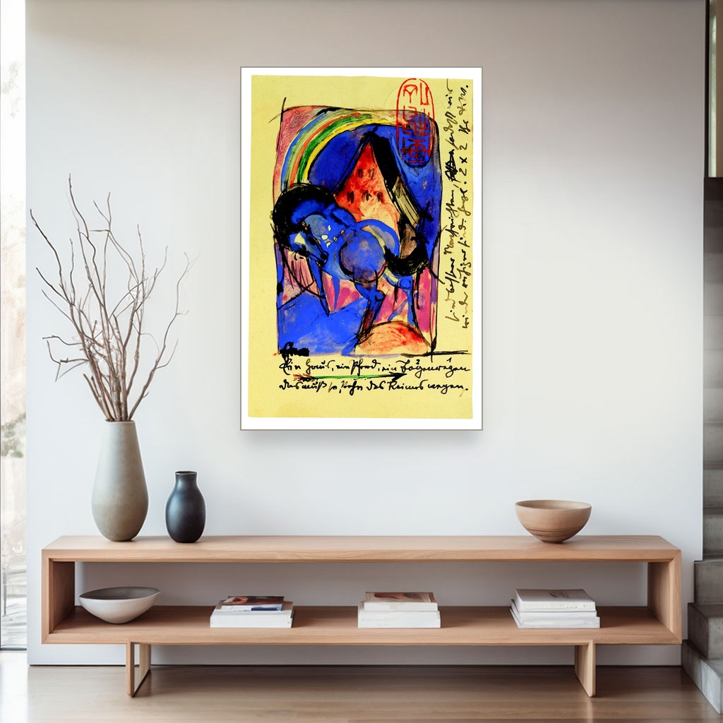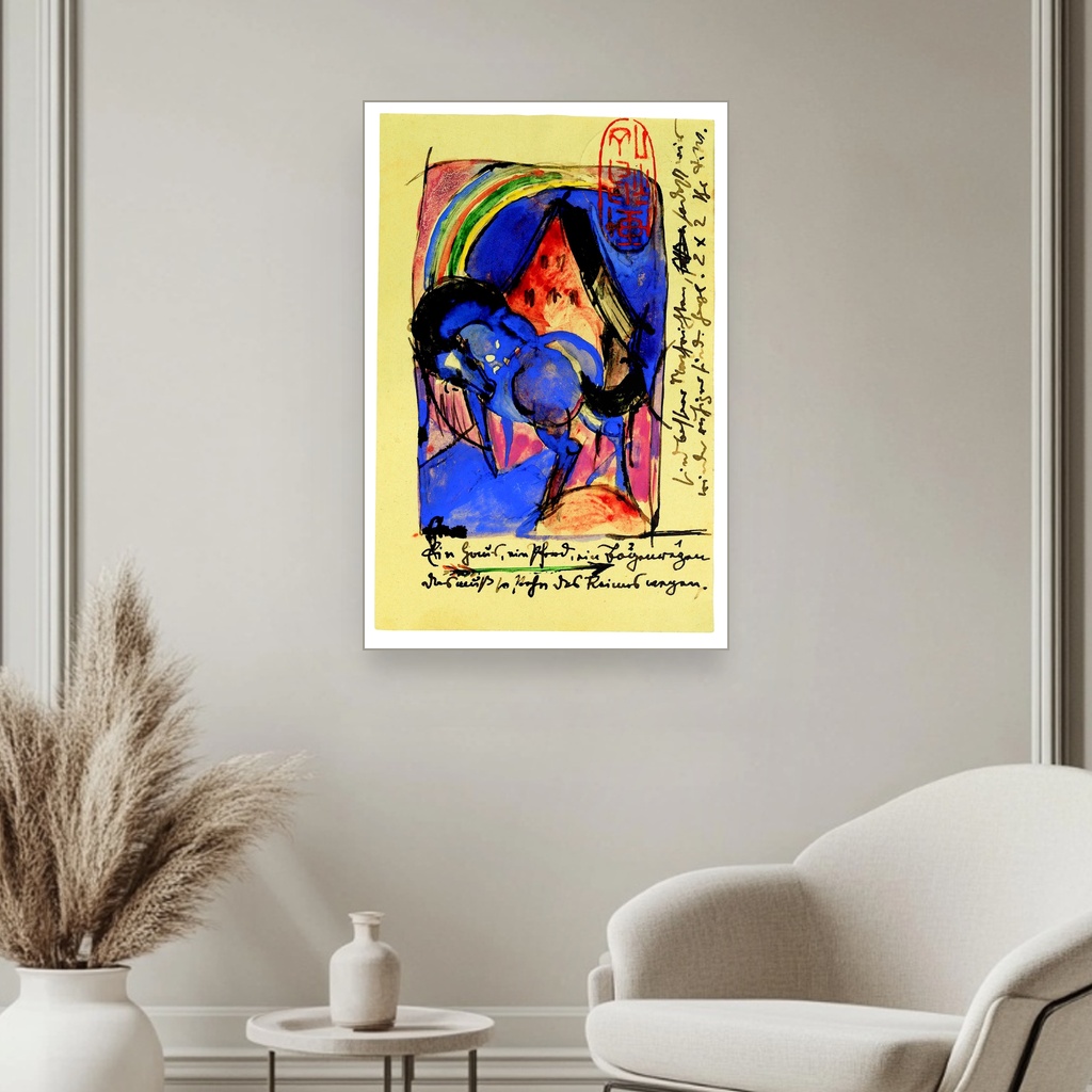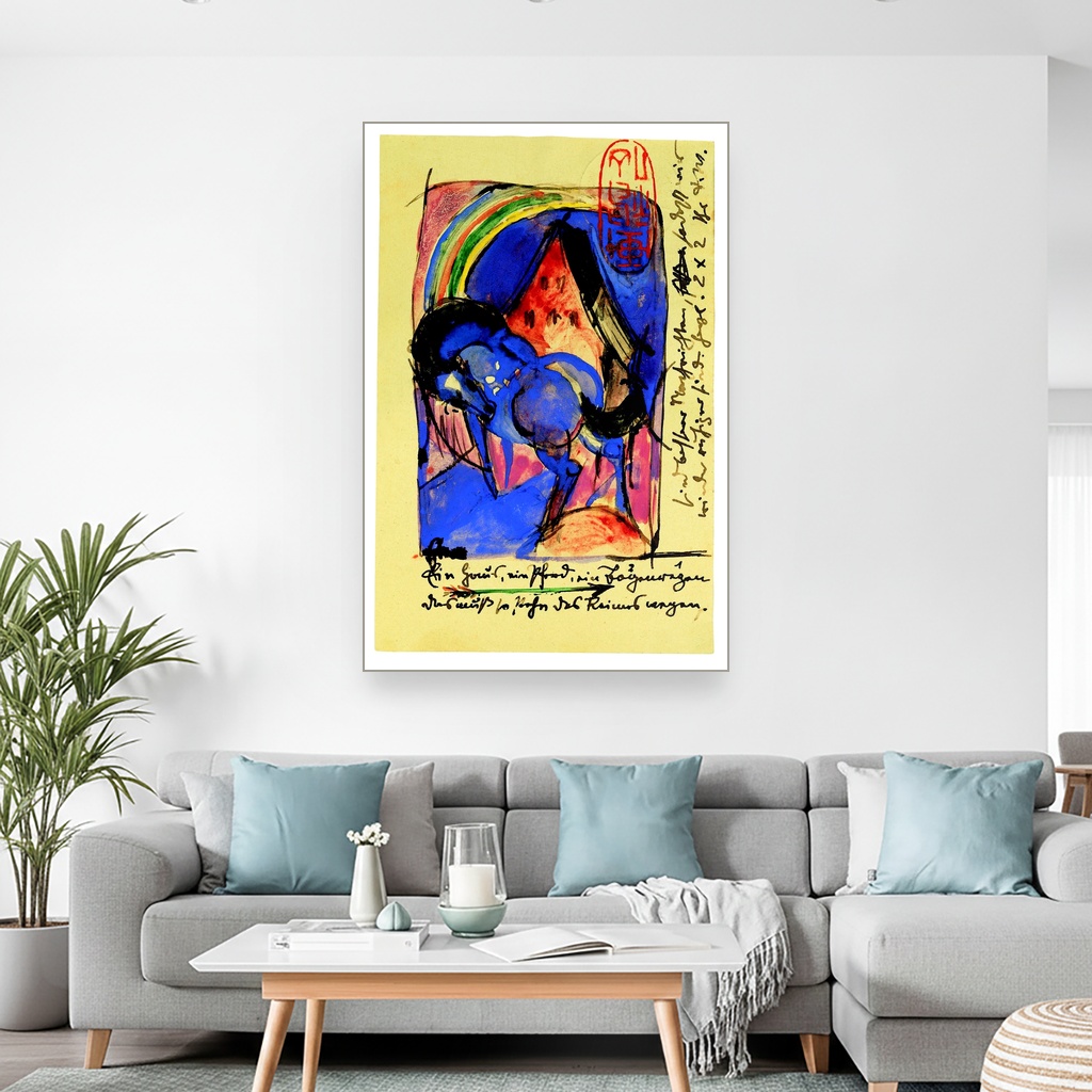 Ova slika zrači energijom i radošću kroz živopisni plavi konj, crvenu kuću i šarenu dugu koja unosi optimizam u svaki prostor. Idealna je za dnevni boravak ili kreativni kutak gde želite da probudite inspiraciju i vedrinu. Reprodukcija dela Franza Marca donosi autentičnu emociju ekspresionizma koja oplemenjuje svaki zid.