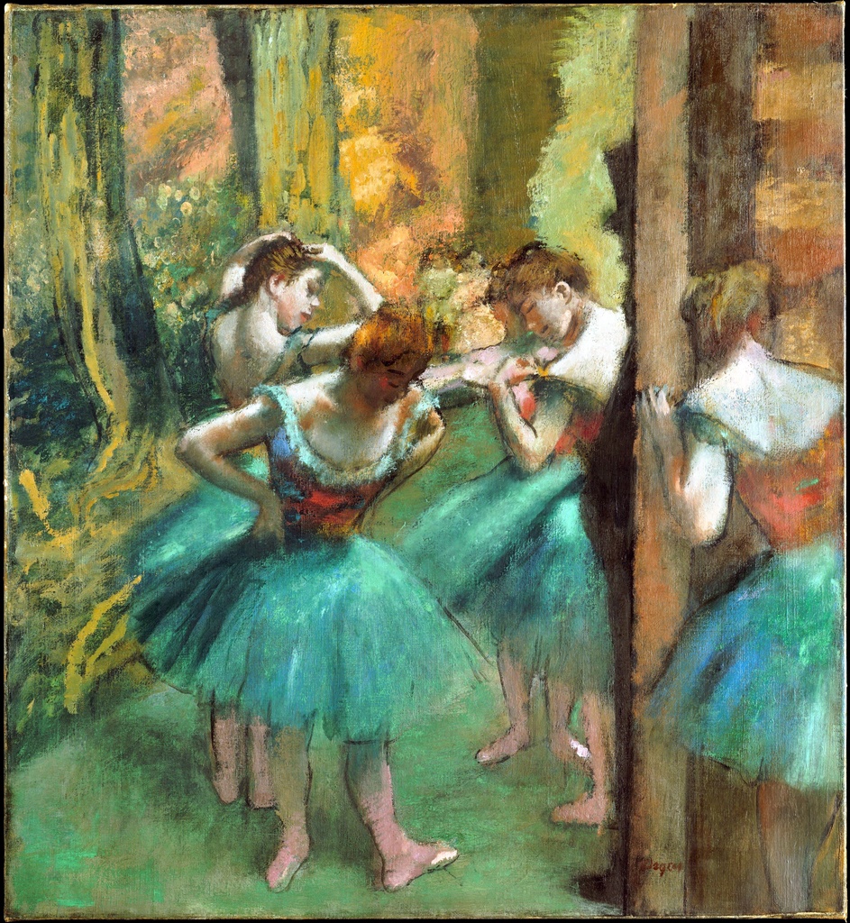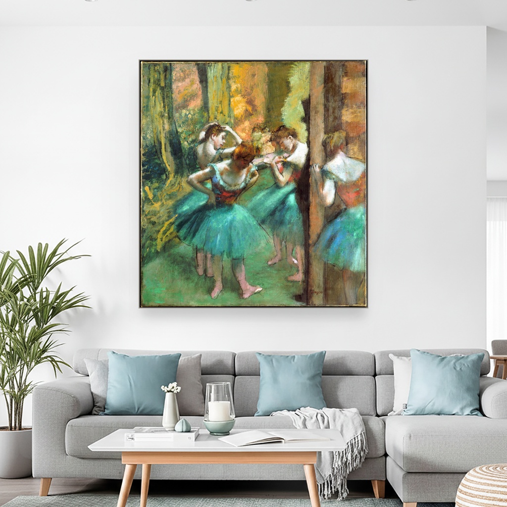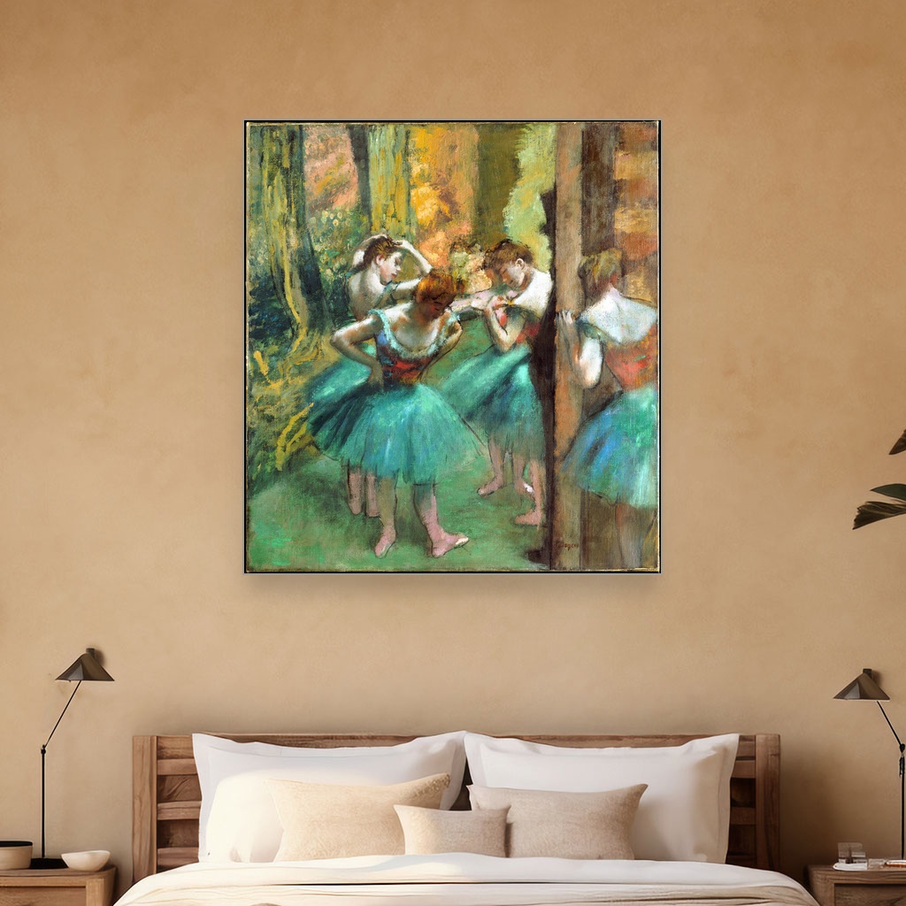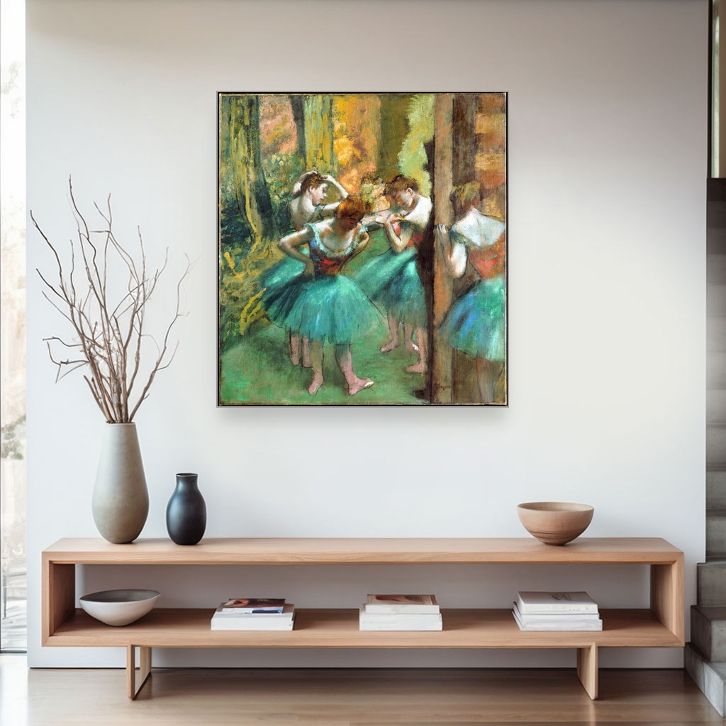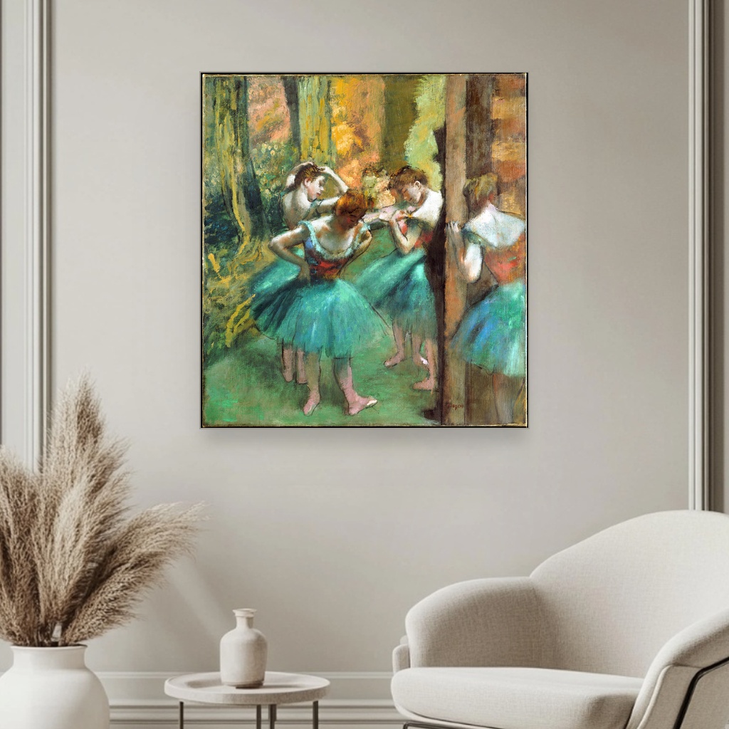 Plesačice u roze i zelenom, Edgar Degas, Dancers Pink and Green, slika na platnu reprodukcija slike na platnu predstavlja remek-delo impresionističkog majstora koji je neumorno tragao za hvatanjem pokreta i intime baletskog sveta.