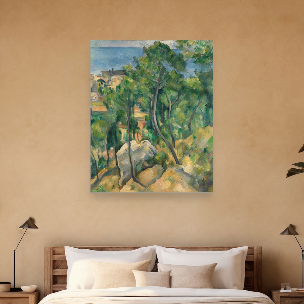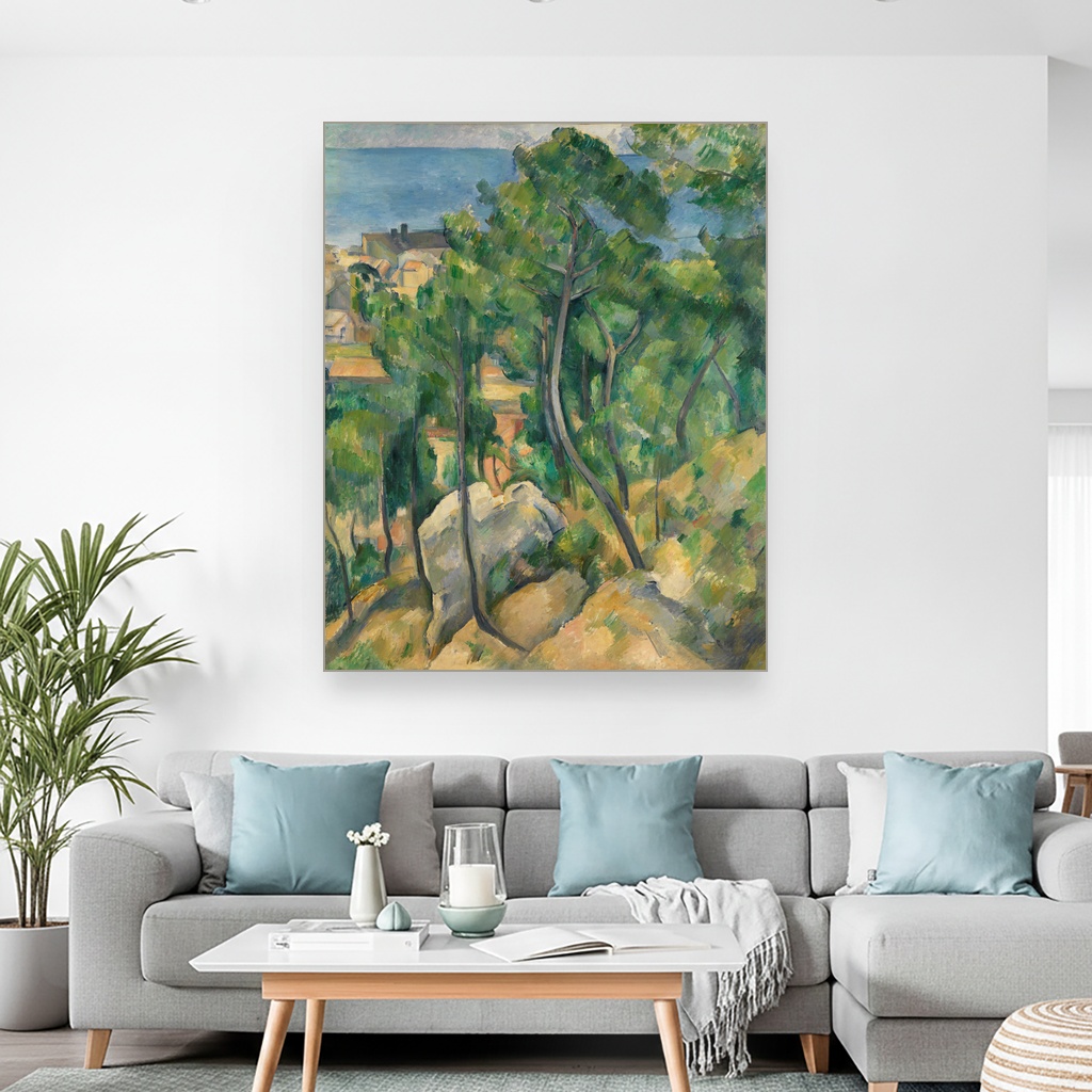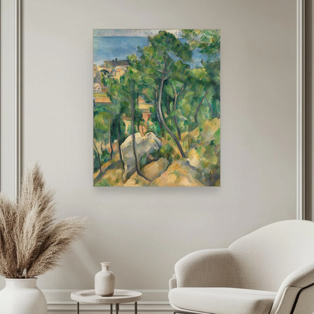 Ova reprodukcija slike na platnu odražava duh postimpresionizma i umetnički pravac u kome je Cézanne bio pionir, pretvarajući pejzaž u apstraktnu harmoniju linija i boja.