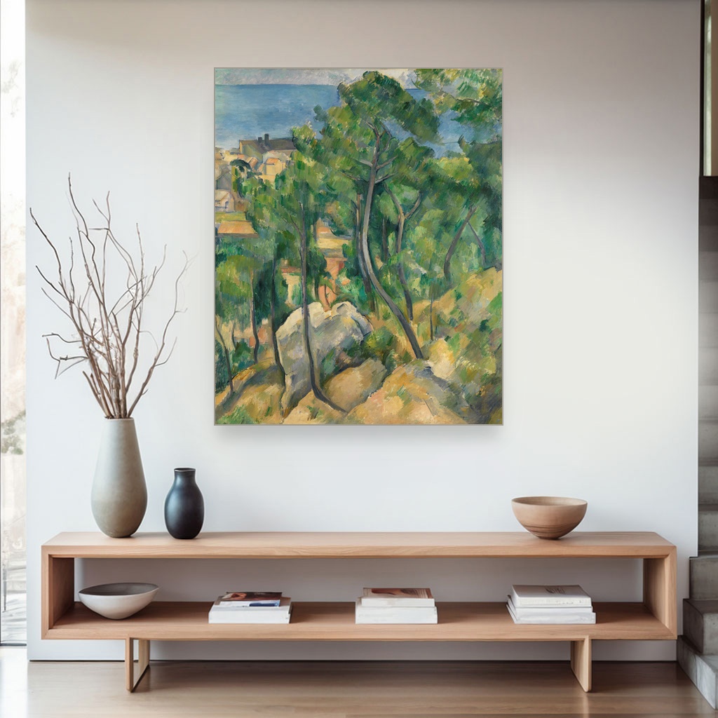 Kroz slojeve boja i jasno definisane oblike, Cézanne nas vodi kroz prostranstvo mora i brežuljaka, stvarajući kompoziciju koja odiše tišinom i unutrašnjom snagom.