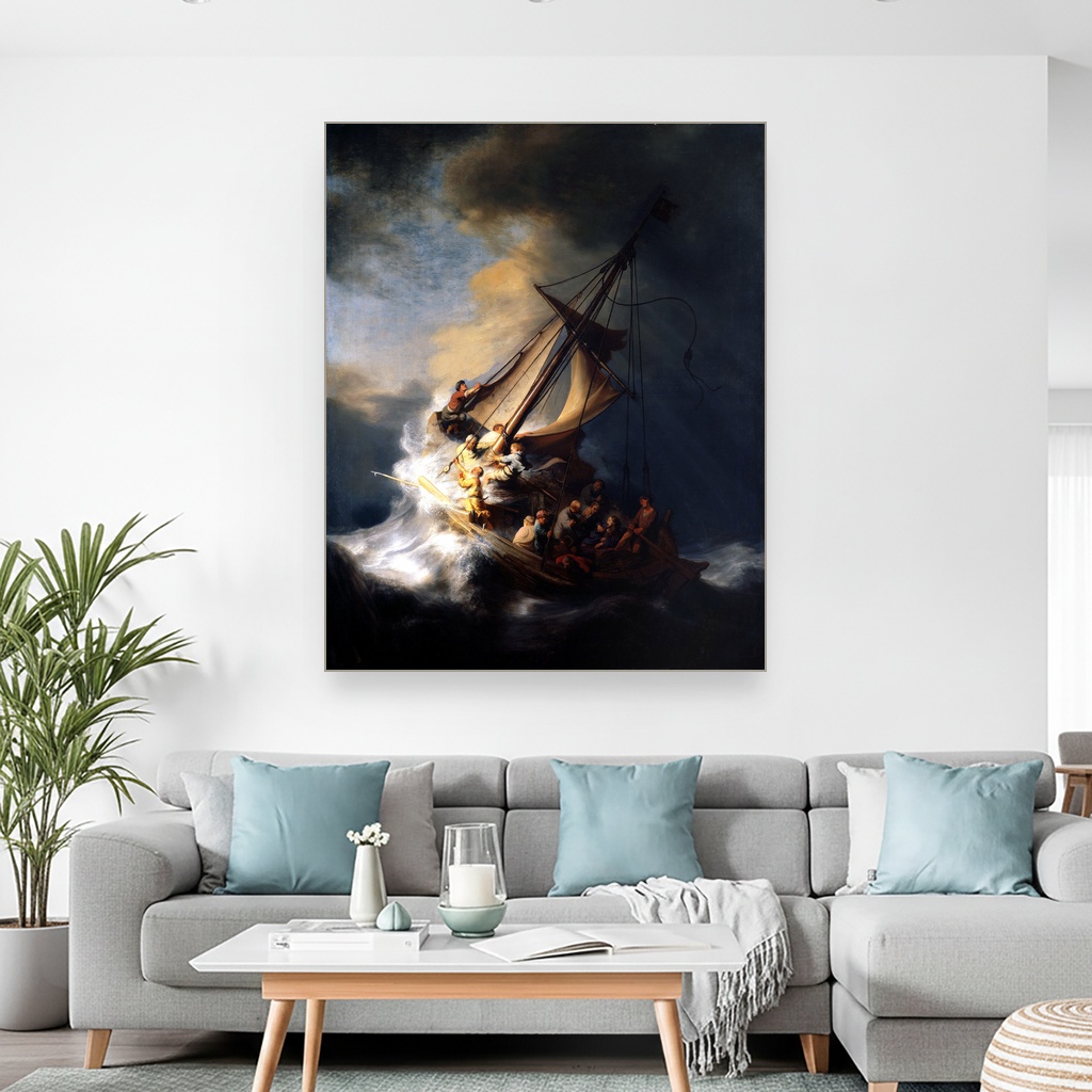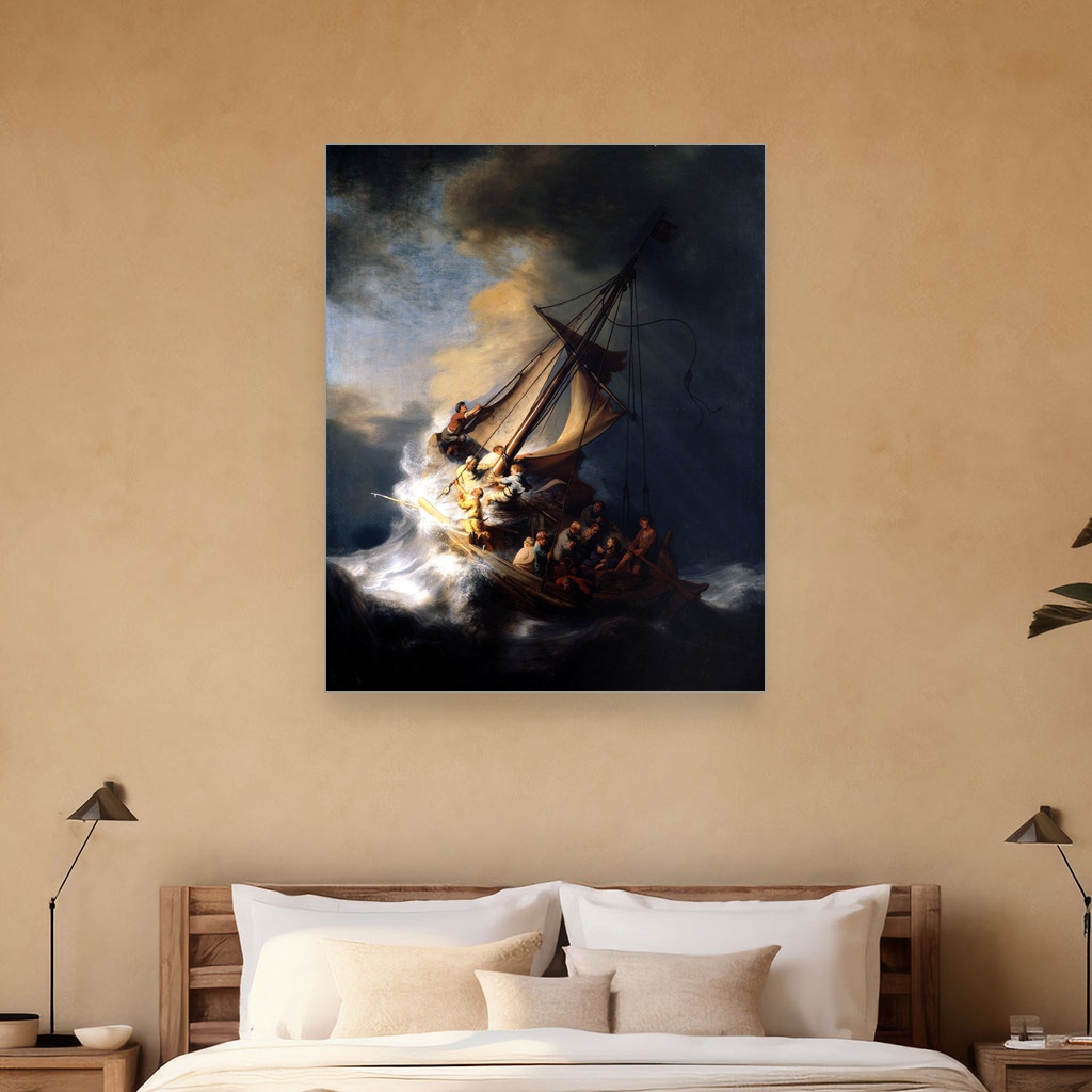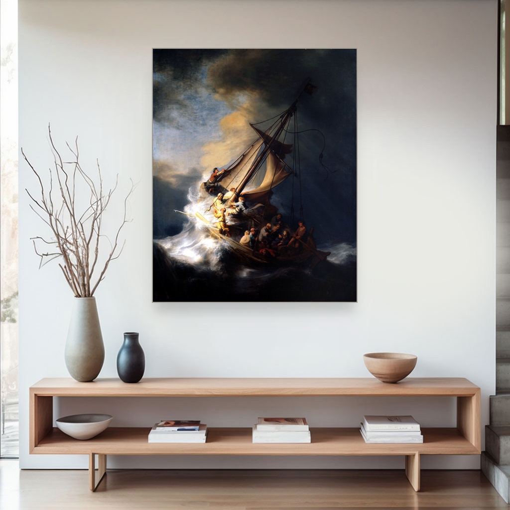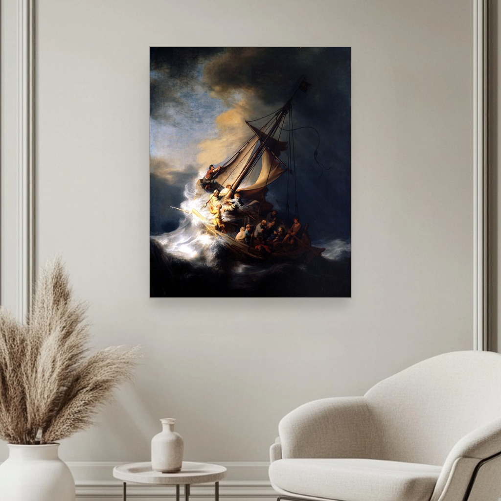 Divlja energija oluje na Galilejskom moru oživljava na ovom moćnom platnu, donoseći intenzitet i dramatičnost svakom pogledu. Savršena je za dnevni boravak ili radni prostor gde želite da unesete snagu i dubinu inspiracije. Ova reprodukcija nosi autentičnu emotivnu težinu originala, čineći je dragocenim umetničkim detaljem u vašem domu.