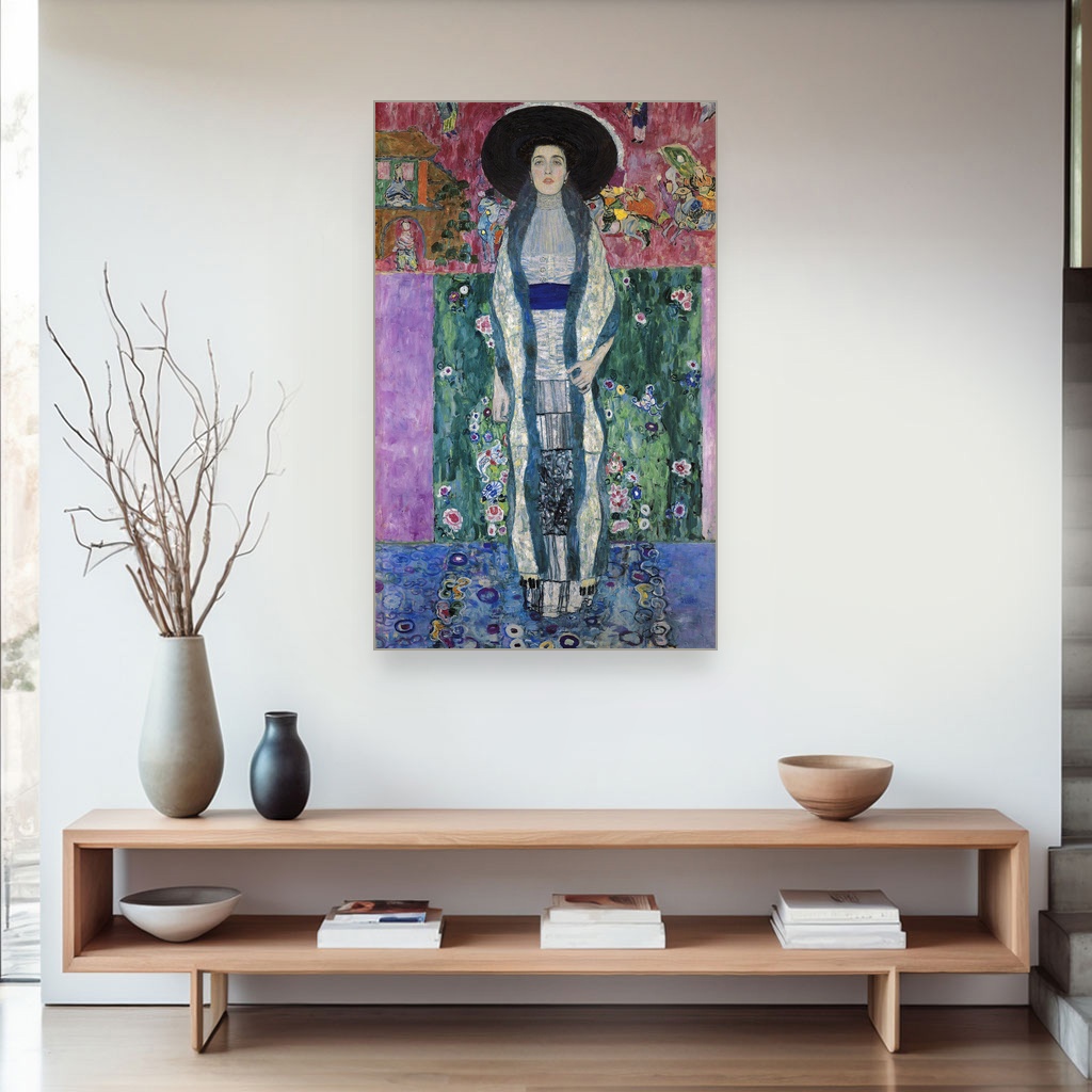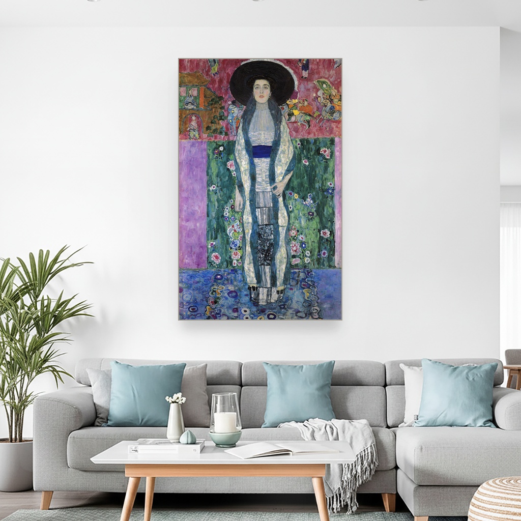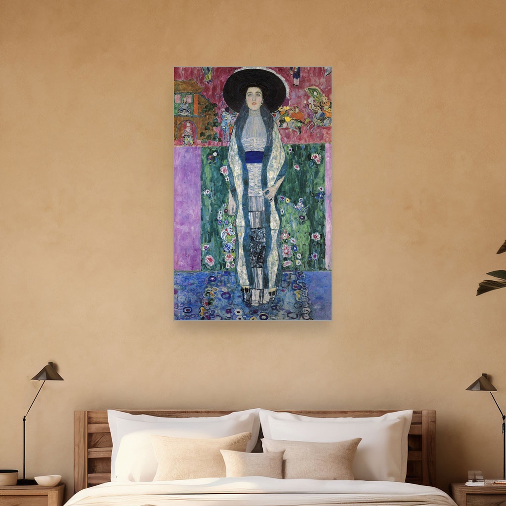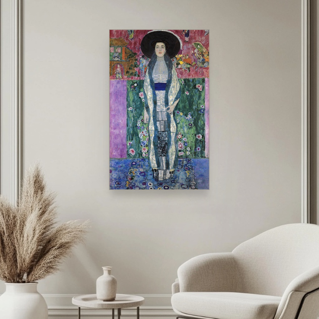 Tehnika štampe na platnu ovde oživljava delikatne uzorke i bogate teksture koje Klimt koristi da bi uhvatio suptilnu lepotu i moć Adele Bloh-Bauer.