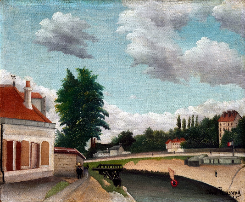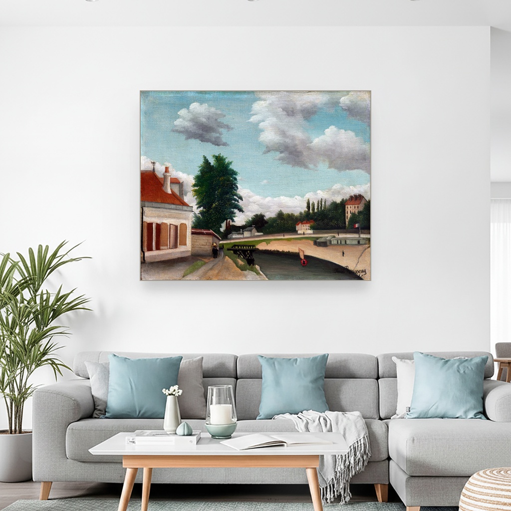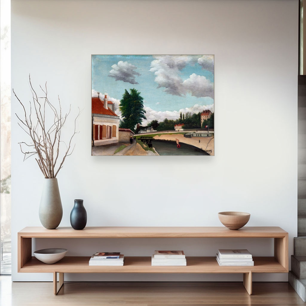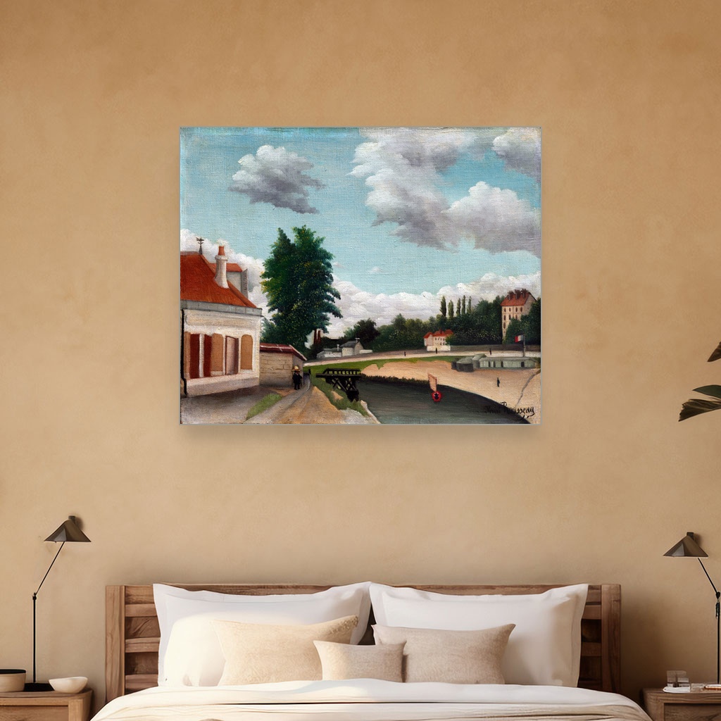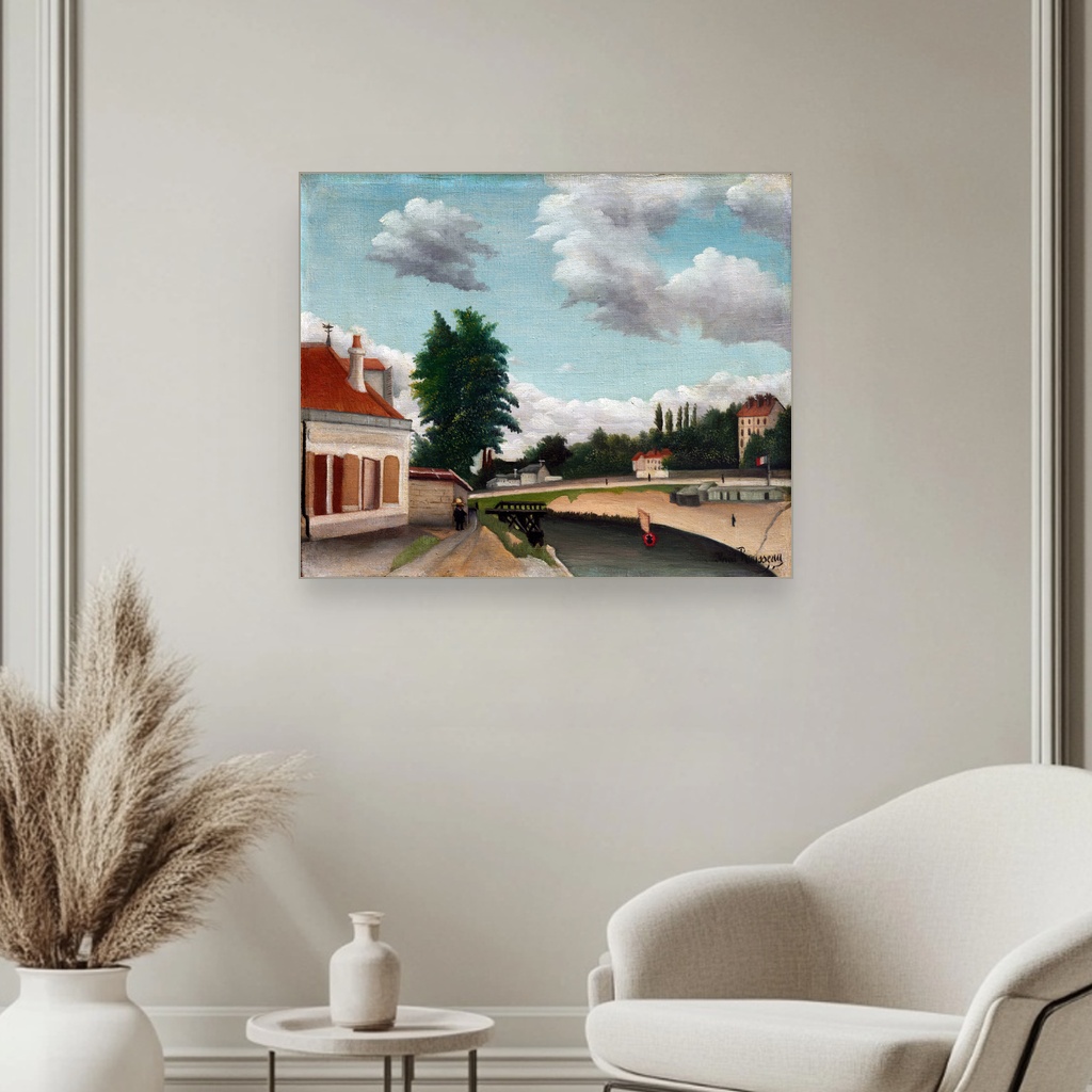 Henri Rousseau, poznat po svom naivnom stilu i bogatom koloritu, ovom reprodukcijom vodi nas kroz mirne ulice predgrađa Pariza, gde se susreću idealizam i stvarnost urbanog života.