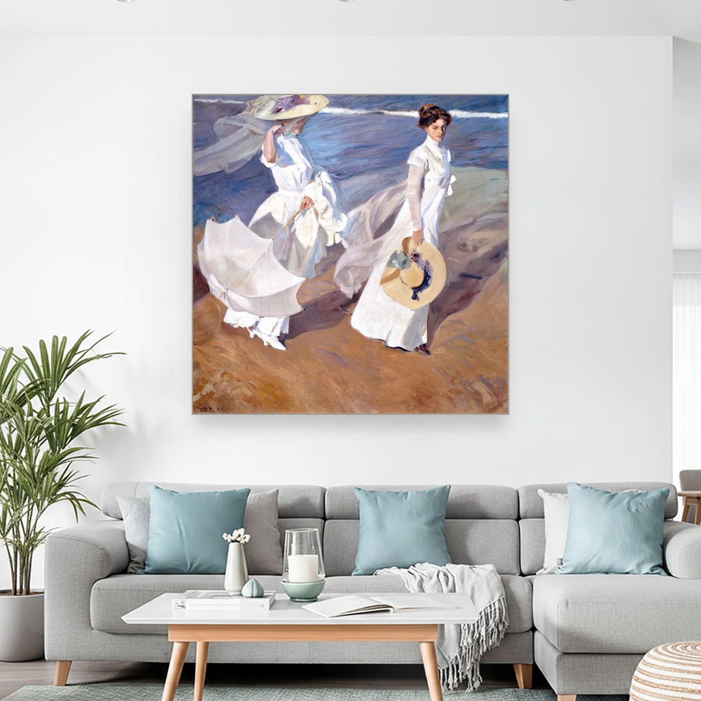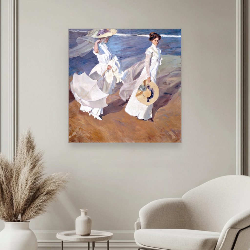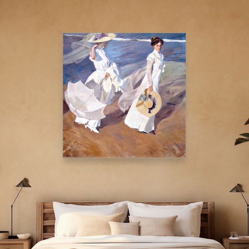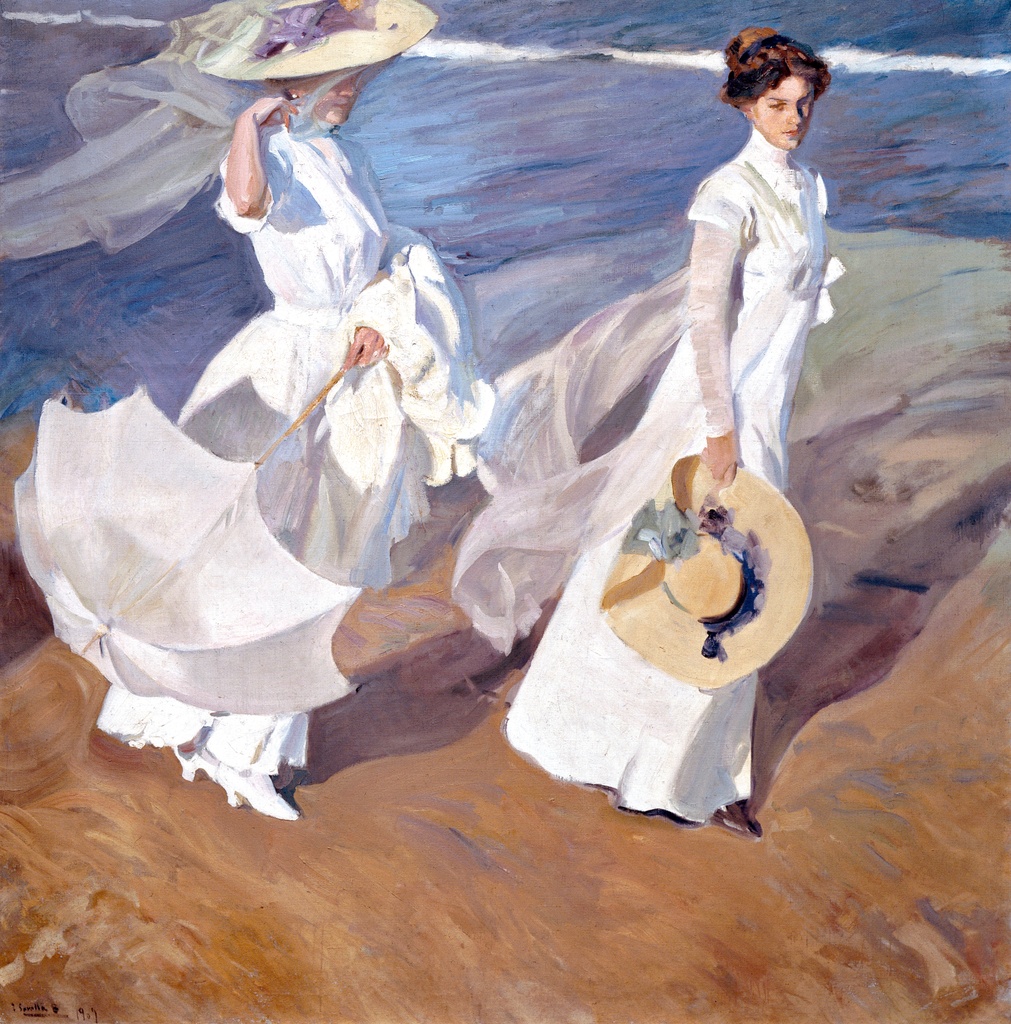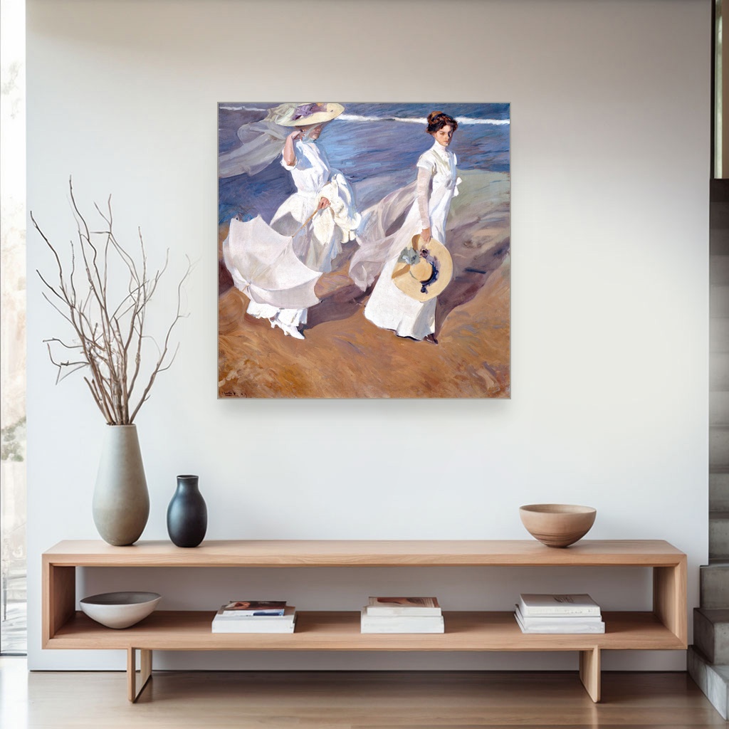 Šetnja pored obale, Joaquín Sorolla y Bastida, Strolling along the Seashore, slika na platnu donosi živopisnu scenu koja osvetljava trenutke protkane svetlom i pokretom.
