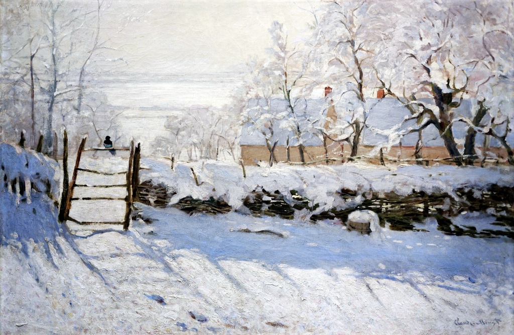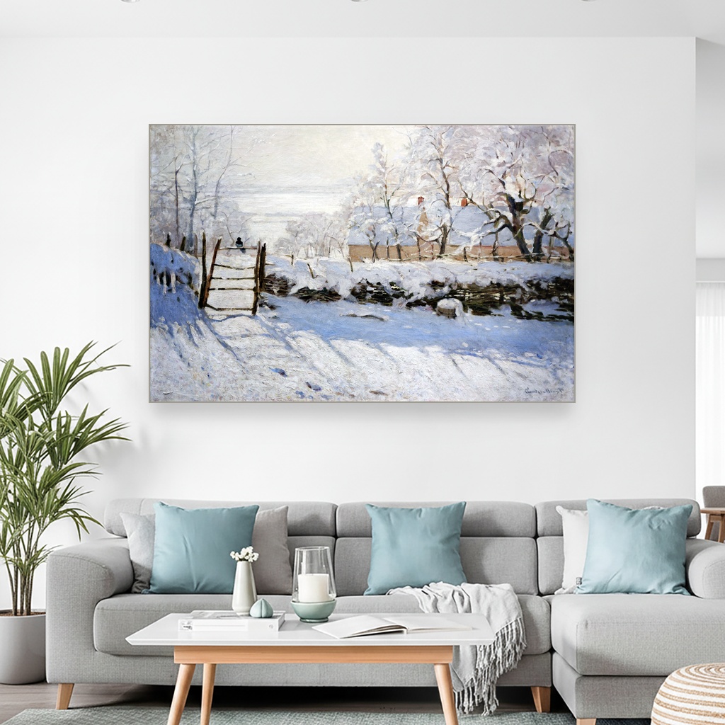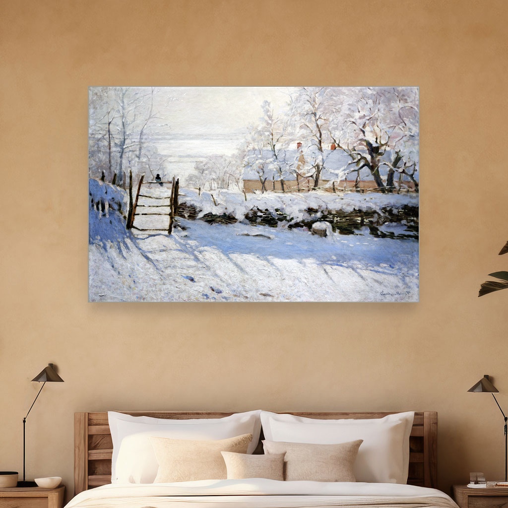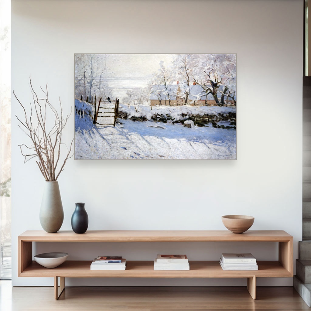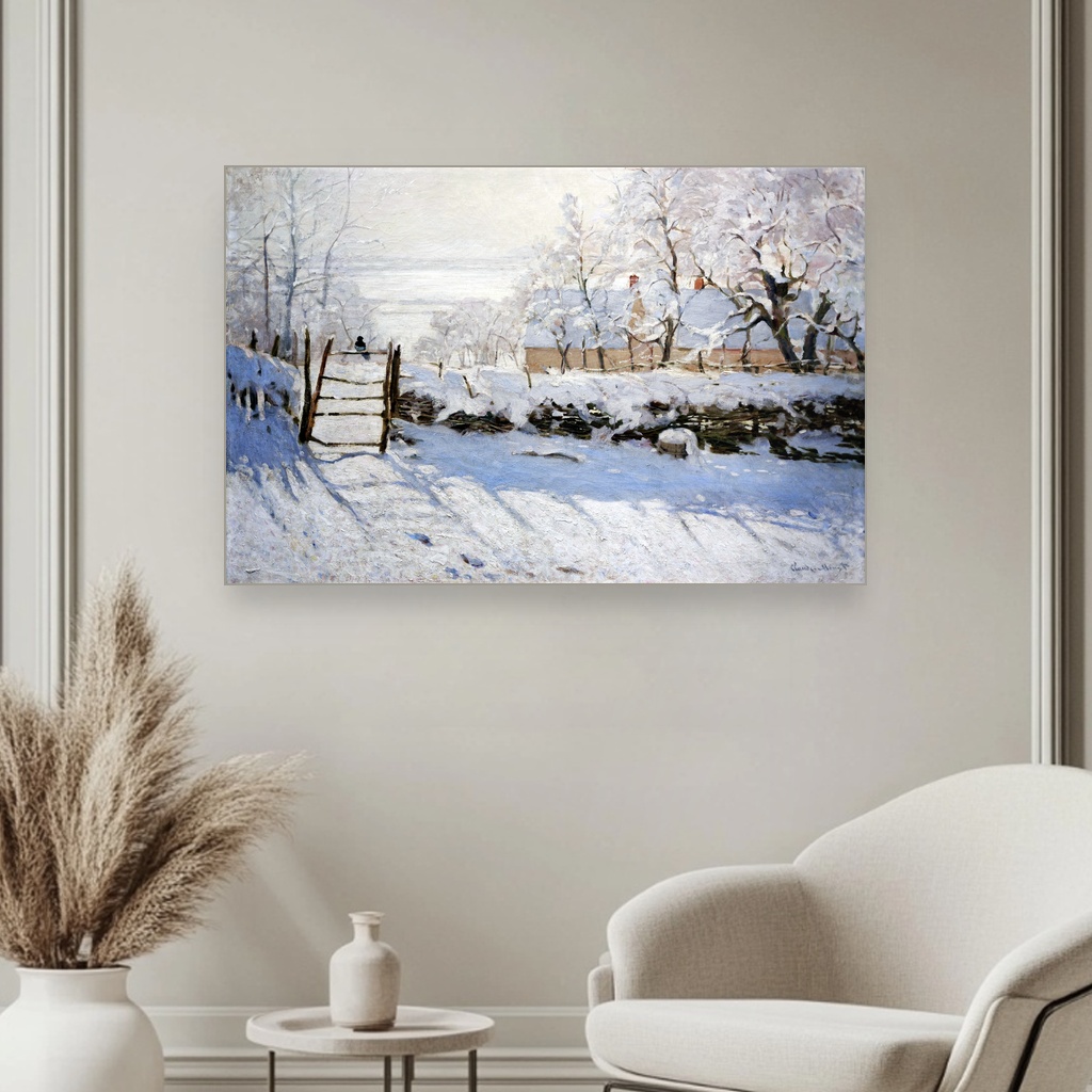 Ova umetnička reprodukcija na platnu oslikava jedan od najpoznatijih motiva iz Monetove zimske faze, kada je slikar beležio hladnu, mirnu atmosferu snežnih pejzaža sa preciznim i razigranim potezima četkice.