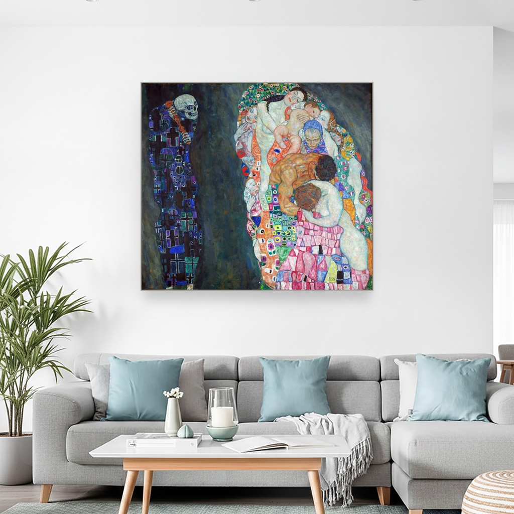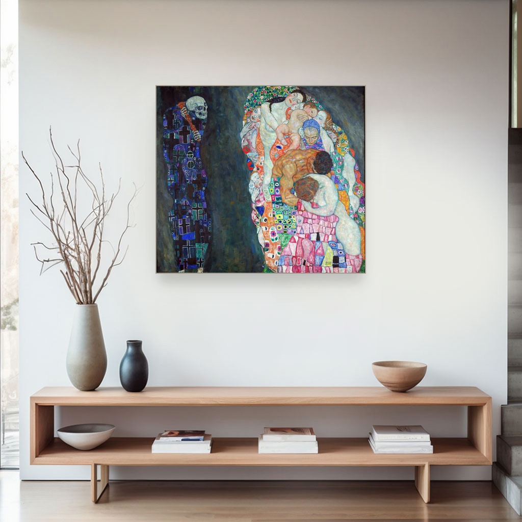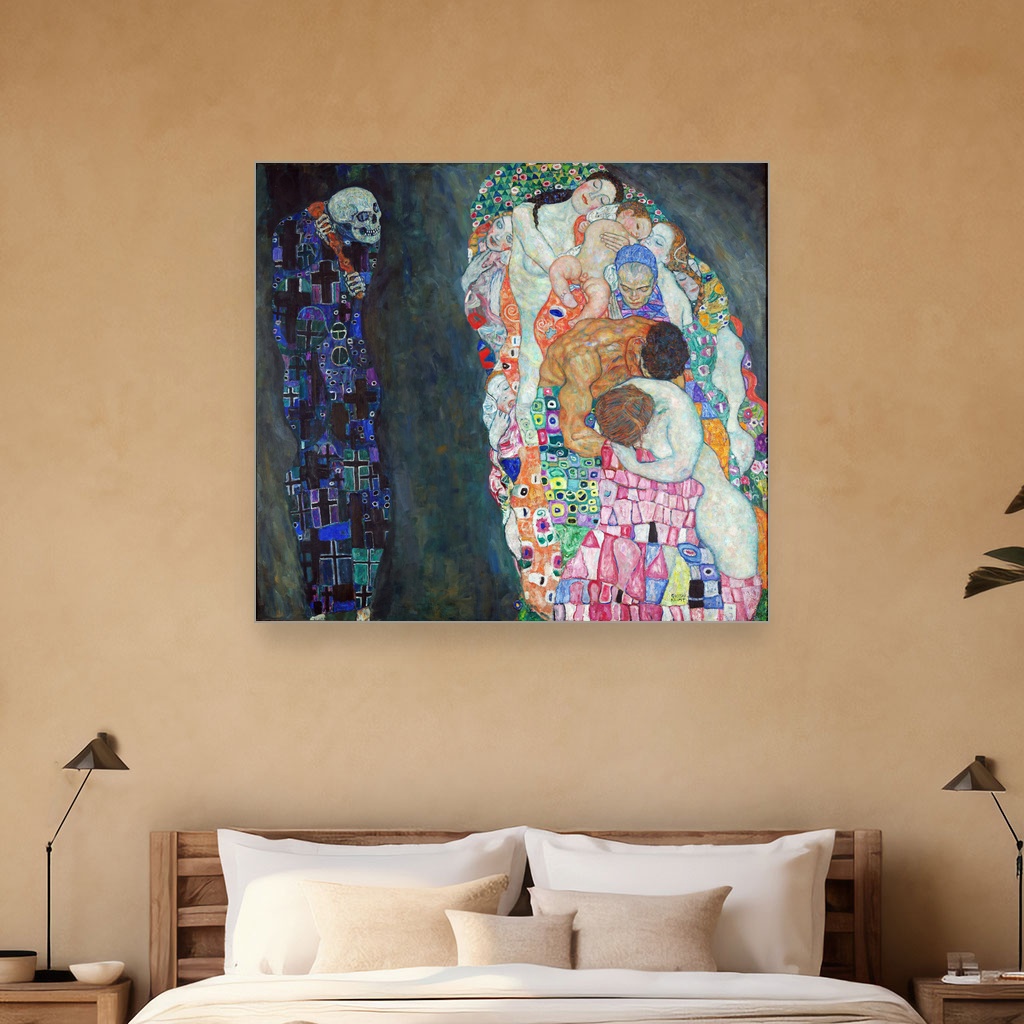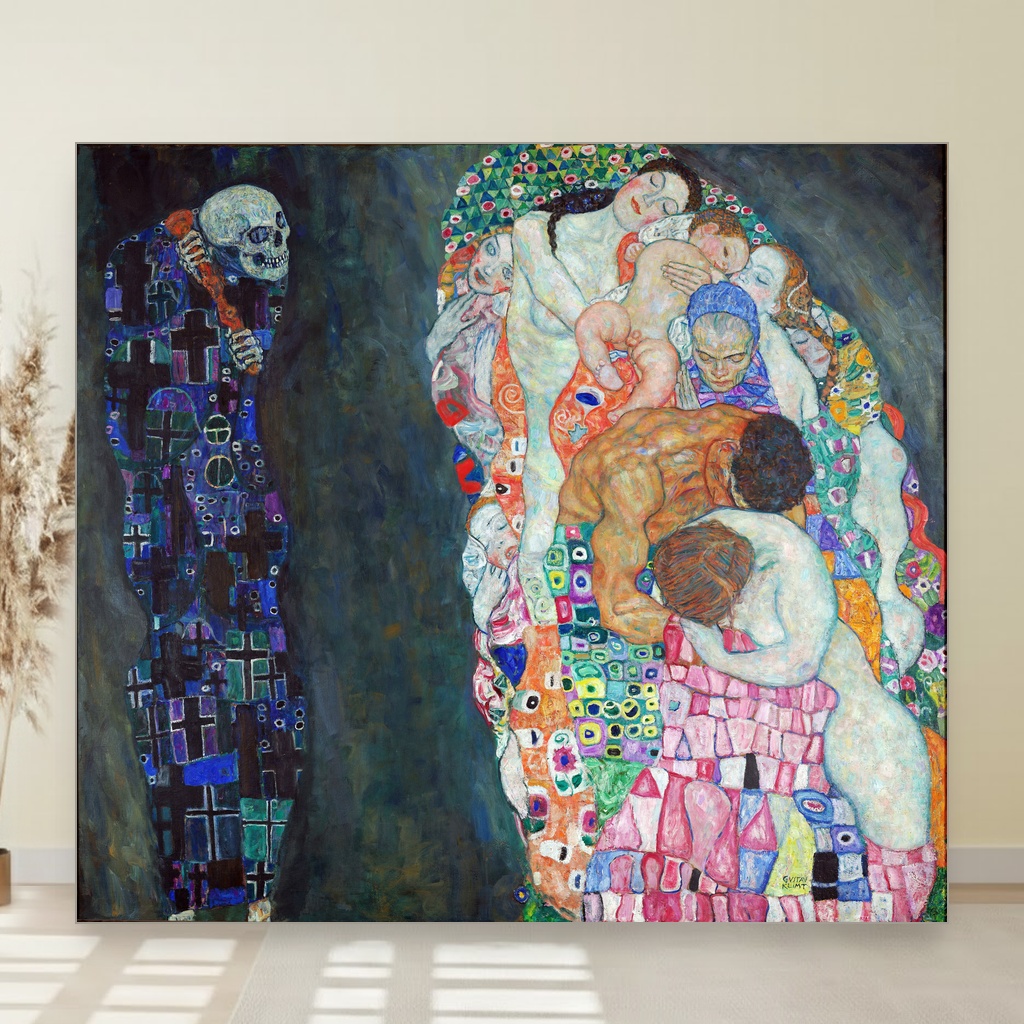 Ova slika na platnu oduzima dah svojom dubokom simbolikom života i smrti, protkana emotivnom snagom i suptilnim detaljima. Idealna je za dnevni boravak ili radni prostor gde će podsticati na razmišljanje i stvarati atmosferu introspektivnog mira. Reprodukcija ovog dela unosi bezvremenost Klimtovog majstorstva u vaš dom, donoseći slojeve značenja i umetničke elegancije.
