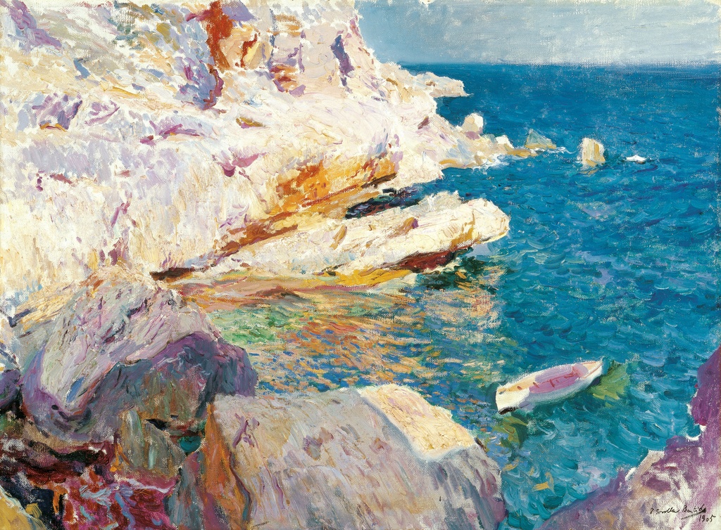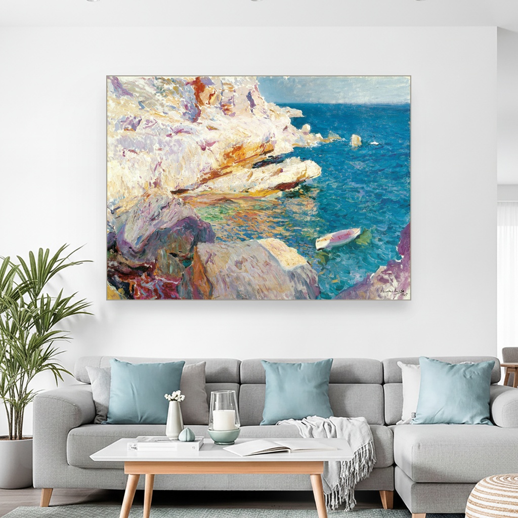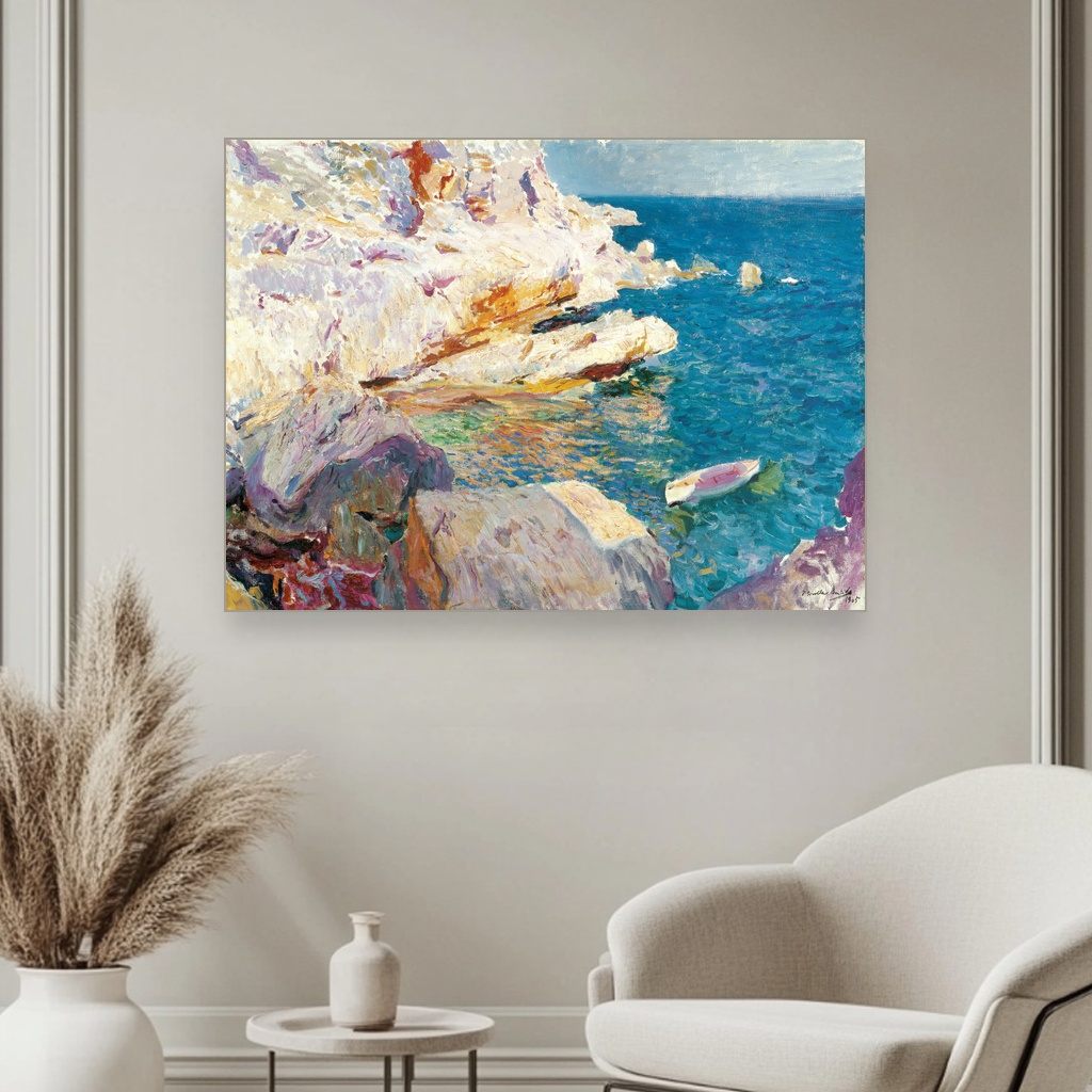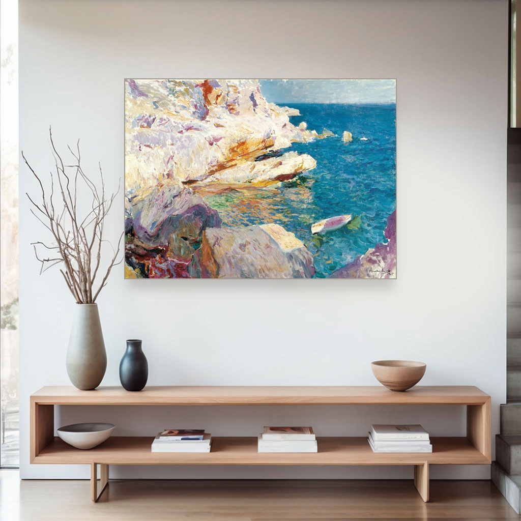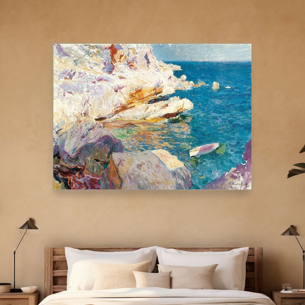 Stene u Haviji, Joaquín Sorolla y Bastida, Rocks at Jávea The White Boat, slika na platnu reprodukcija slike na platnu donosi pogled na mediteranski pejzaž kroz oči majstora svetlosti.