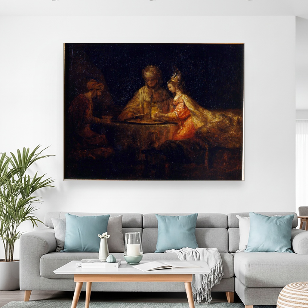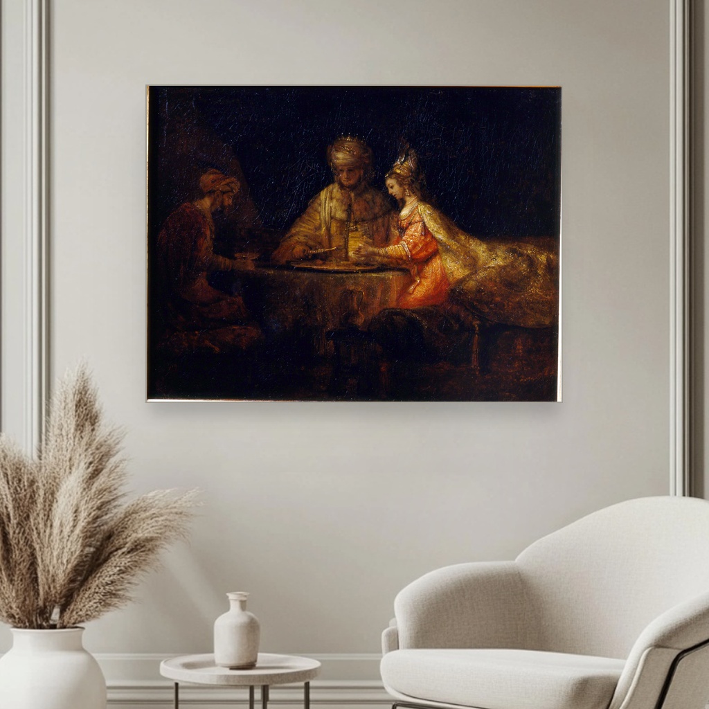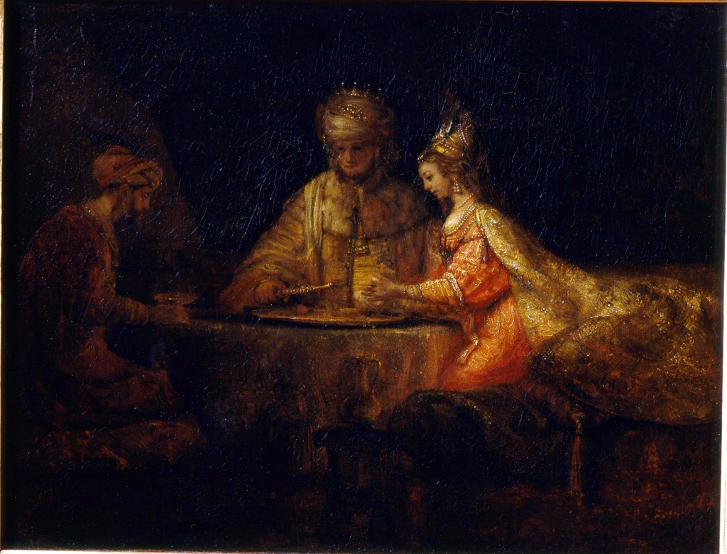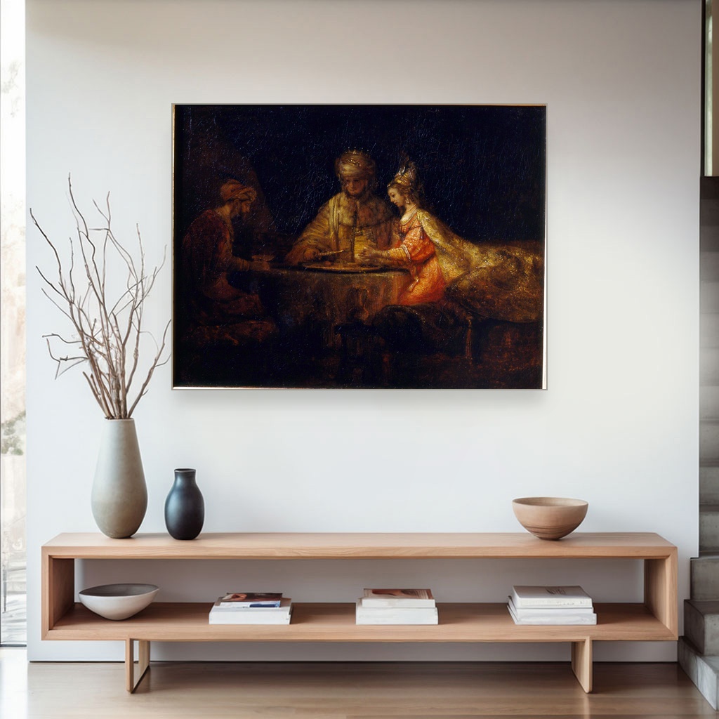 Ahasver, Aman i Ester, Rembrandt van Rijn, Ahasuerus Haman and Esther, slika na platnu predstavlja izuzetnu dekorativnu sliku na platnu koja nosi duboku istorijsku i umetničku težinu.