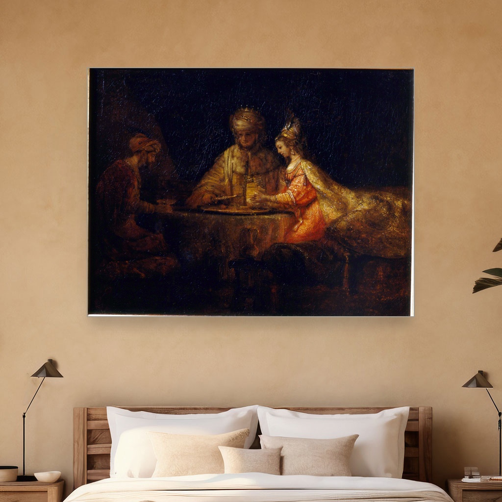 Višedelna slika za zid dodatno doprinosi dinamičnosti prostora, omogućavajući da se priča Ahasvera, Amana i Estere razvija kroz svaki deo platna.