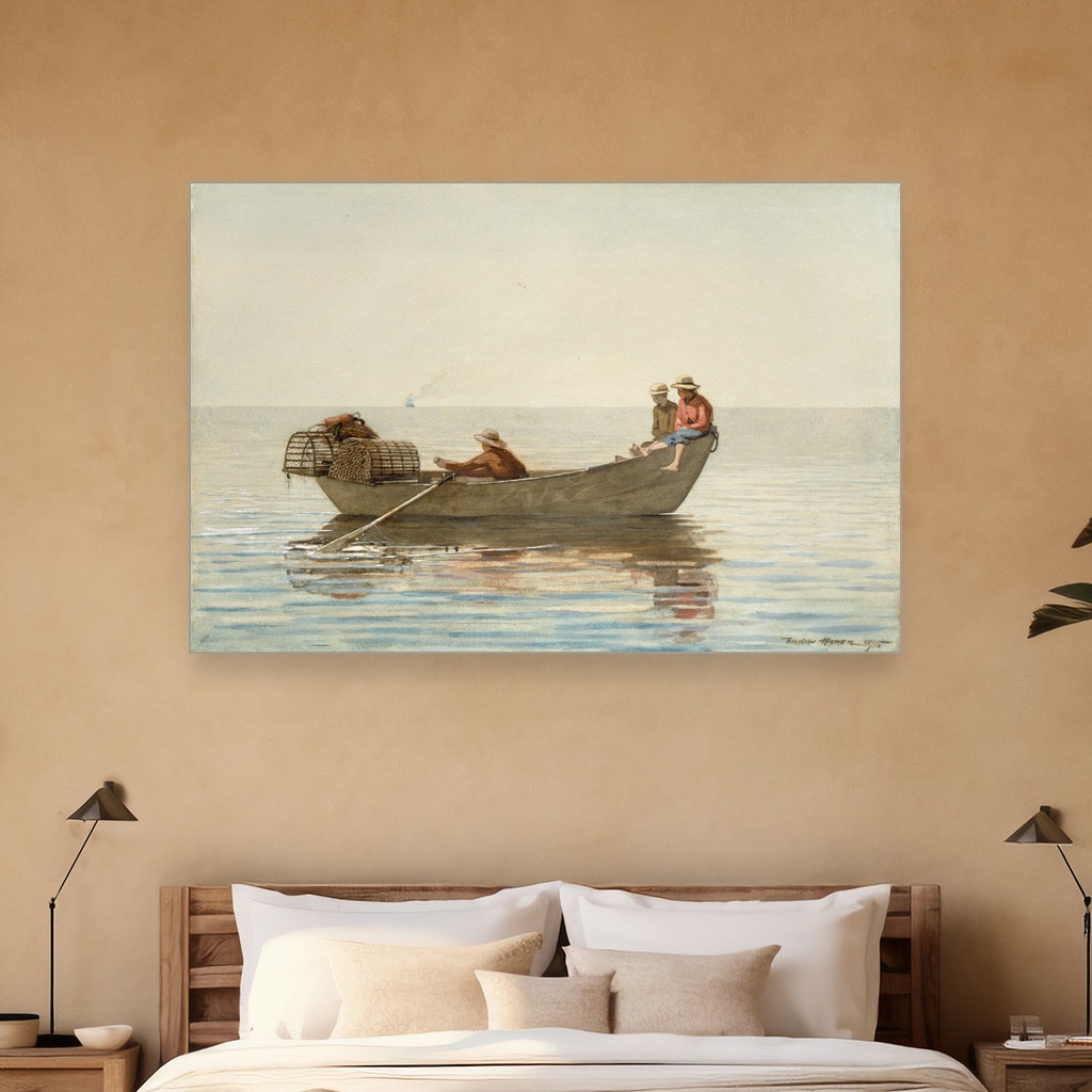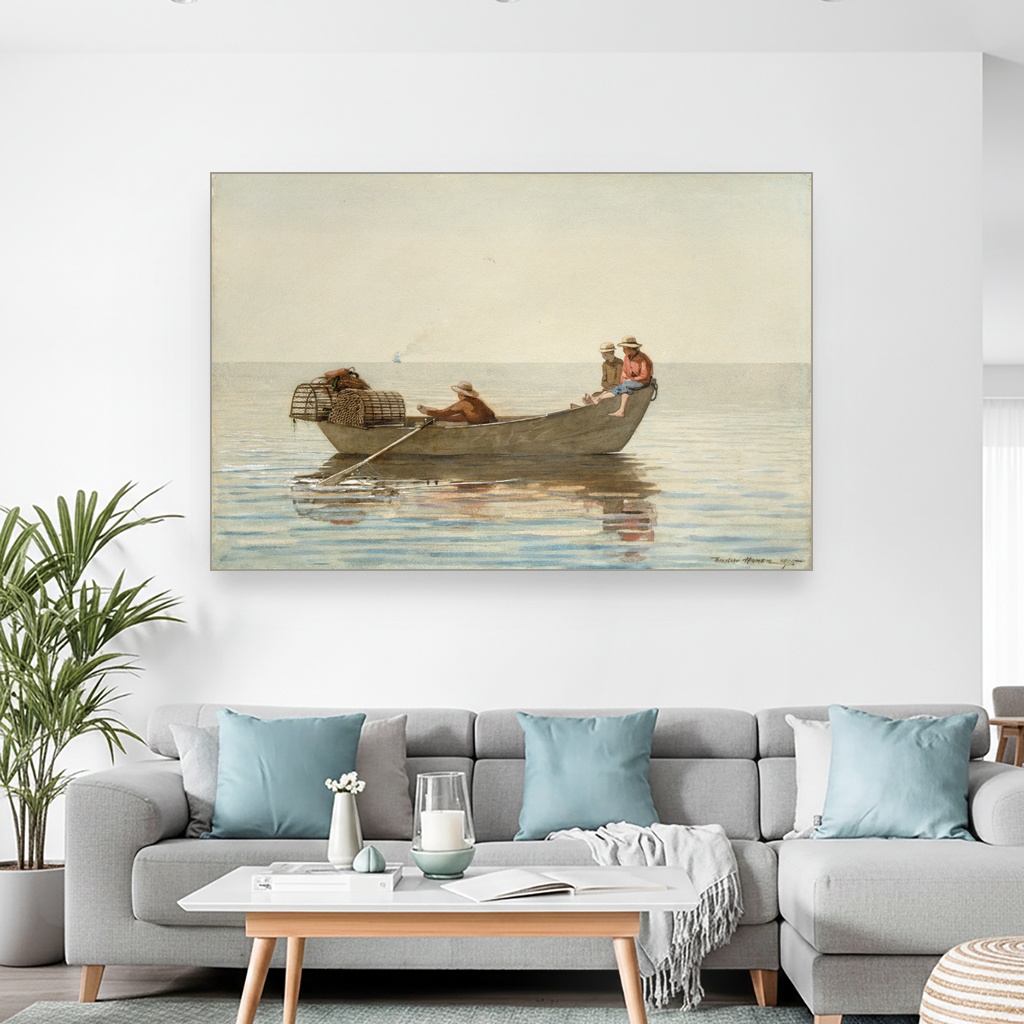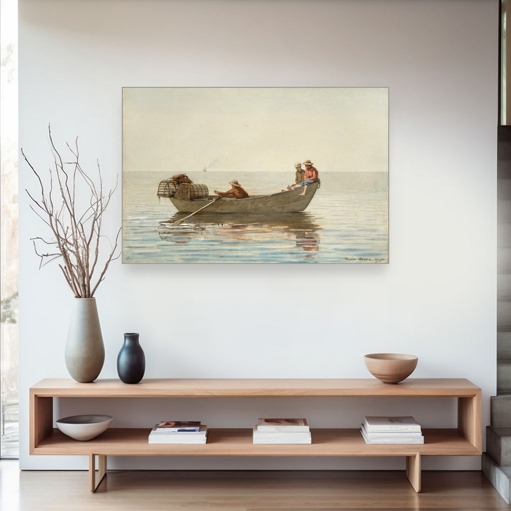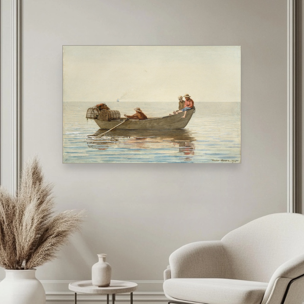 Tri dečaka u čamcu sa korpama za jastoge, Winslow Homer, Three Boys in a Dory with Lobster Pots, slika na platnu reprodukcija slike na platnu otkriva čaroliju svakodnevnog života uz more kroz izuzetnu veštinu ovog američkog majstora.