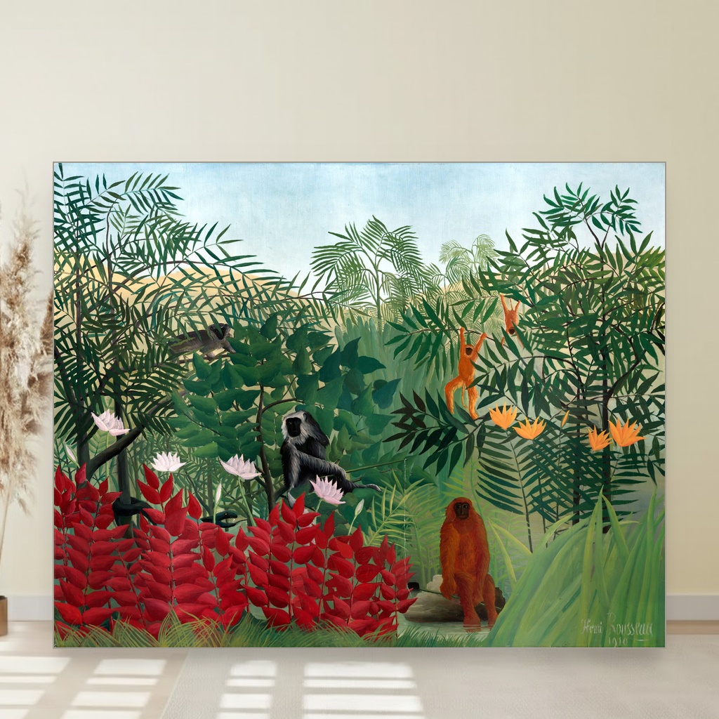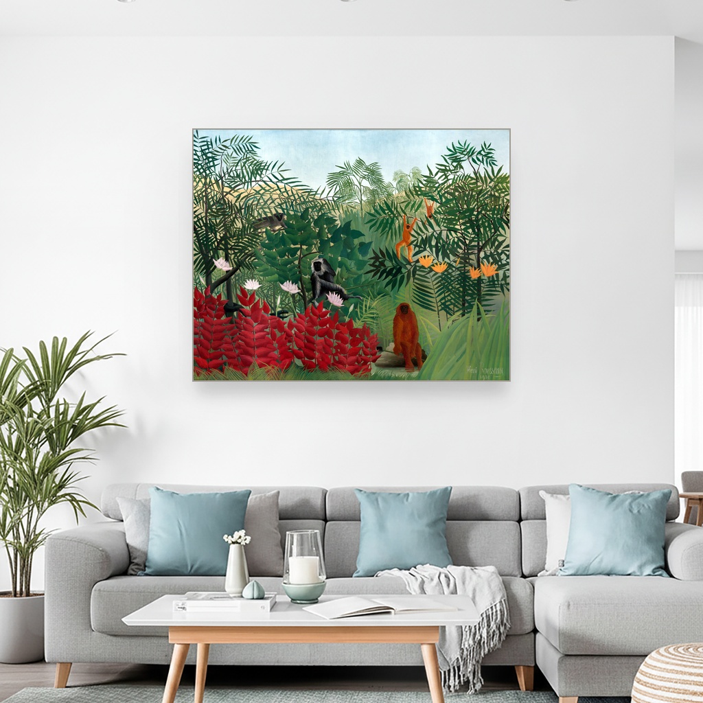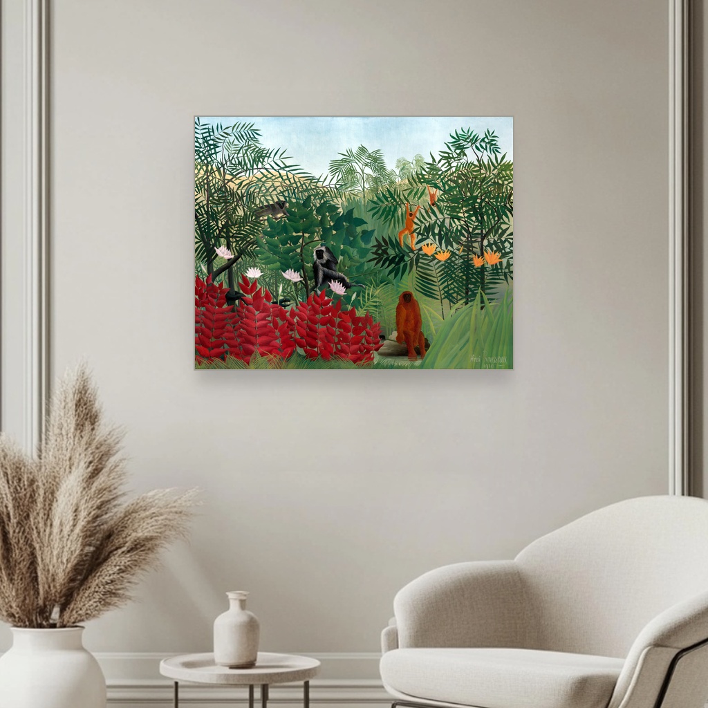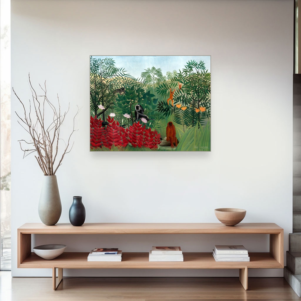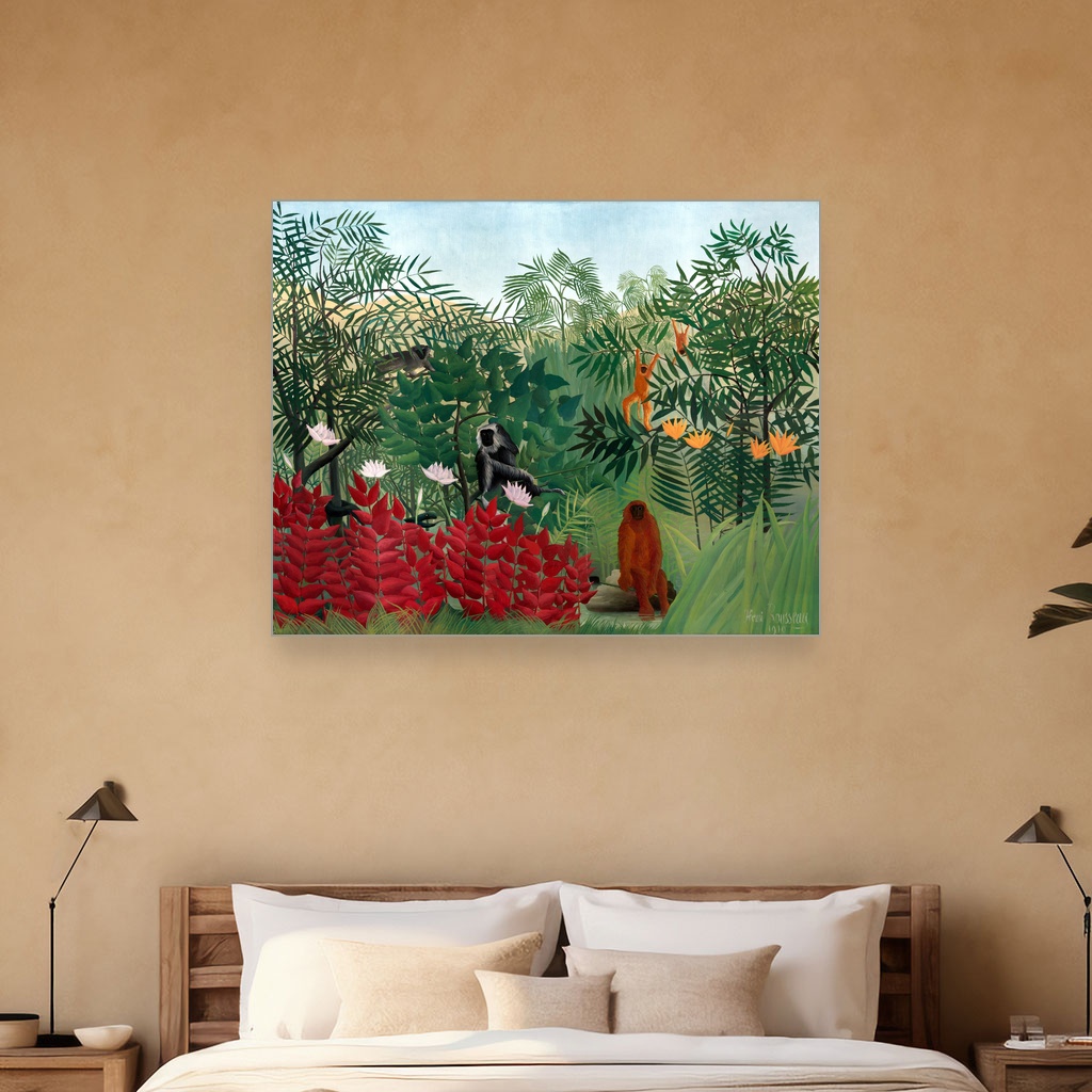 Tropska šuma sa majmunima, Henri Russo, Tropical Forest with Monkeys, slika na platnu donosi jedinstvenu priliku da u svoj dom unesete duh egzotike kroz umetnički pravac slika na platnu koji je osvojio srca mnogih ljubitelja umetnosti.