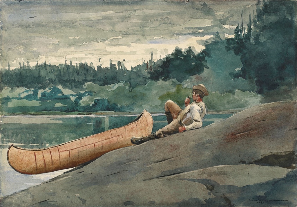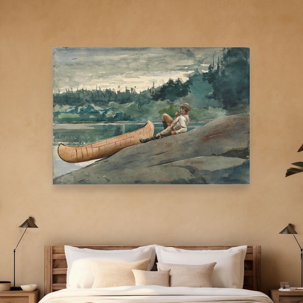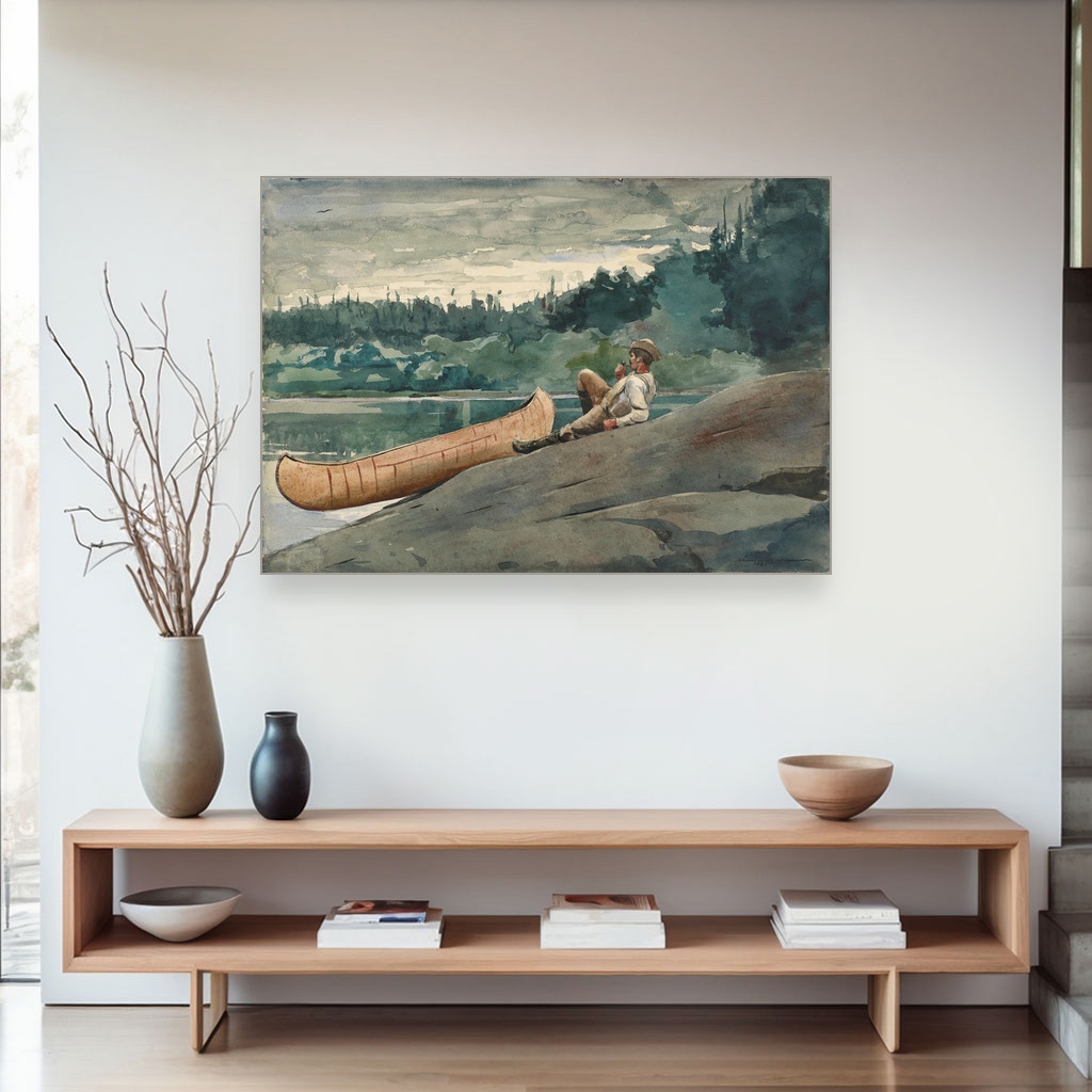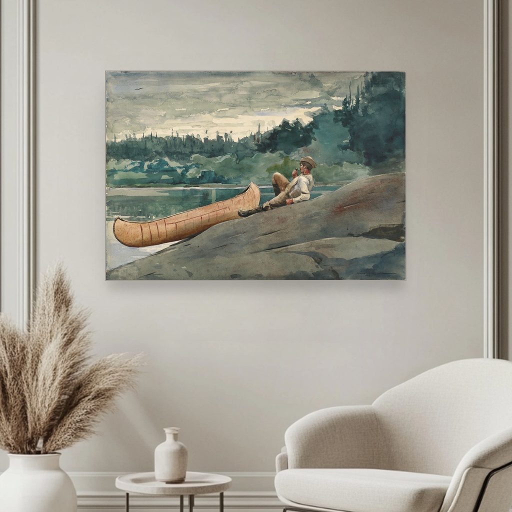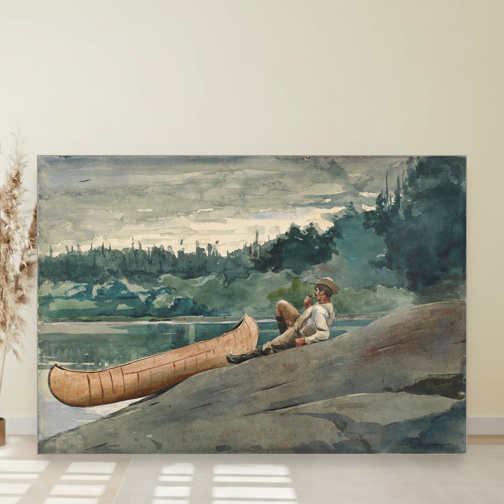 Naslikana krajem 19. veka, ova Winslow Homer štampa na platnu muzejskog kvaliteta osvetljava trenutak introspektivne tišine usred prirode, gde lik vodiča čeka, promišlja i uspostavlja kontakt sa posmatračem.
