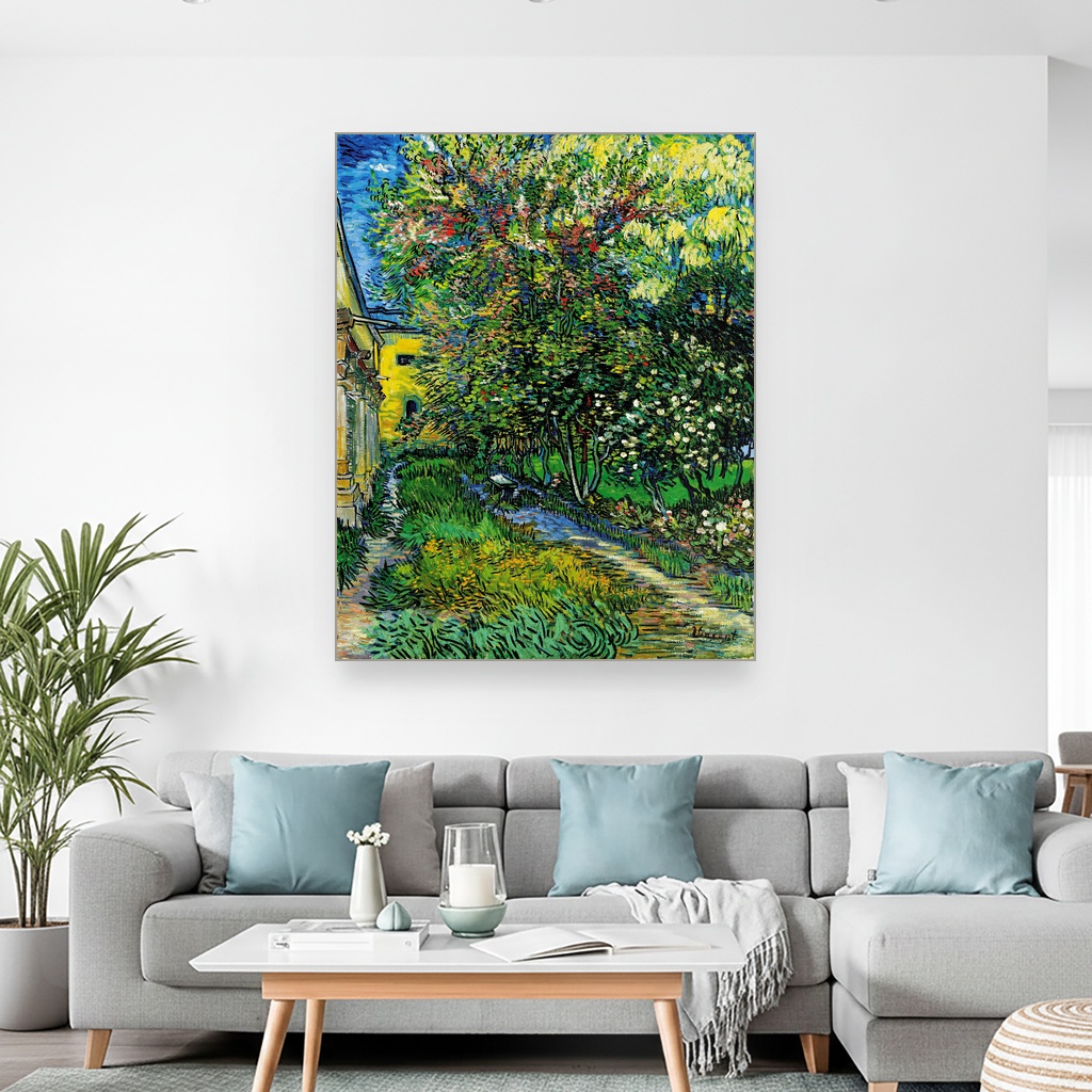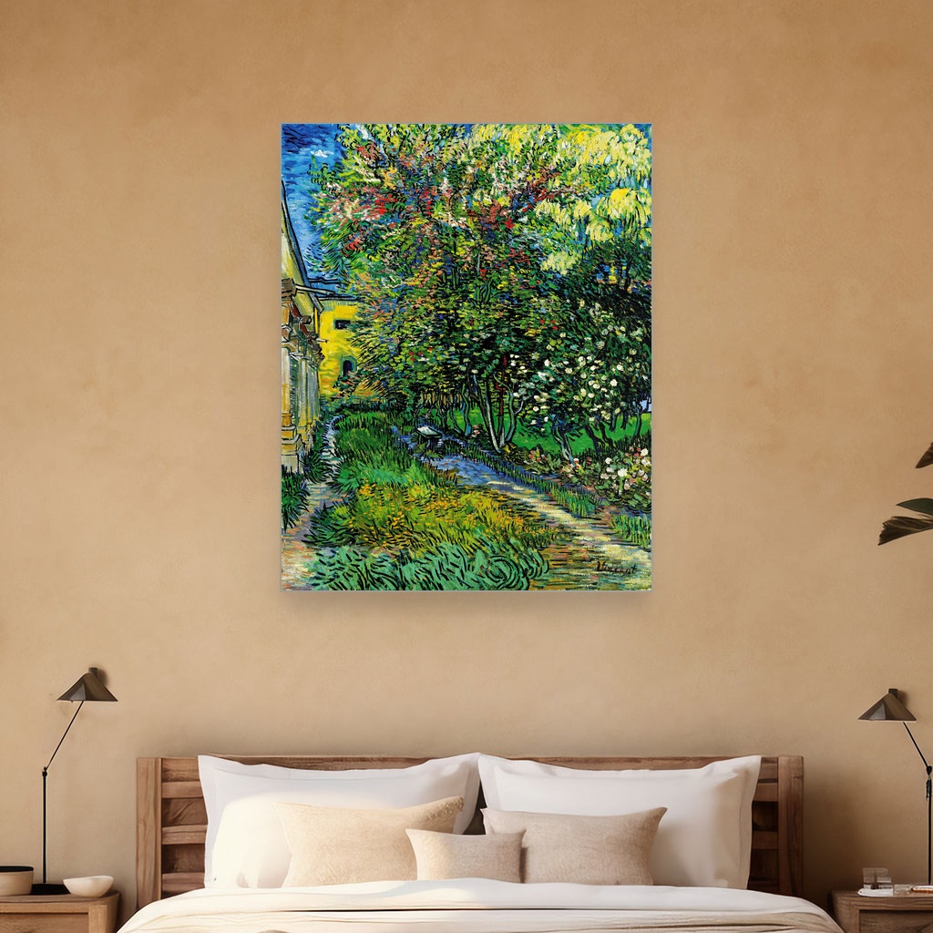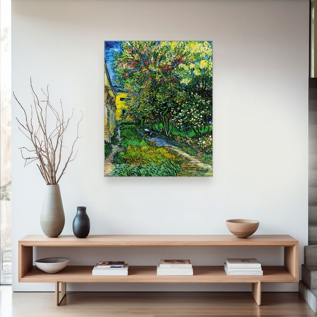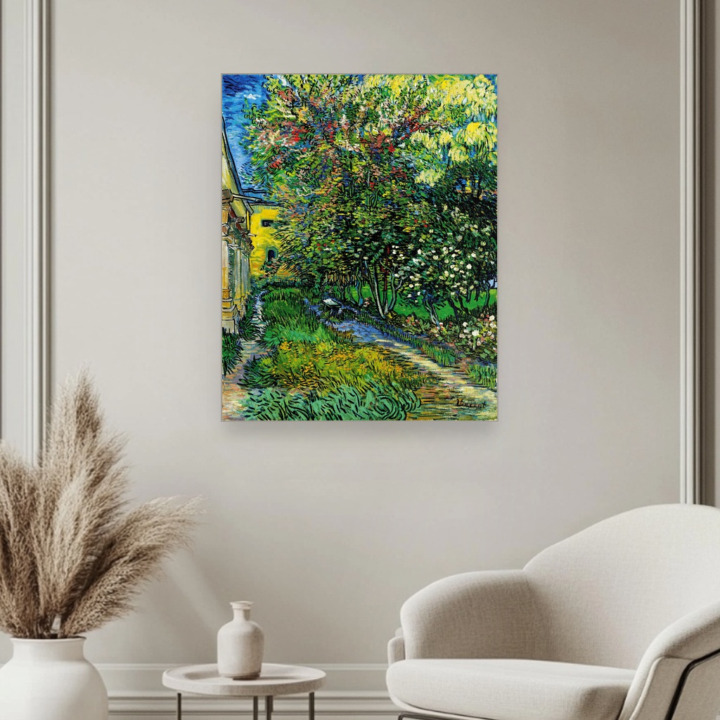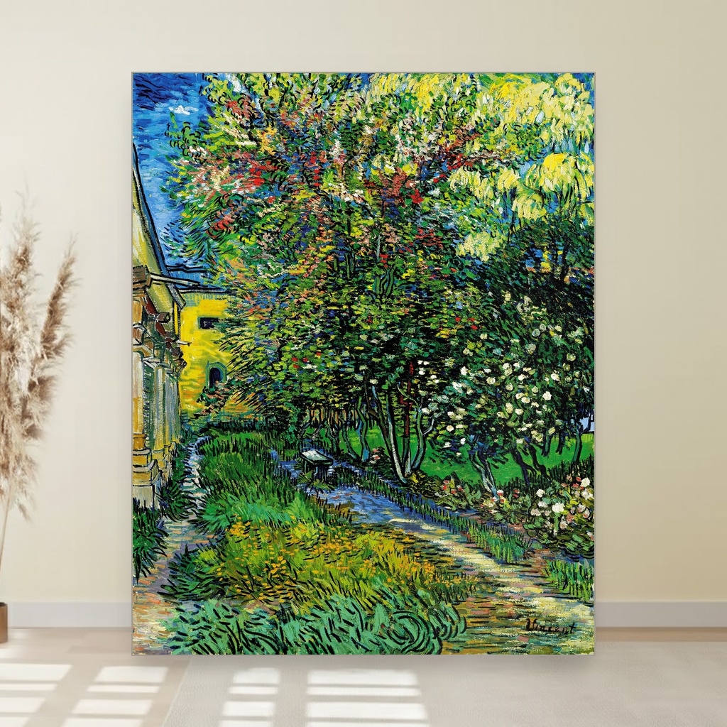 Ova umetnička reprodukcija prikazuje vrt koji je Van Goghu služio kao mesto smirenja i inspiracije tokom njegovog boravka u azilu u Sen Remiju 1889. godine.