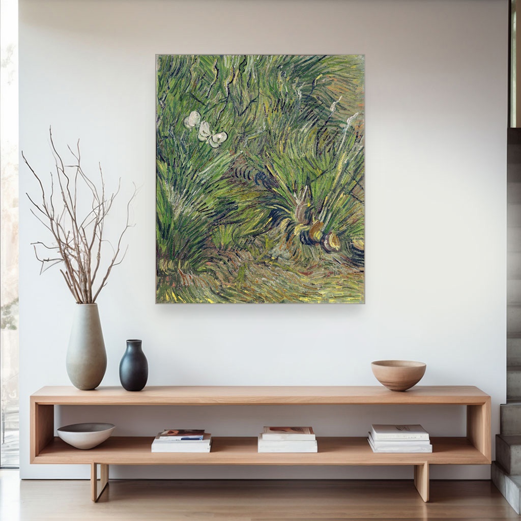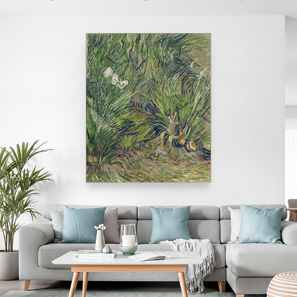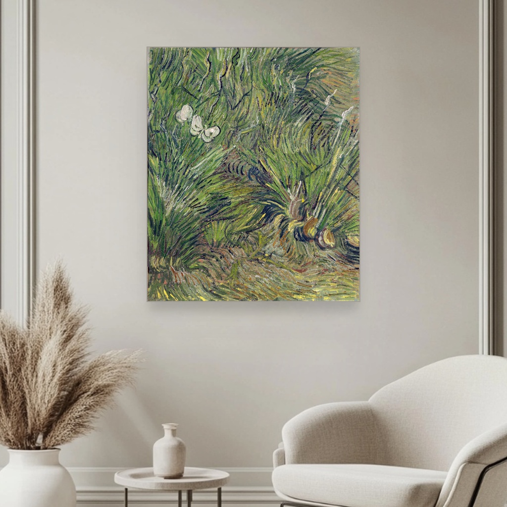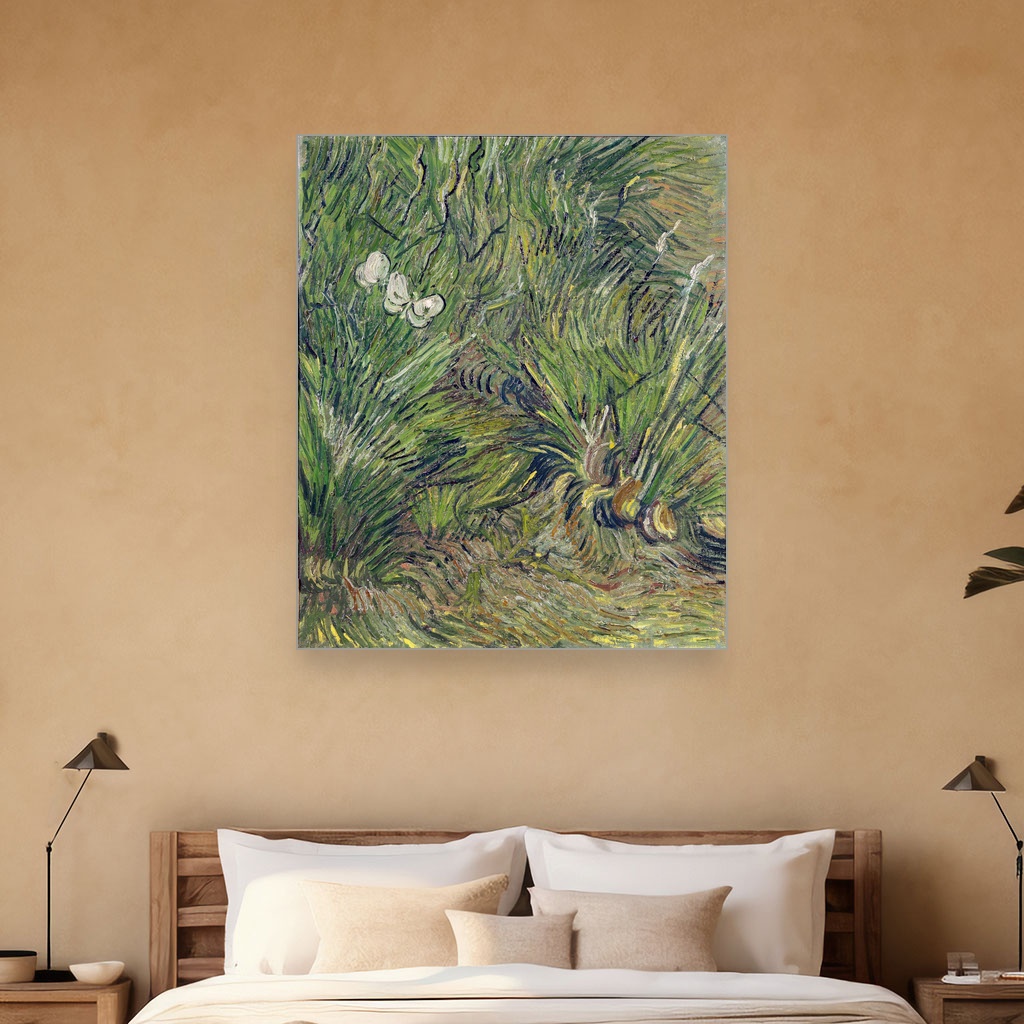 Van Gogova tehnika oslikavanja kroz gustu, dinamičnu teksturu i bogatu paletu boja oživljava svaki detalj vrta ispunjenog nežnim leptirima, što ovu umetničku reprodukciju na platnu čini posebno privlačnom.