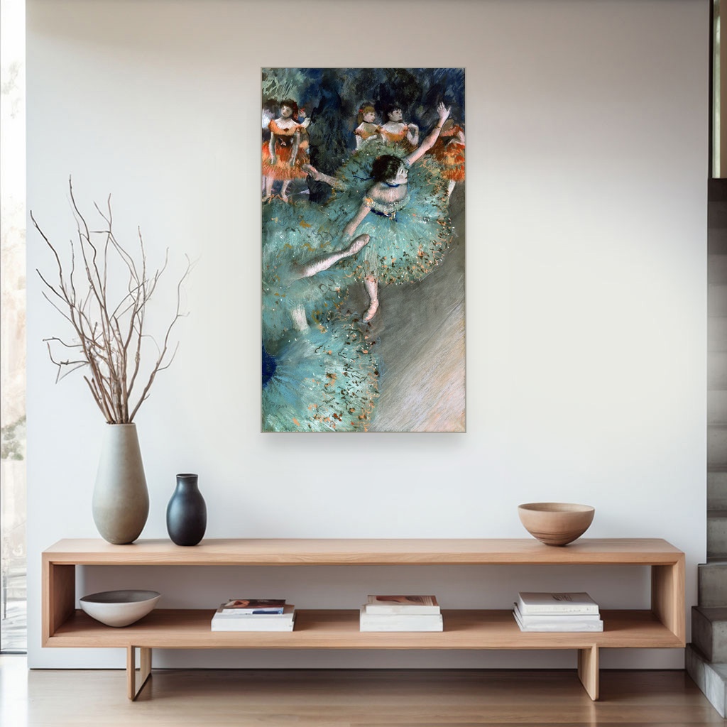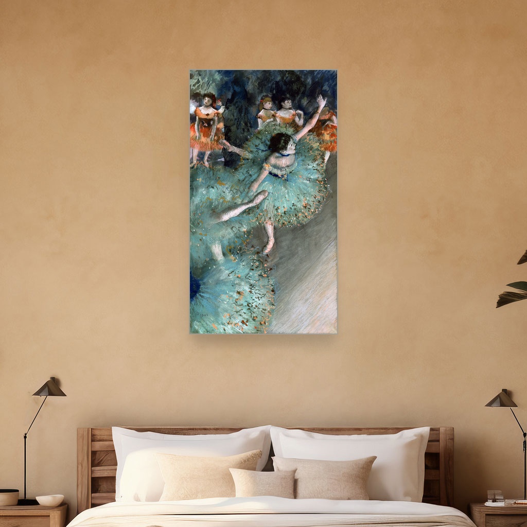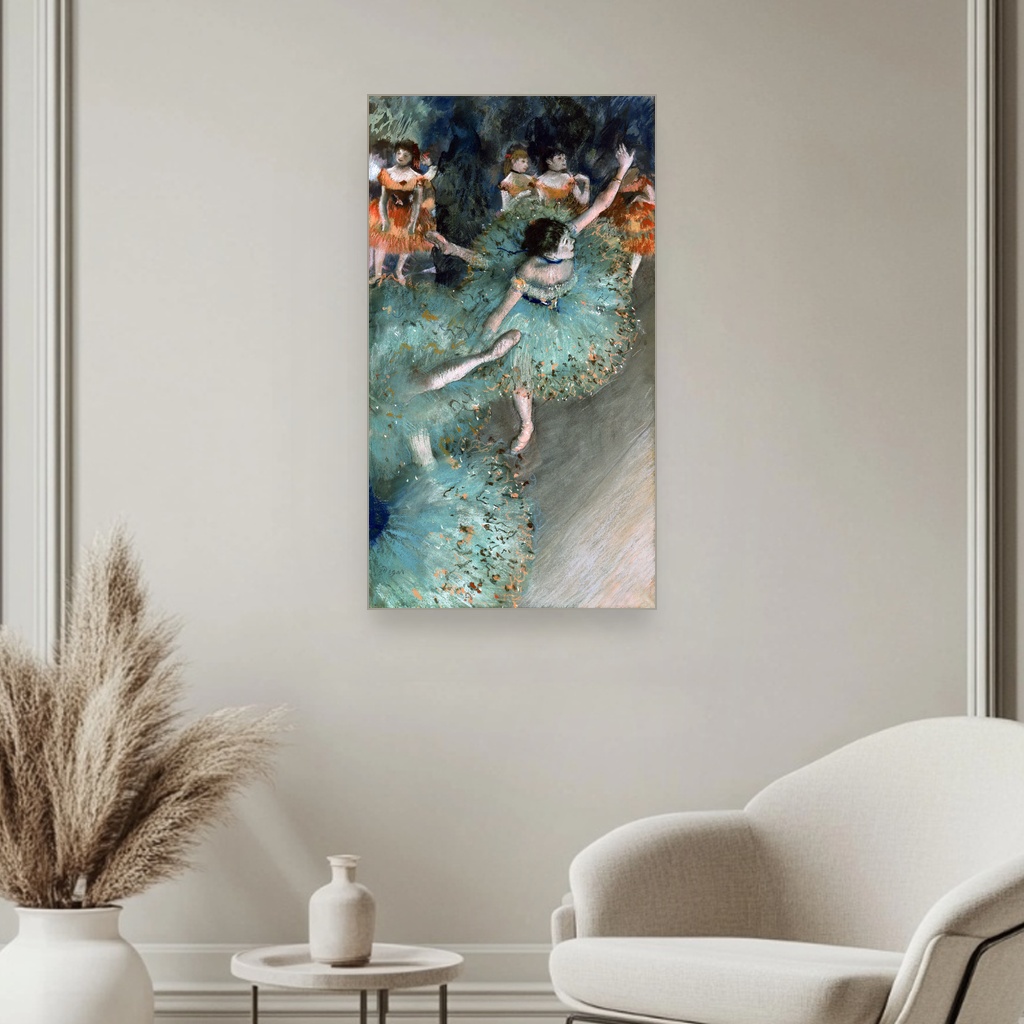 Vrtoglava plesačica u zelenom, Edgar Degas, Swaying Dancer, slika na platnu donosi nam jedan od najprepoznatljivijih prizora iz sveta baleta, uhvaćen kroz oštar ali nežan pogled velikog majstora impresionizma.