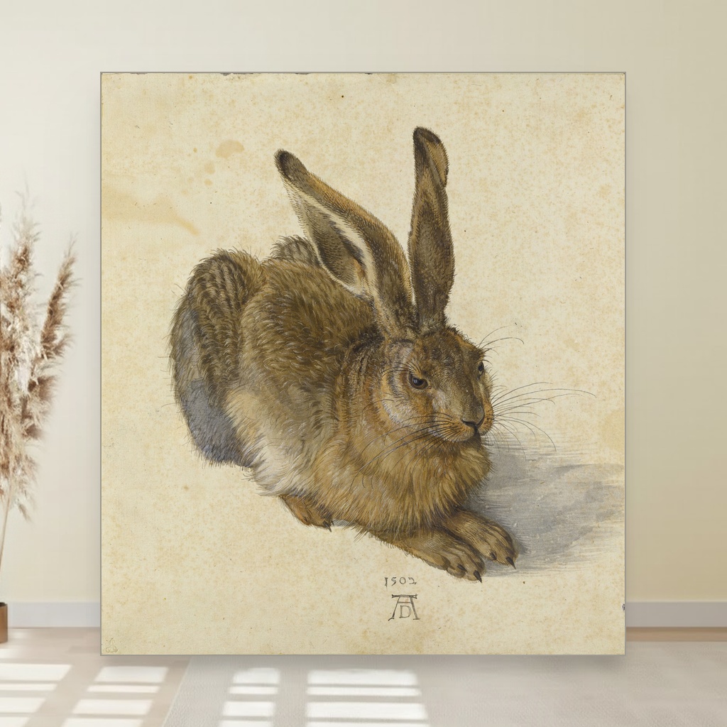 Reprodukcija slike na platnu verno prenosi svaku dlačicu i nijansu krzna zeca, što je simbol njegove posvećenosti prirodi i tehničkoj preciznosti.