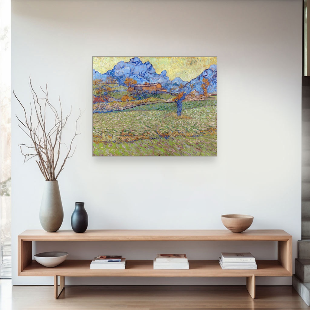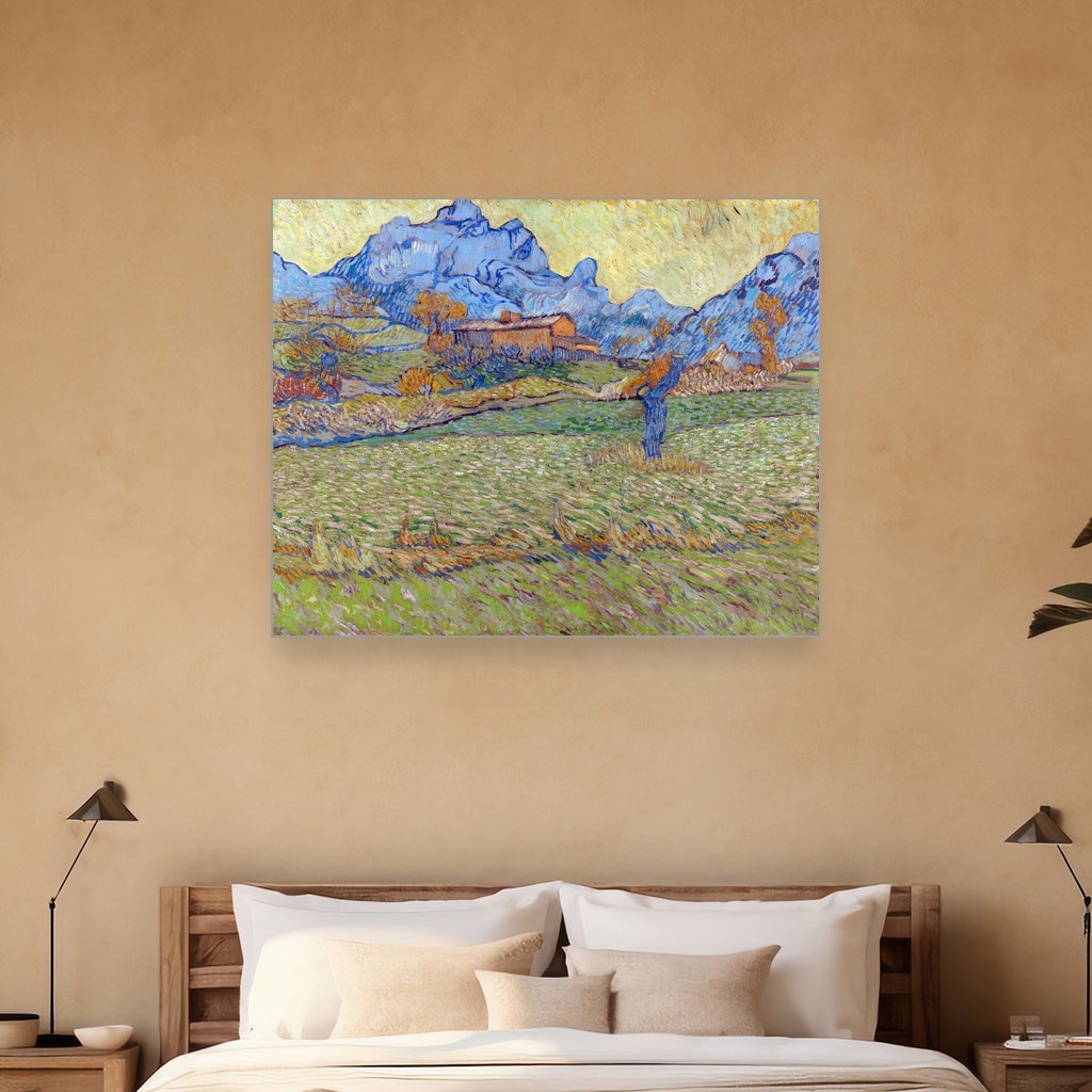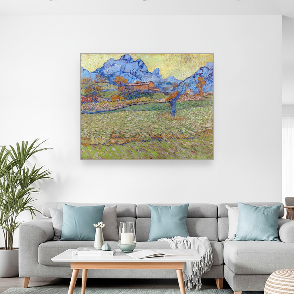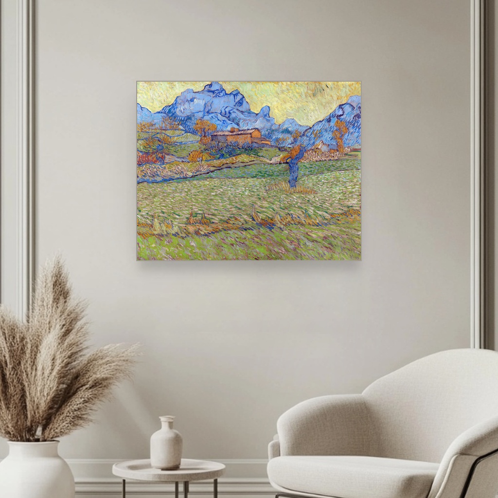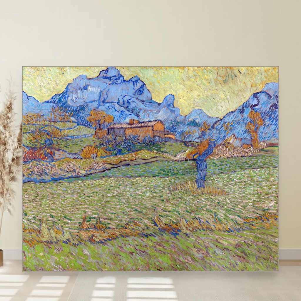 Sunčani zraci prodiru kroz zlatna polja žita, dok planinski pejzaž pruža osećaj dubine i mira. Ova slika savršeno će oplemeniti dnevni boravak ili radni kutak, donoseći toplinu i inspiraciju svakom pogledu. Vernost originalu Vincenta van Gogha čini ovu reprodukciju dragocenom za sve ljubitelje umetnosti koji žele da unesu duh prirode u svoj dom.