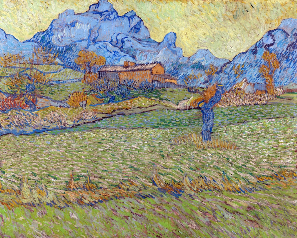 Ovo delo nastalo je u periodu kada je Van Gogh istraživao duboke veze čoveka i prirode, koristeći gustu, dinamičnu tehniku poteza koja oživljava svaki klas žita pod planinskim nebom.
