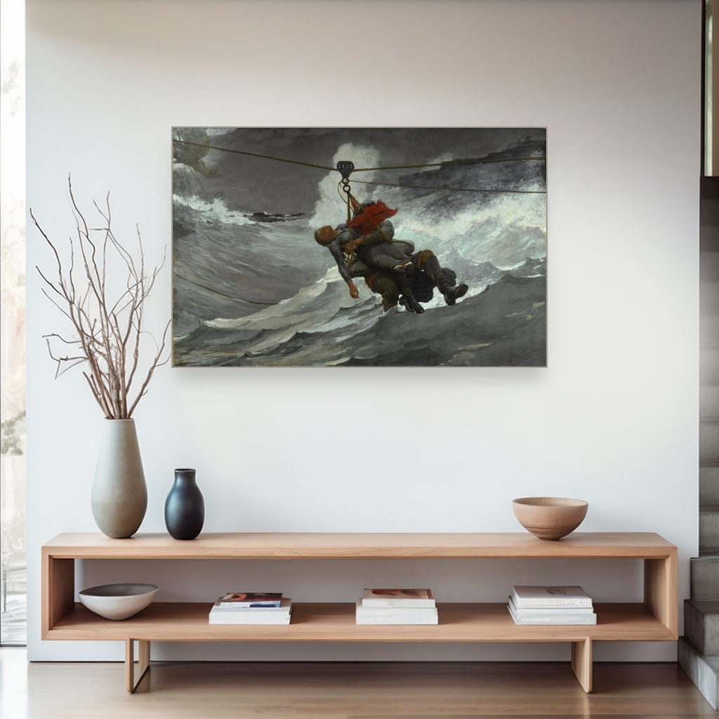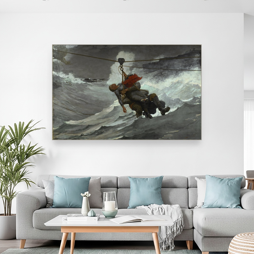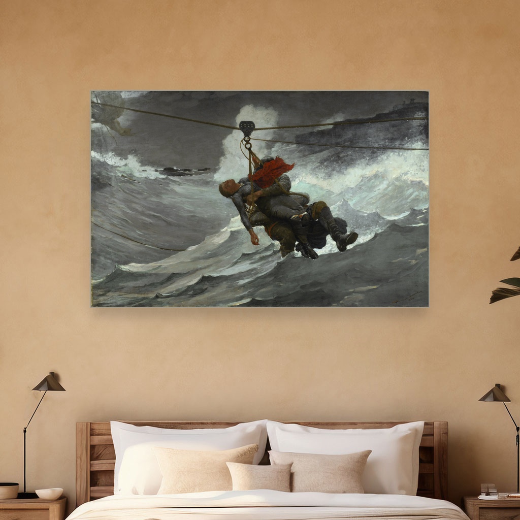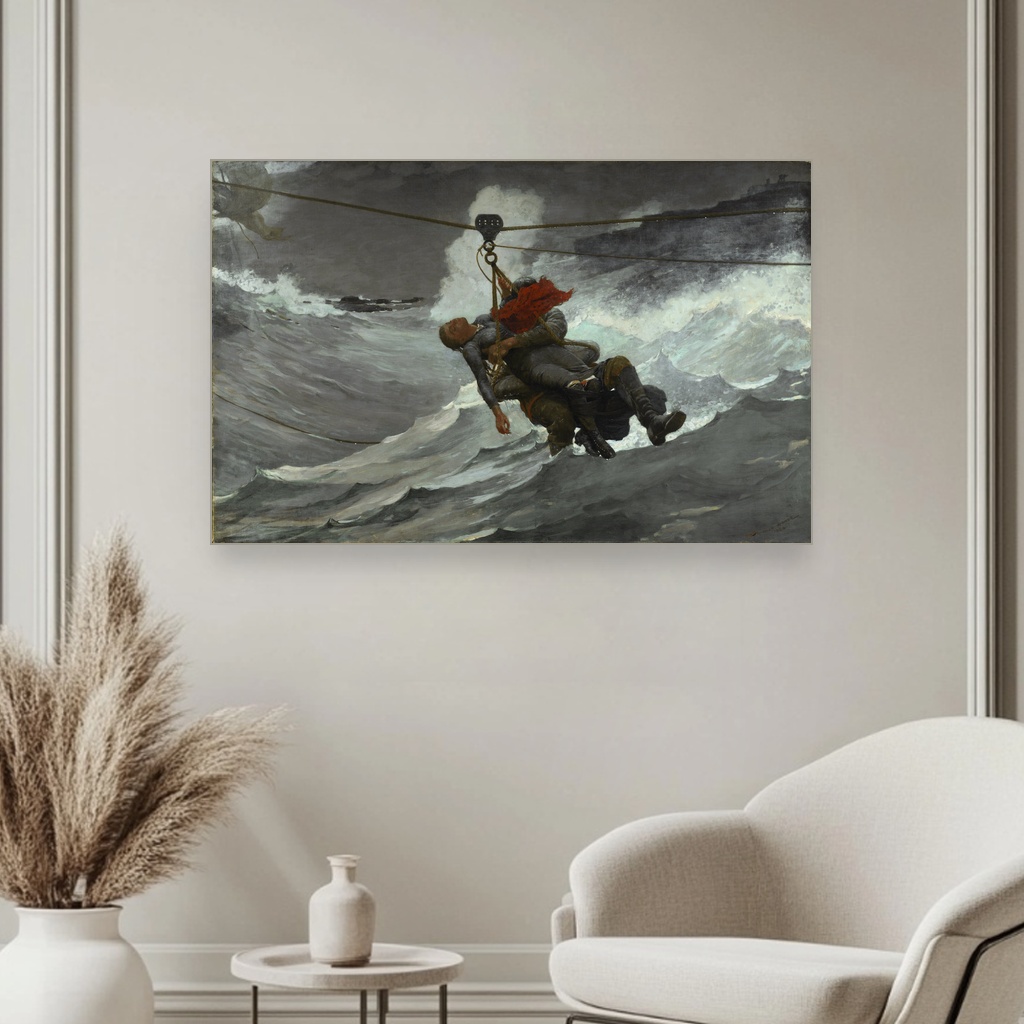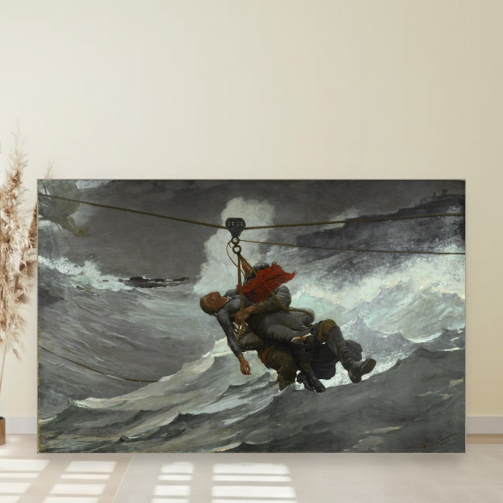 Dinamična scena spasavanja na olujnom moru donosi energiju i napetost u svaki prostor. Ova reprodukcija Winslow Homera savršeno će se uklopiti u dnevnu sobu ili radni kutak, gde će podsećati na snagu i hrabrost u trenucima iskušenja. Vrhunski detalji i izražajna paleta boja čine ovu sliku na platnu istinskim umetničkim doživljajem.