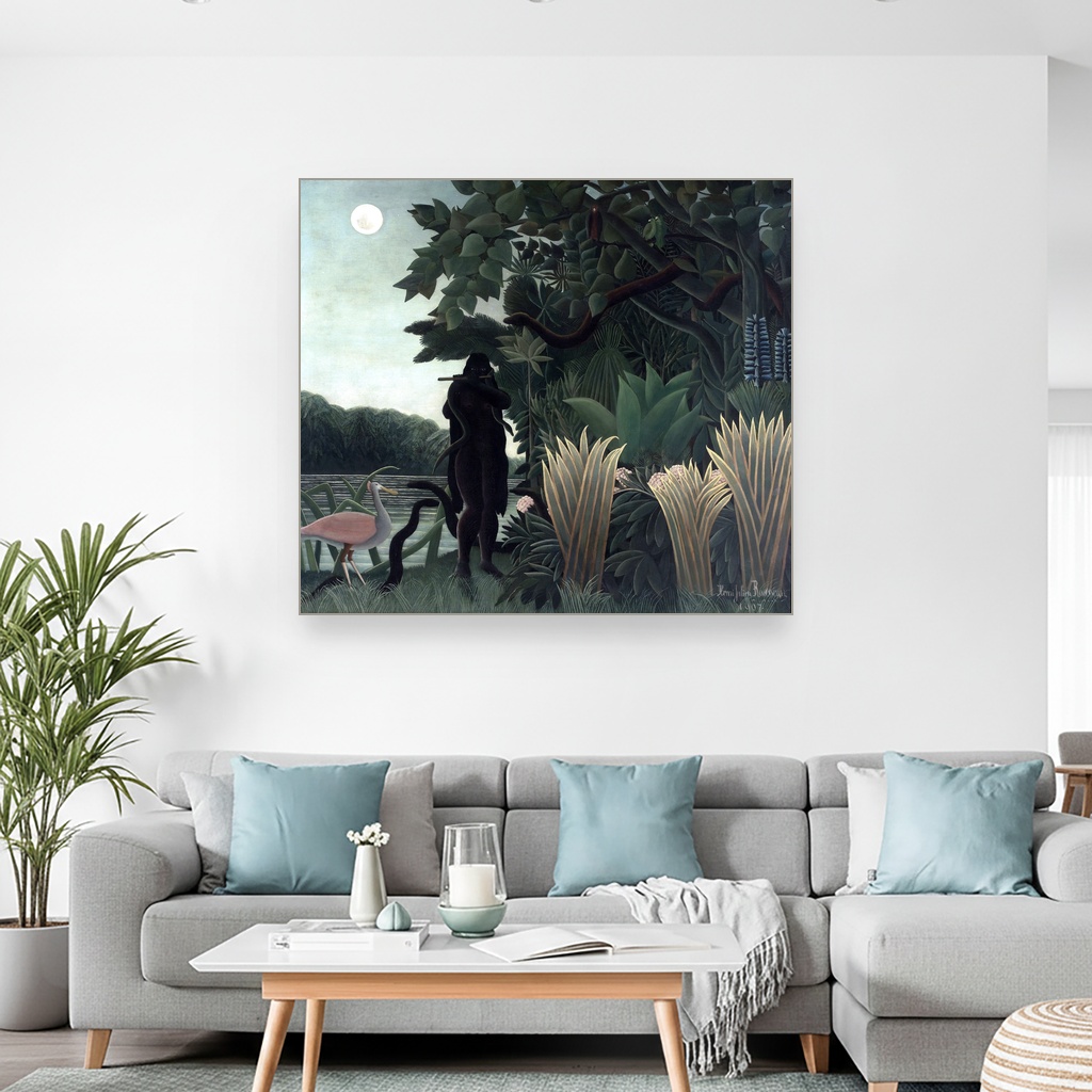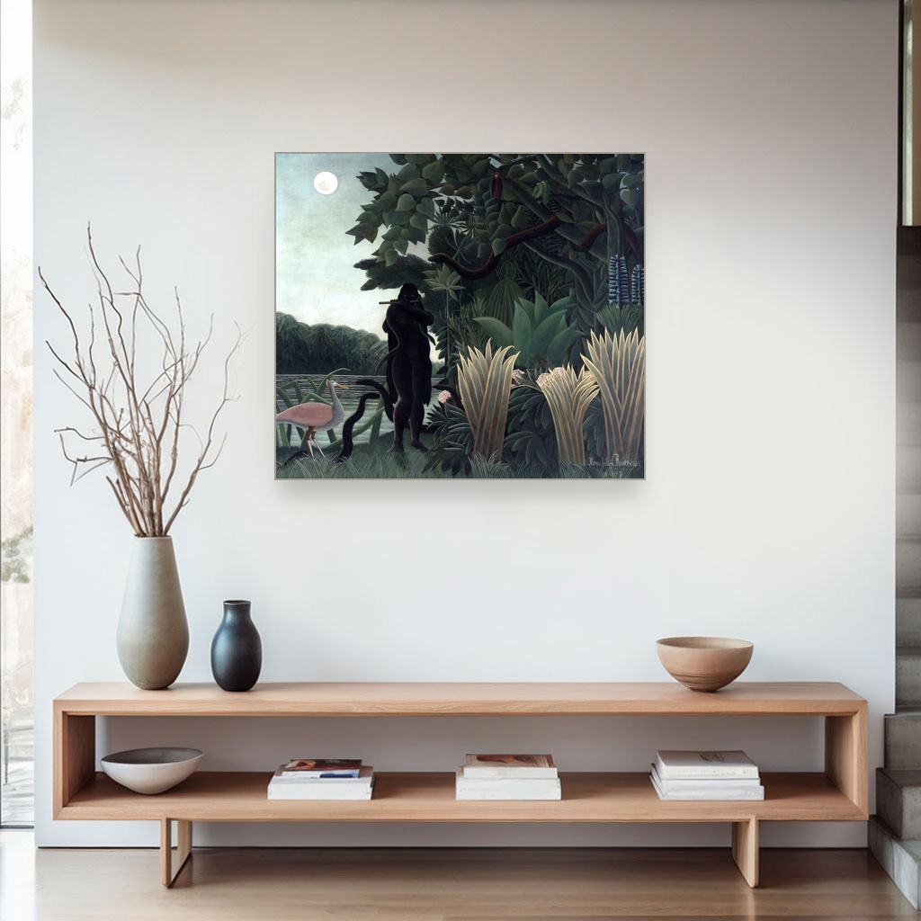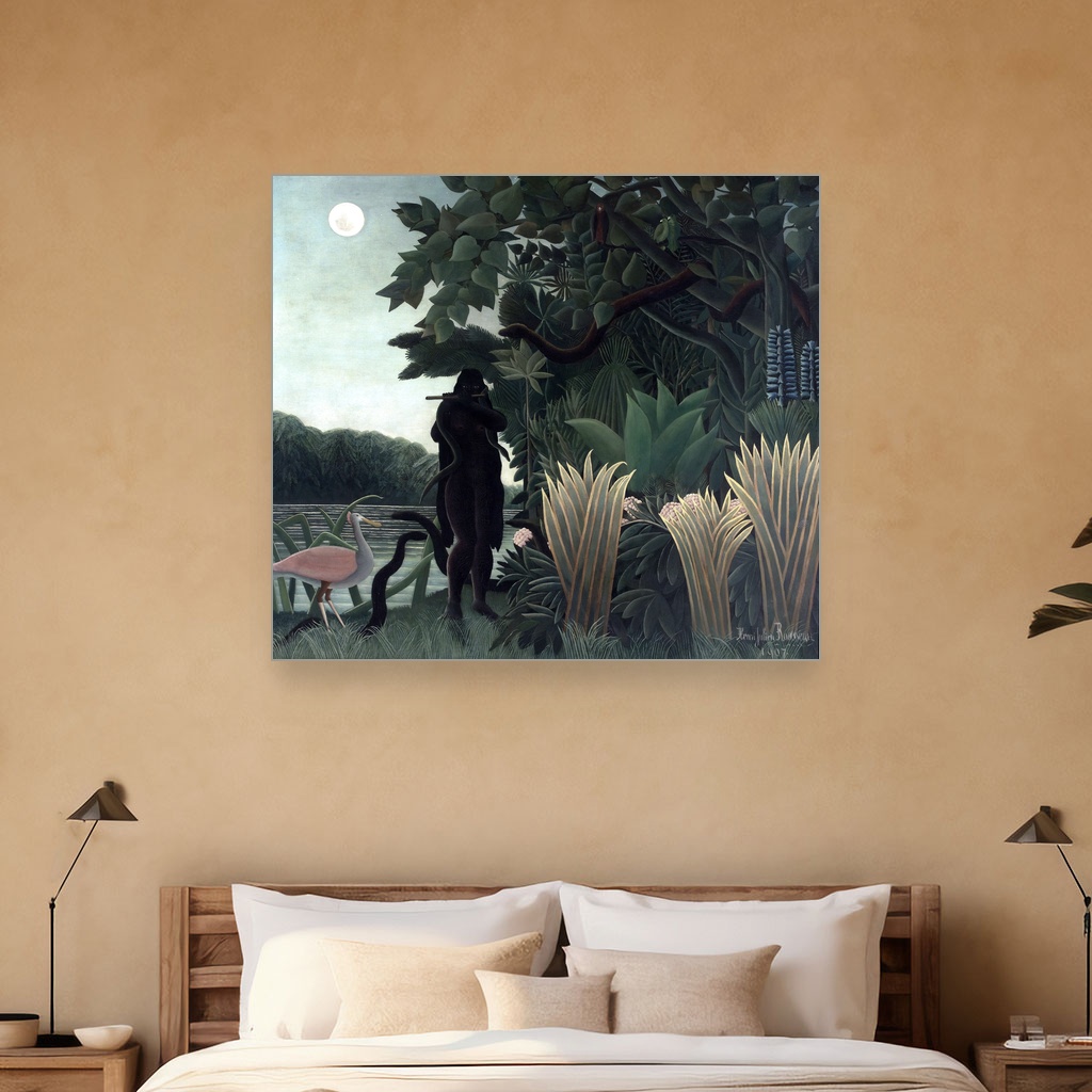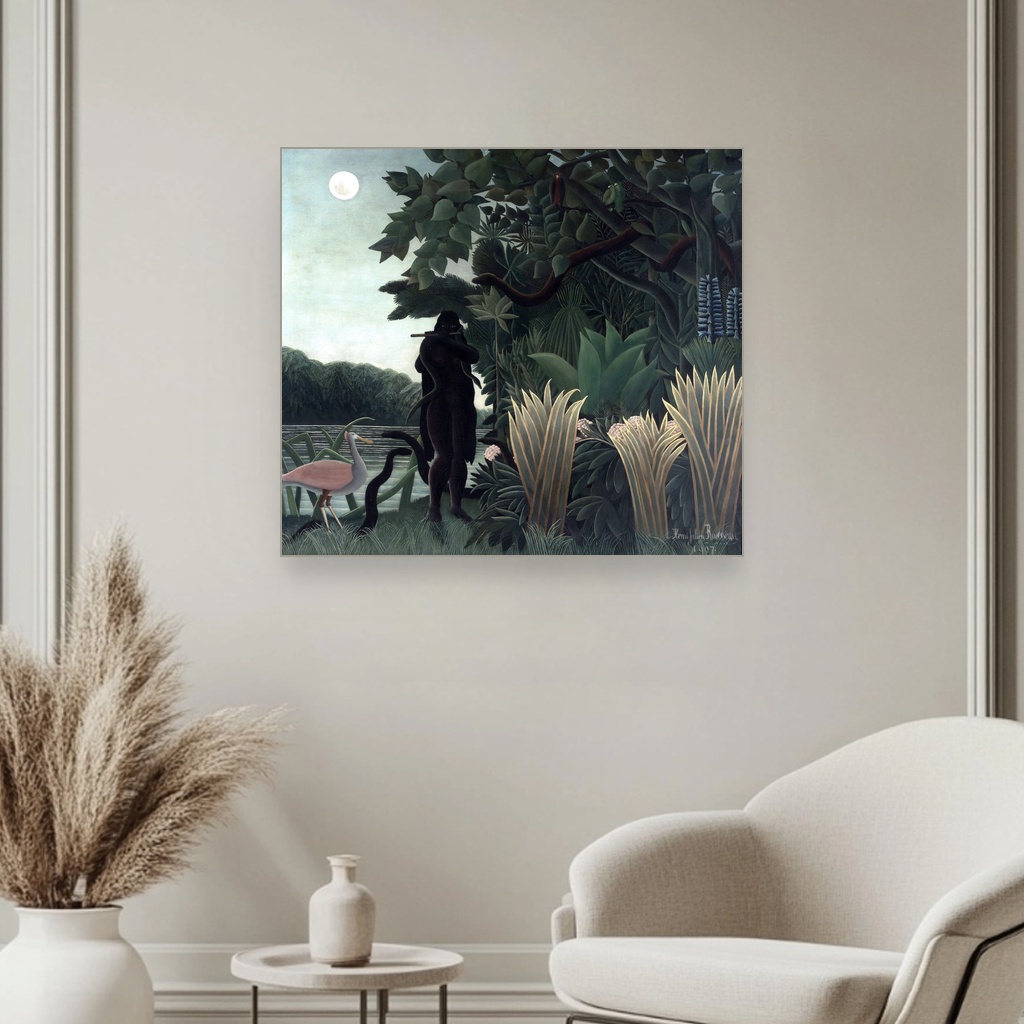Njegova Henri Rousseau reprodukcija na platnu donosi bogatstvo boja i detalja koji oživljavaju scenu zmijara okruženog bujnom vegetacijom, gde se skladno prepliću snaga i nežnost prirode.